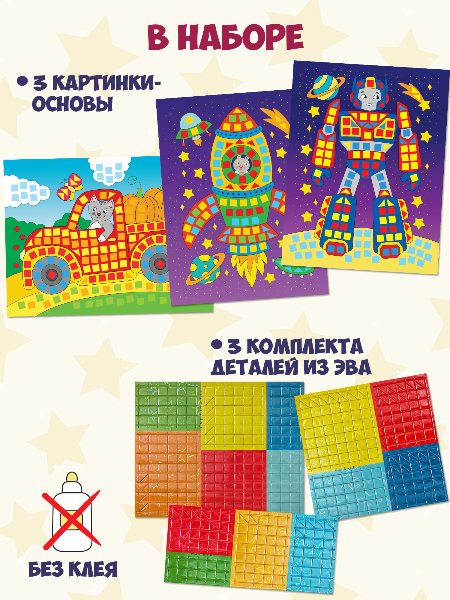 В комплекте: 3 картинки-основы, 3 набора деталей.