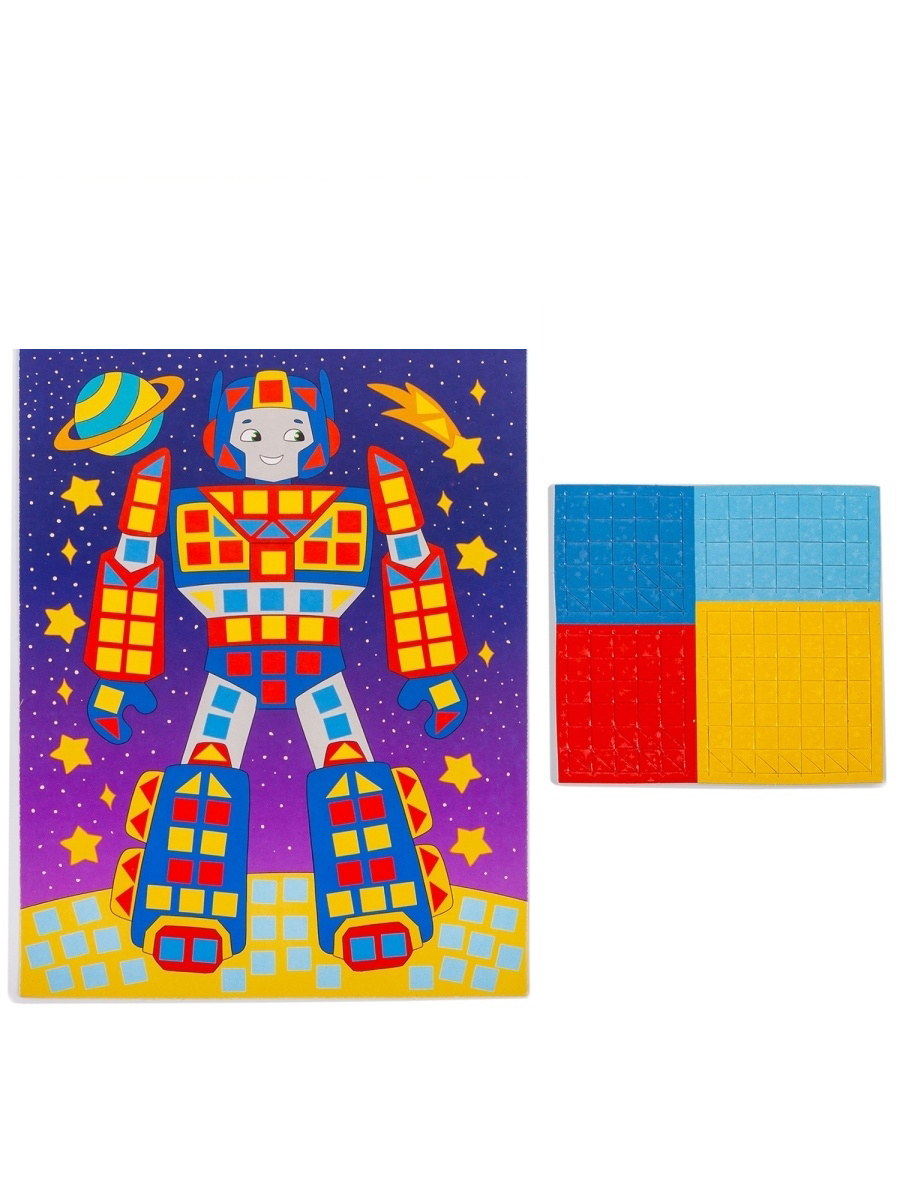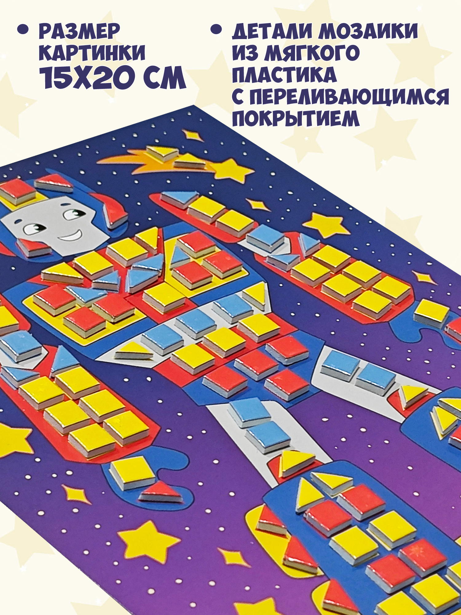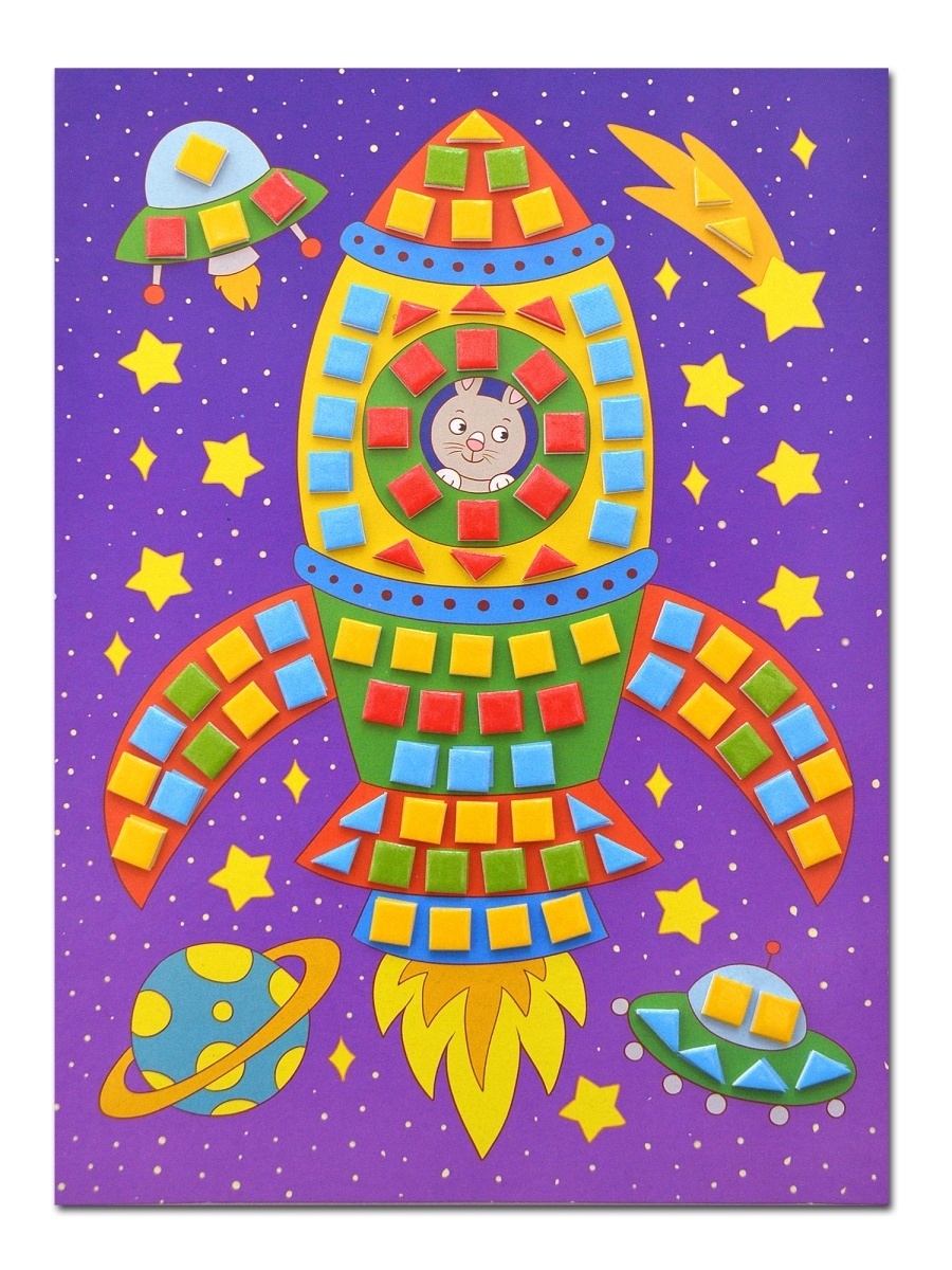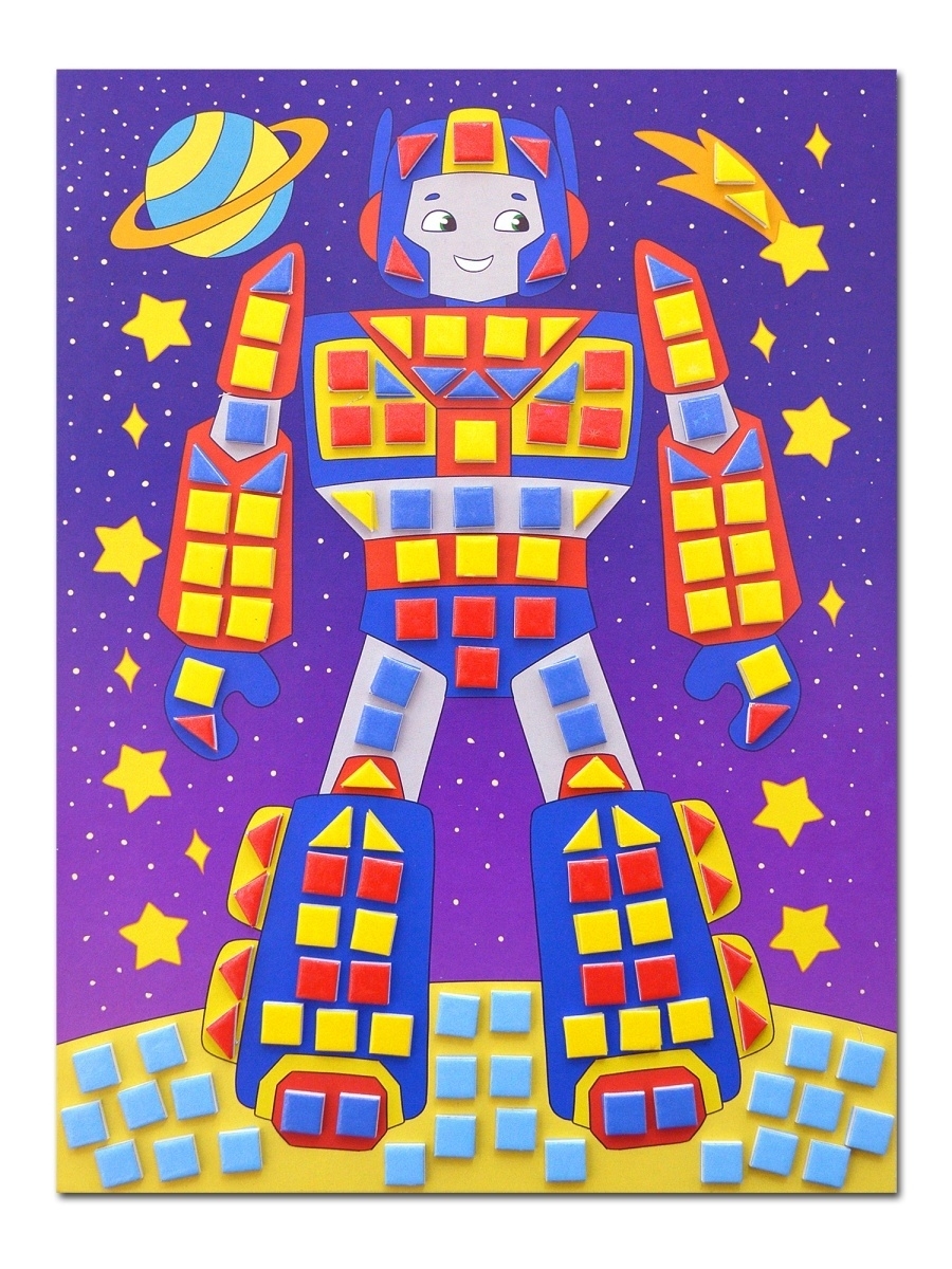 Детали мозаики выполнены в виде квадратиков и треугольников из мягкого пластика ЭВА с переливающимся декоративным покрытием. Размер одного элемента – 7х7 мм . Работать с аппликацией очень просто – на основе уже отмечены места для приклеивания деталей, необходимо просто подобрать подходящий по цвету элемент, снять его с общего блока и затем наклеить в нужное место.