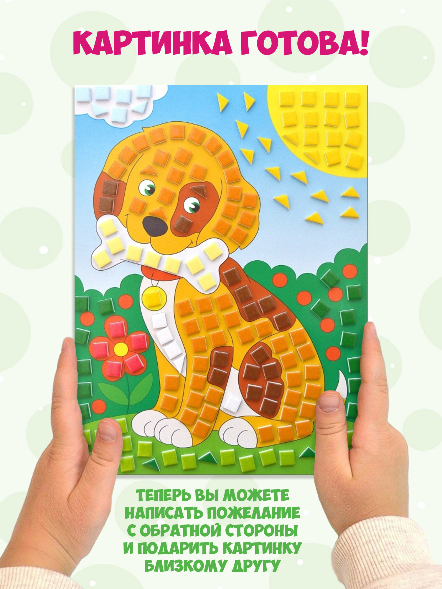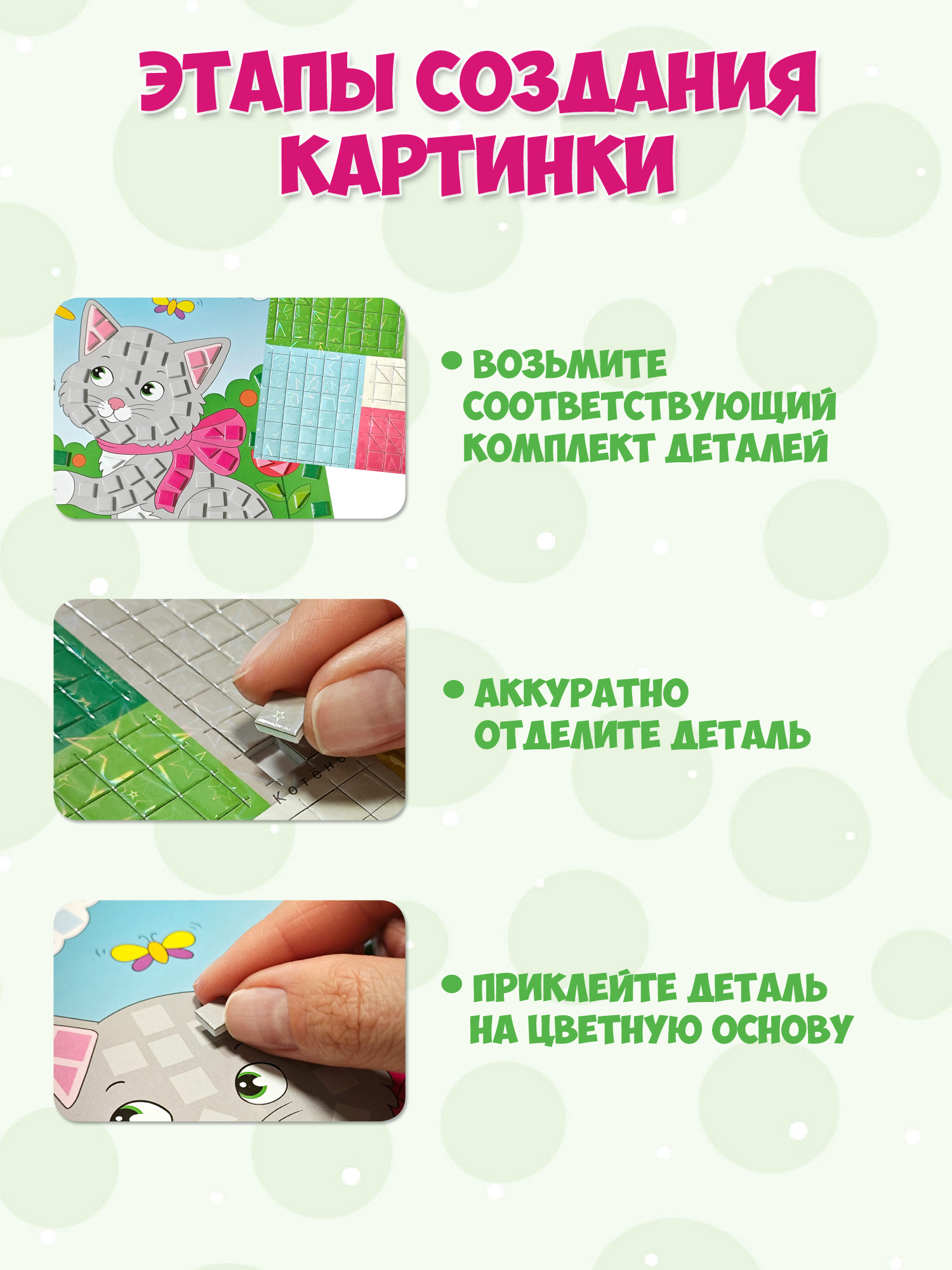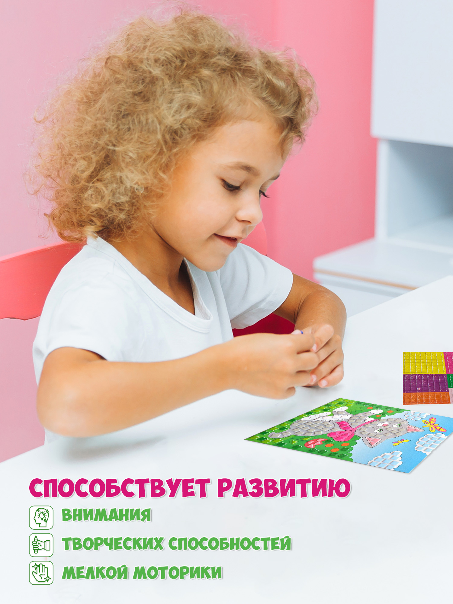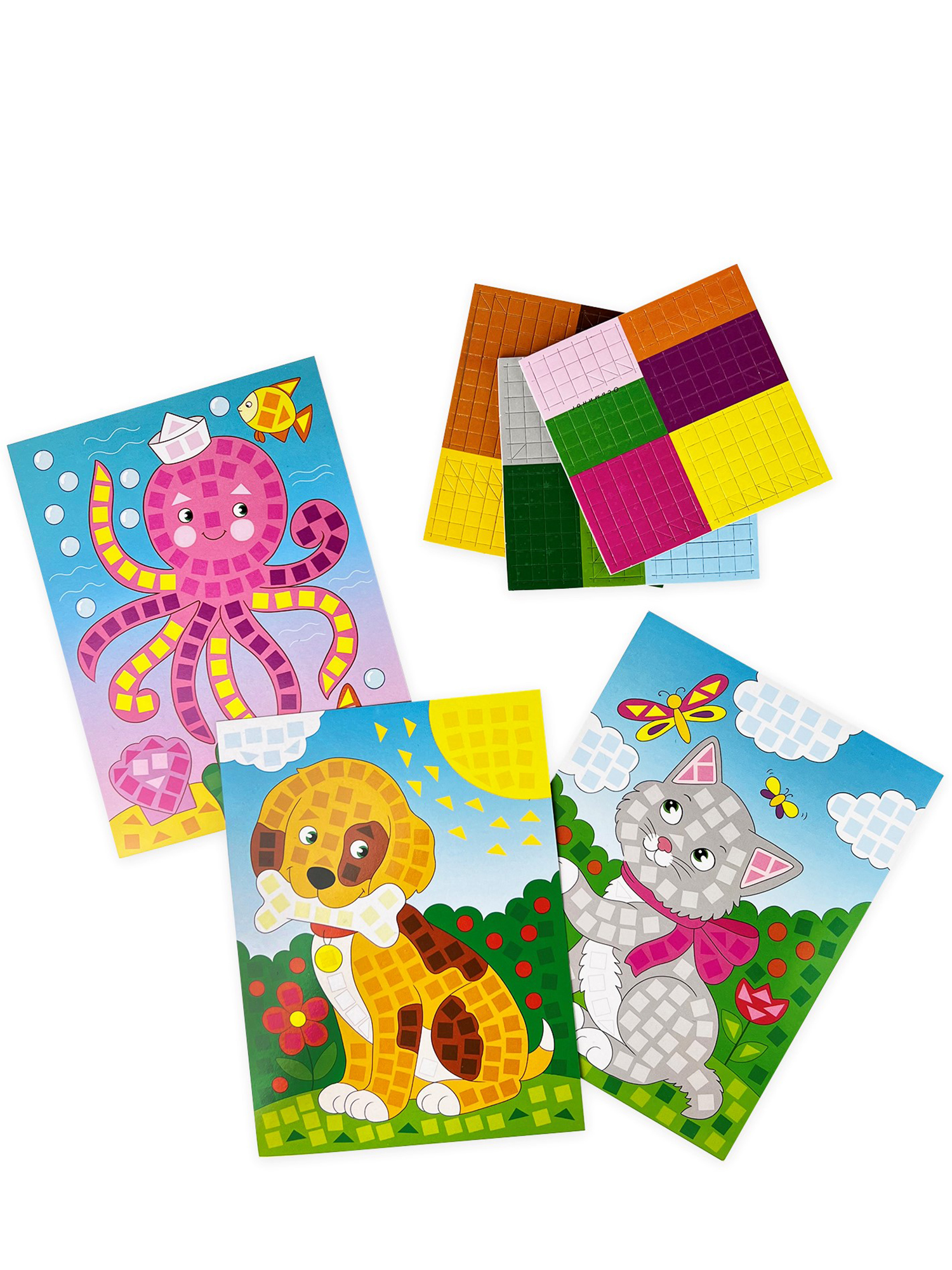 Разноцветная мозаика – это оригинальная и яркая объёмная аппликация для детей. В наборе для творчества есть все необходимое - 3 аппликации и 3 набора деталей на самоклеящейся основе. Детали мозаики выполнены в виде квадратиков и треугольников из мягкого пластика ЭВА с переливающимся декоративным покрытием. Размер одного элемента – 7х7 мм .