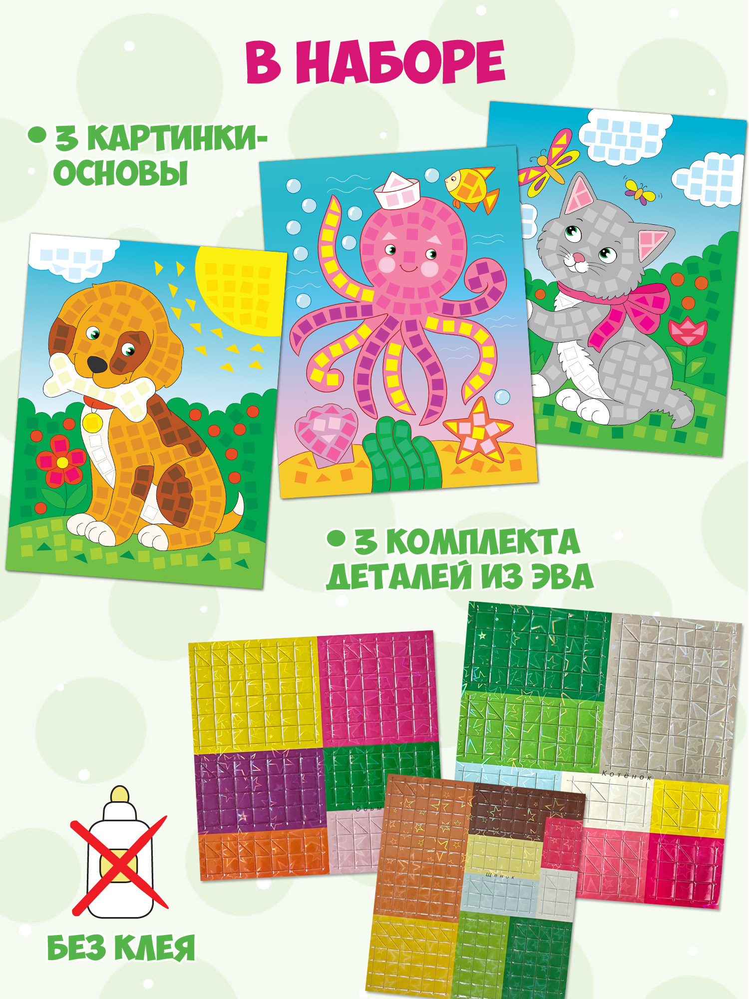 В комплекте: 3 картинки-основы, 3 набора деталей.