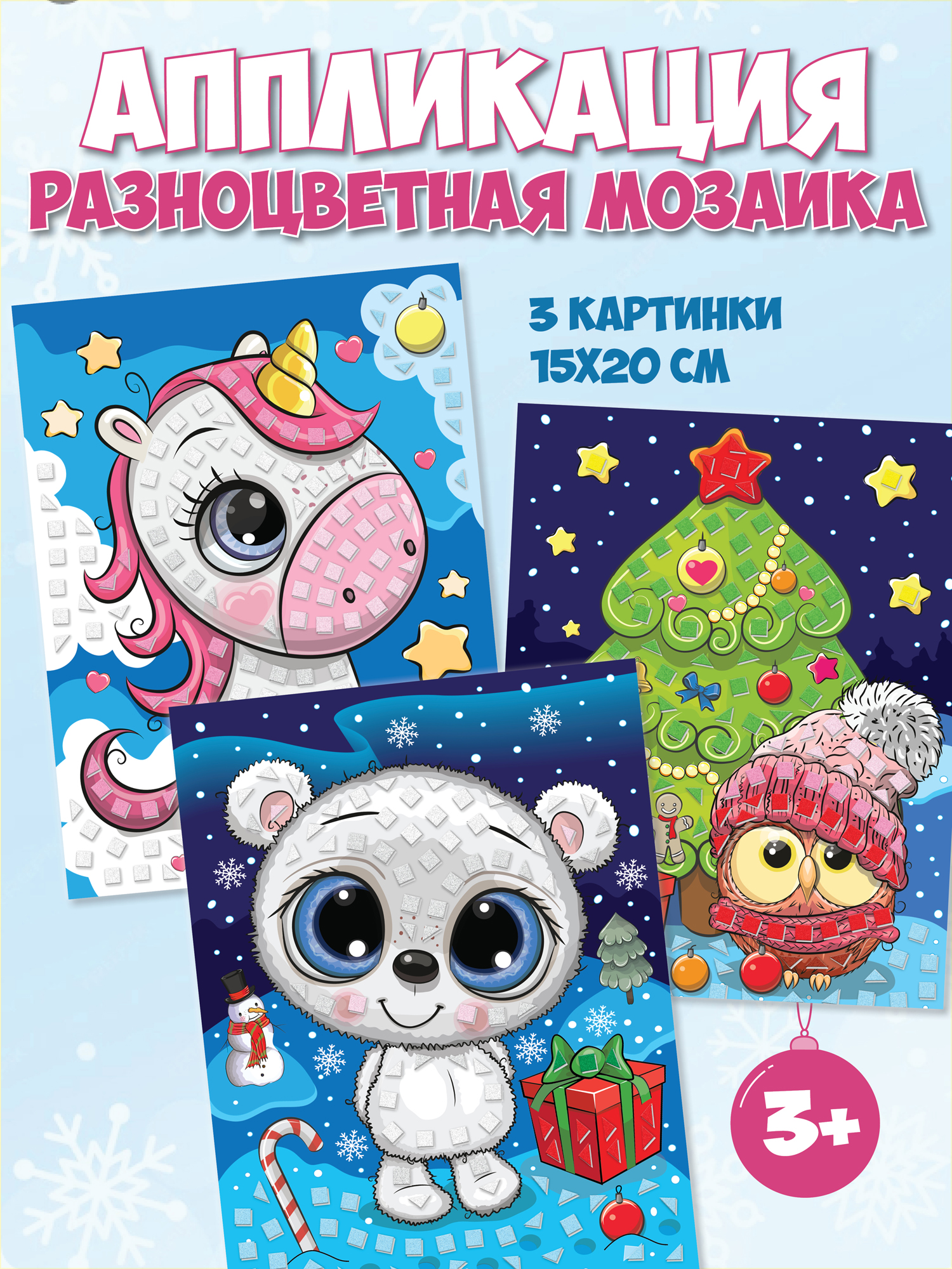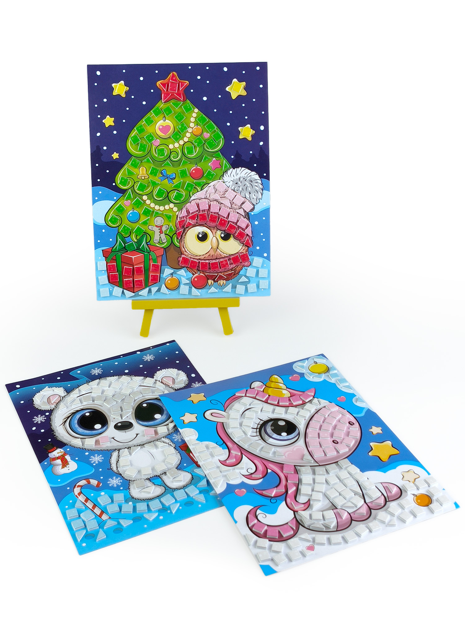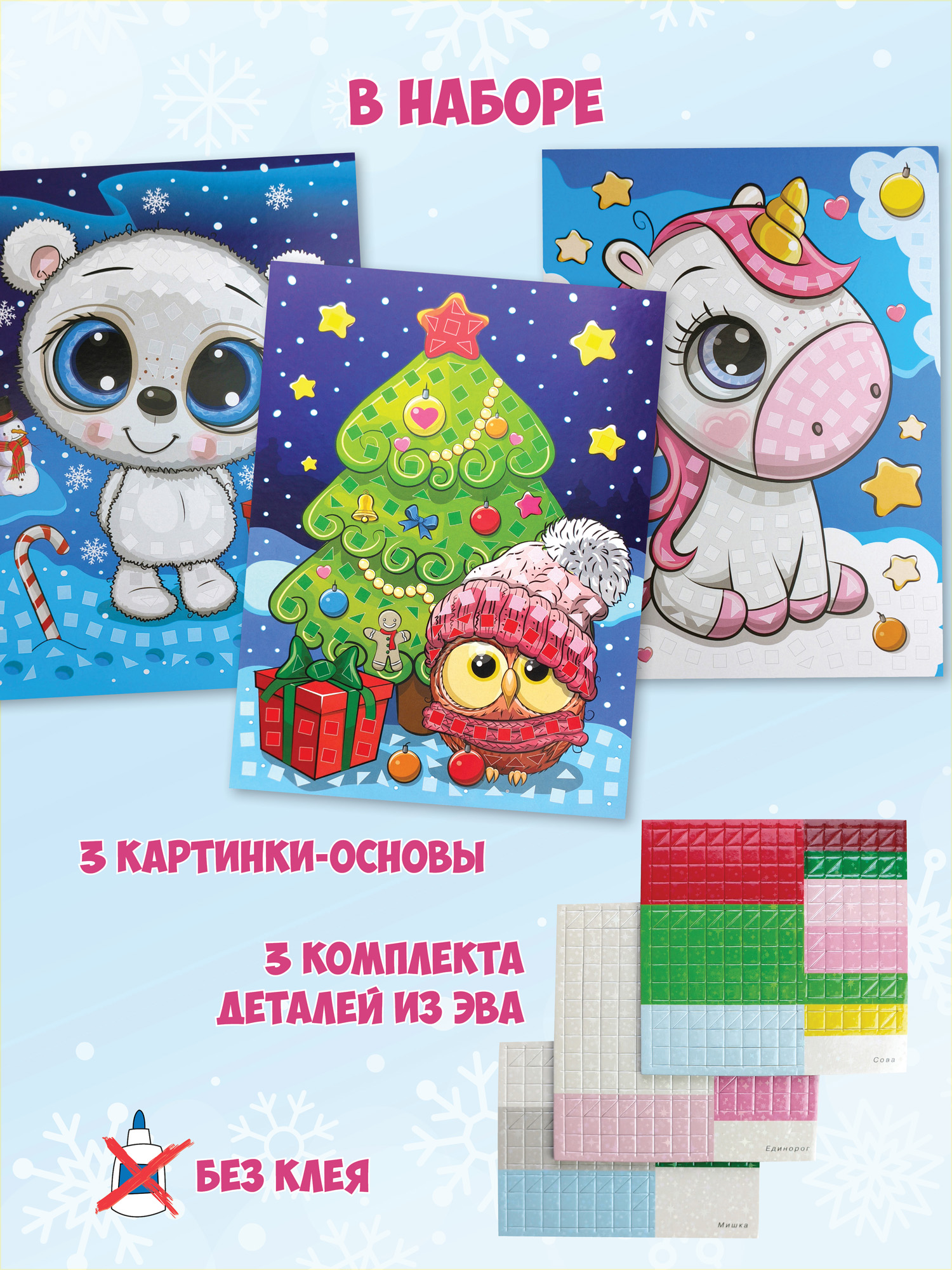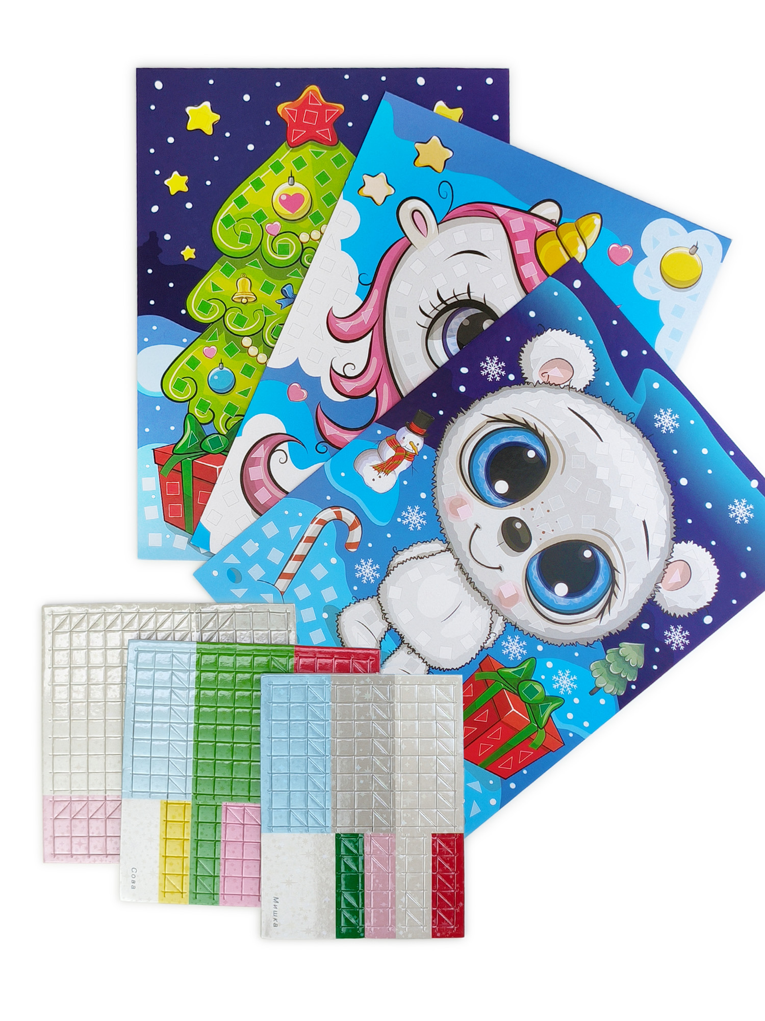 - 3 картонные основы с мишкой, единорогом и маленьким совёнком;