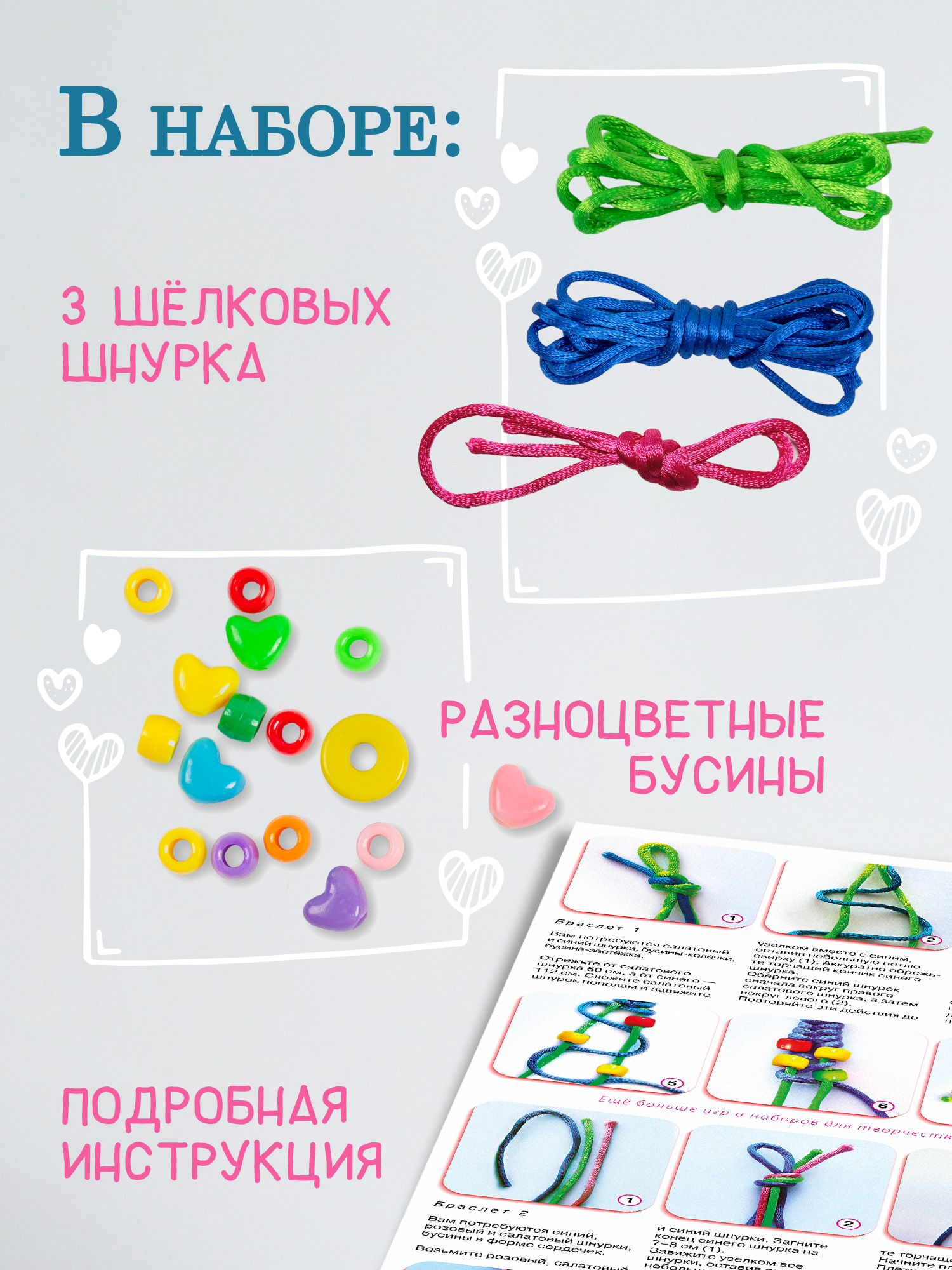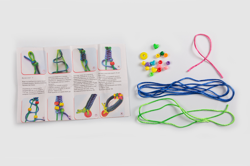 Всё, что нужно для создания двух стильных браслетов вы найдёте в наборе: шёлковые шнурки, яркие разноцветные бусинки, подробную инструкцию. Готовые браслеты из шёлковых шнурков выглядят эффектно, стильно и необычно.