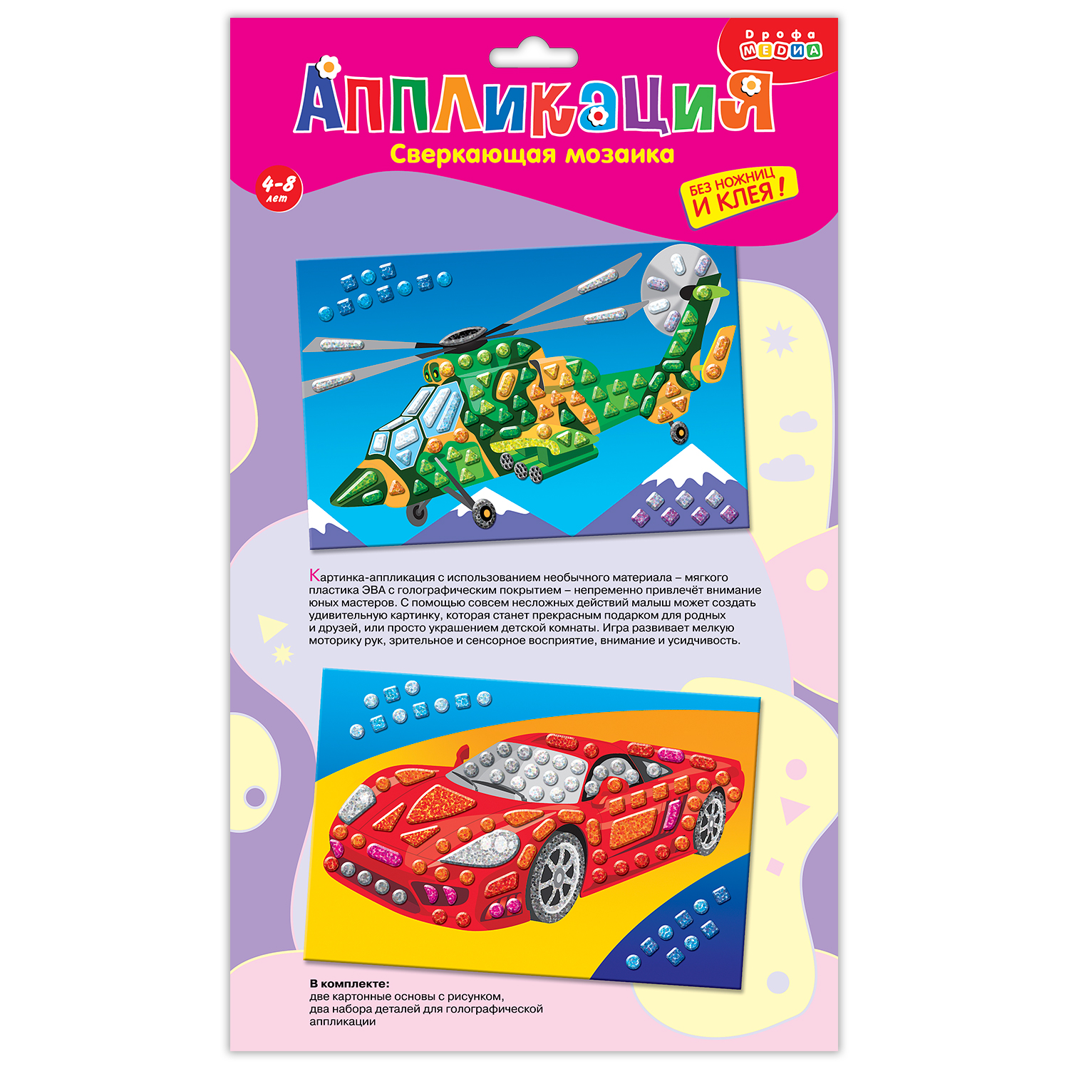 Совершенству мозаичной техники нет предела! Красочные и яркие детали мозаики разных форм выполнены из мягкого пластика ЭВА и покрыты сверкающей голографической плёнкой. Неповторимое сияние и блеск придают изображению дополнительное очарование. В наборе 2 картинки.