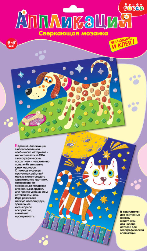 Совершенству мозаичной техники нет предела! Красочные и яркие детали мозаики разных форм выполнены из мягкого пластика ЭВА и покрыты сверкающей голографической плёнкой. Неповторимое сияние и блеск придают изображению дополнительное очарование. В наборе 2 картинки.