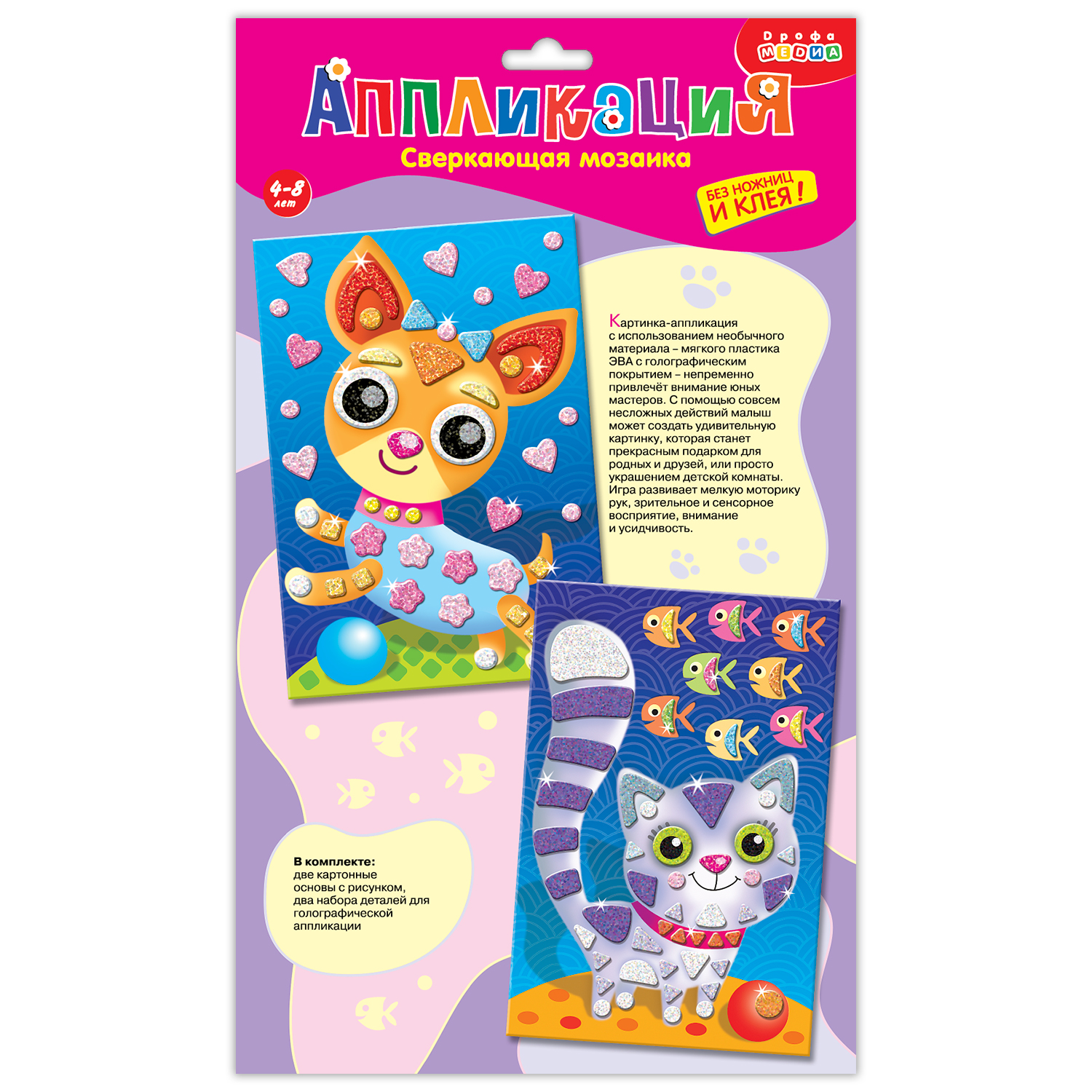 Совершенству мозаичной техники нет предела! Красочные и яркие детали мозаики разных форм выполнены из мягкого пластика ЭВА и покрыты сверкающей голографической плёнкой. Неповторимое сияние и блеск придают изображению дополнительное очарование. В наборе 2 картинки.