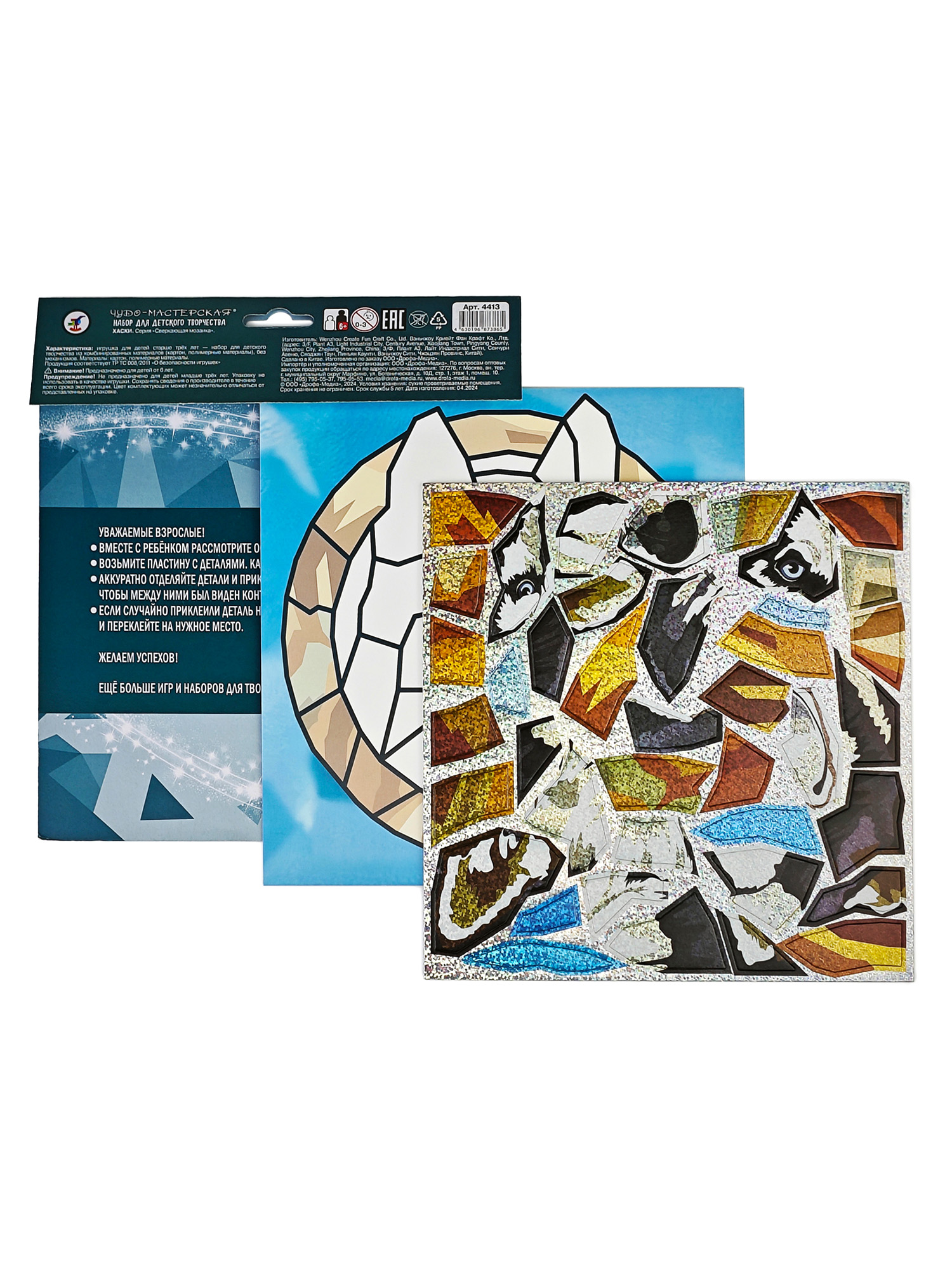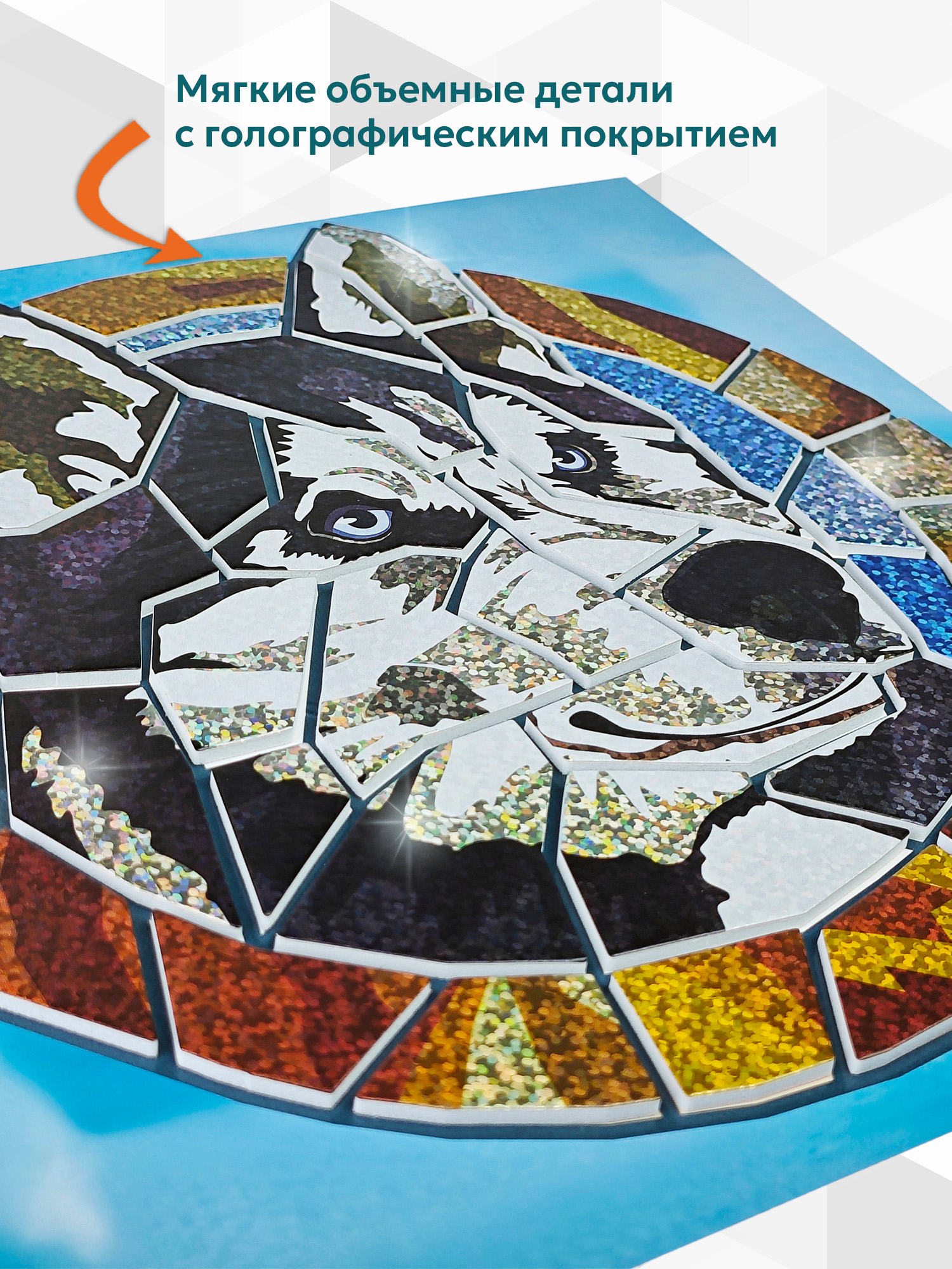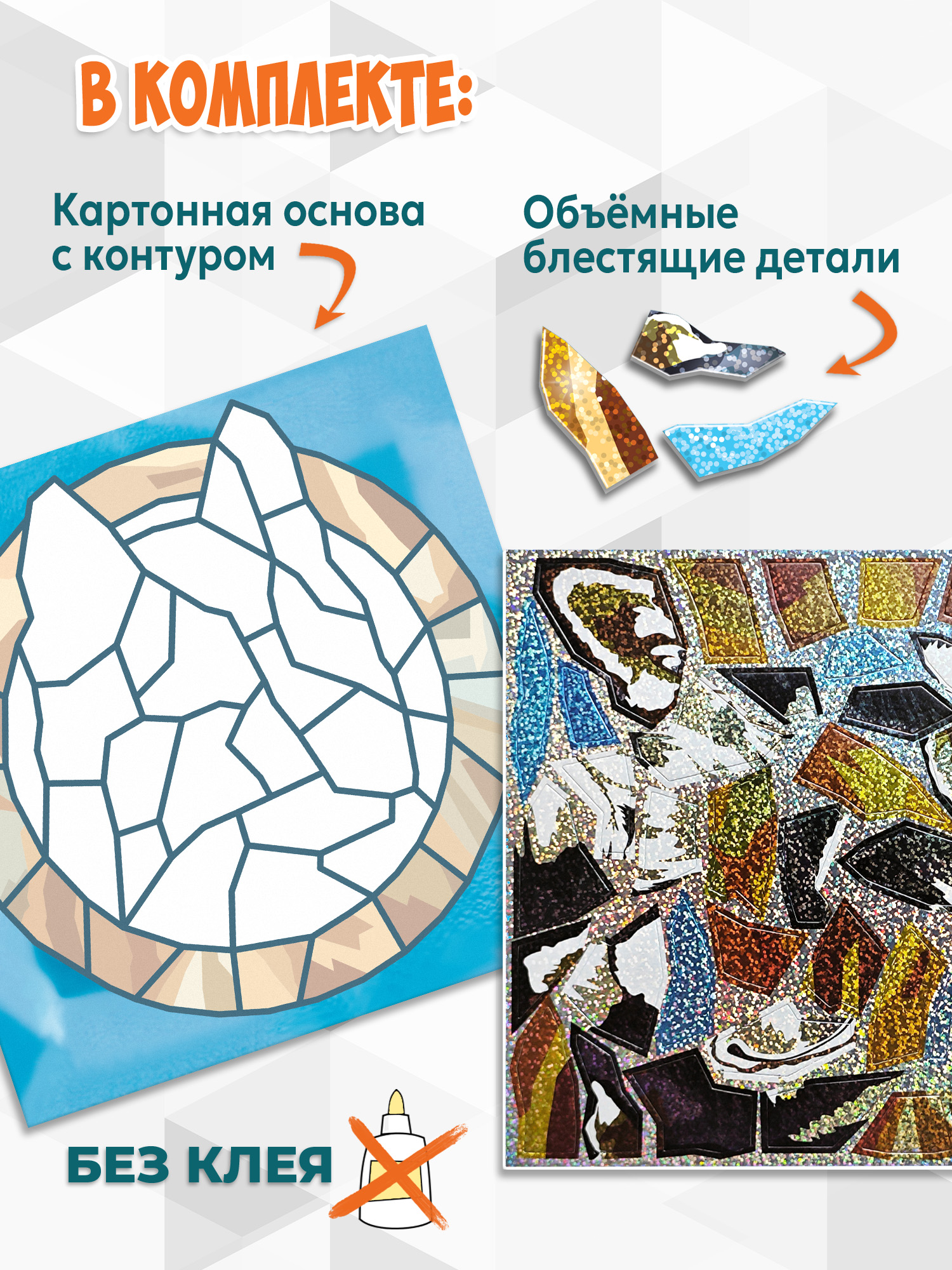 В наборе картинка-основа и пластина с мягкими объёмными деталями с голографическим покрытием. Клей и ножницы не нужны!