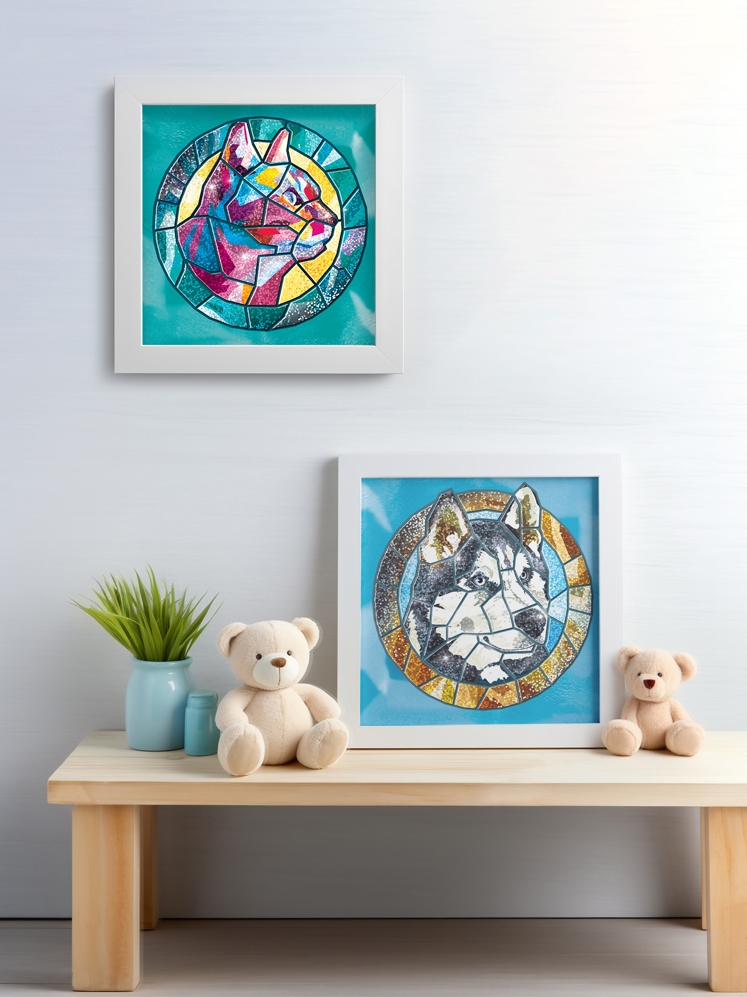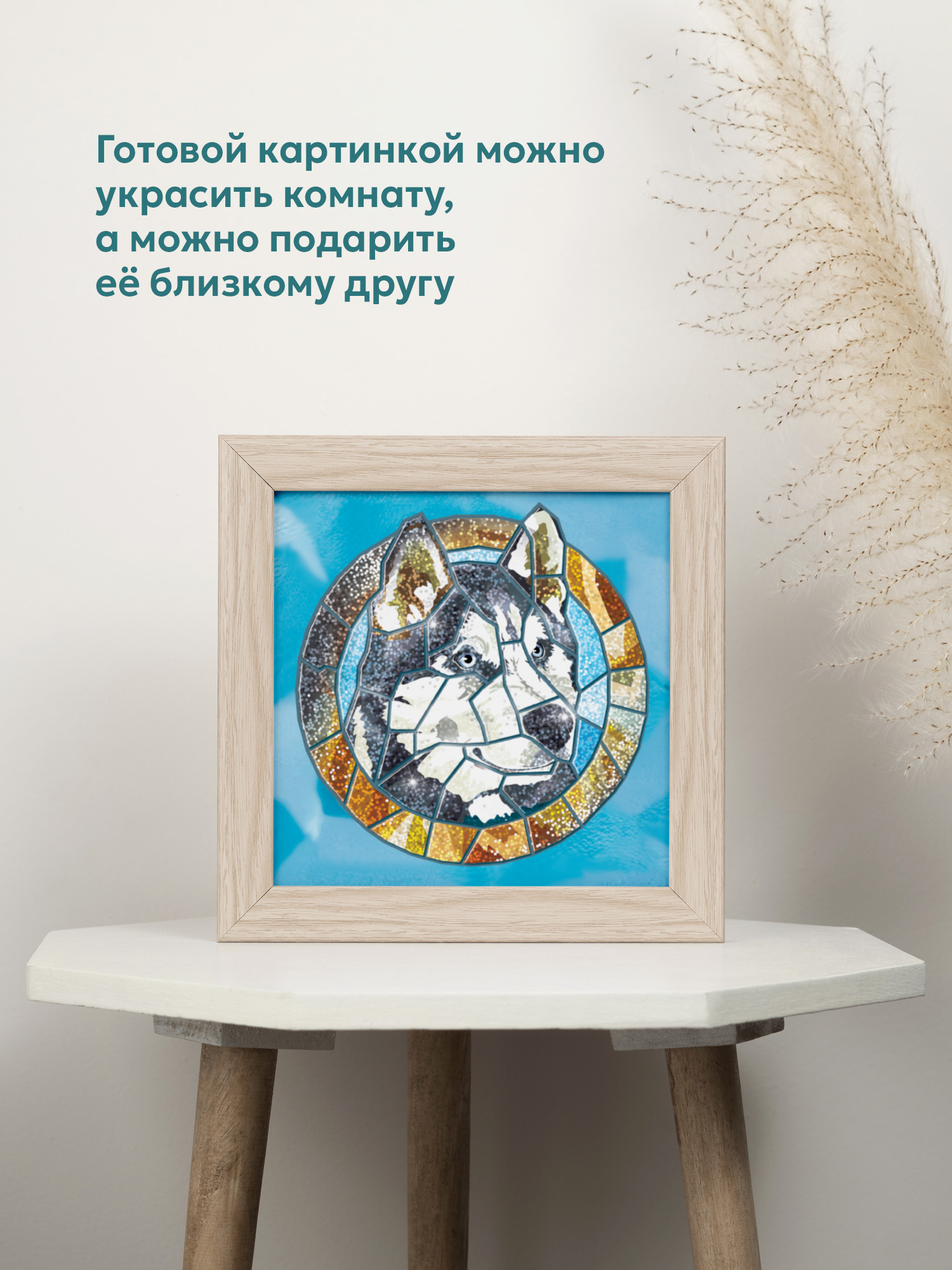 Подберите нужные элементы ориентируясь по контуру или сверяясь с образцом на упаковке, чтобы получилась переливающаяся картинка в витражном стиле.