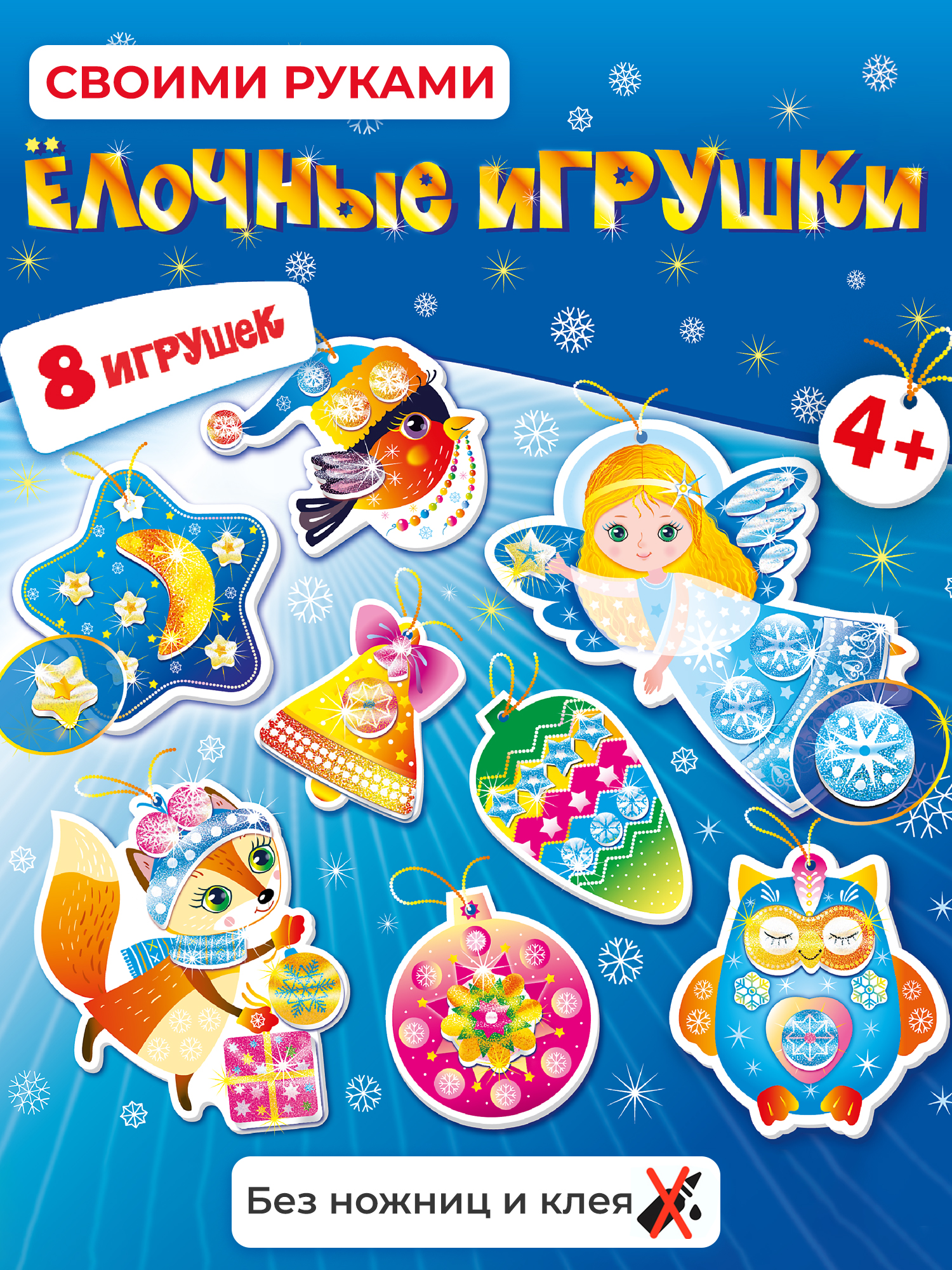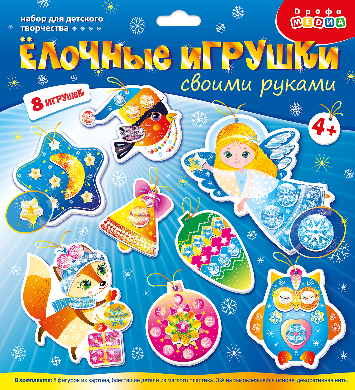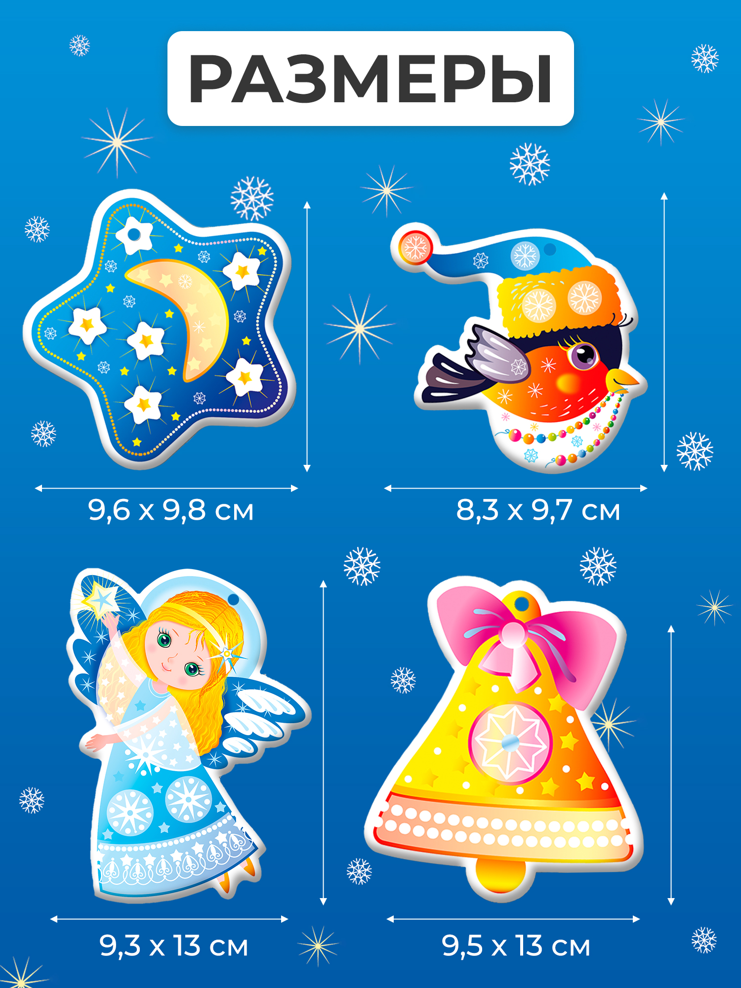 В комплекте: 8 фигурок из картона, блестящие детали из мягкого пластика ЭВА на самоклеящейся основе, декоративная нить, инструкция.