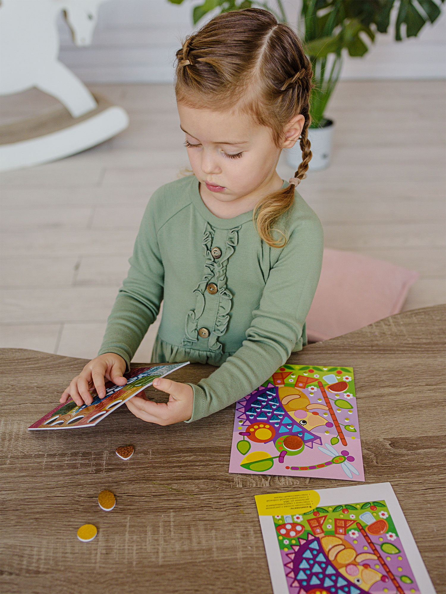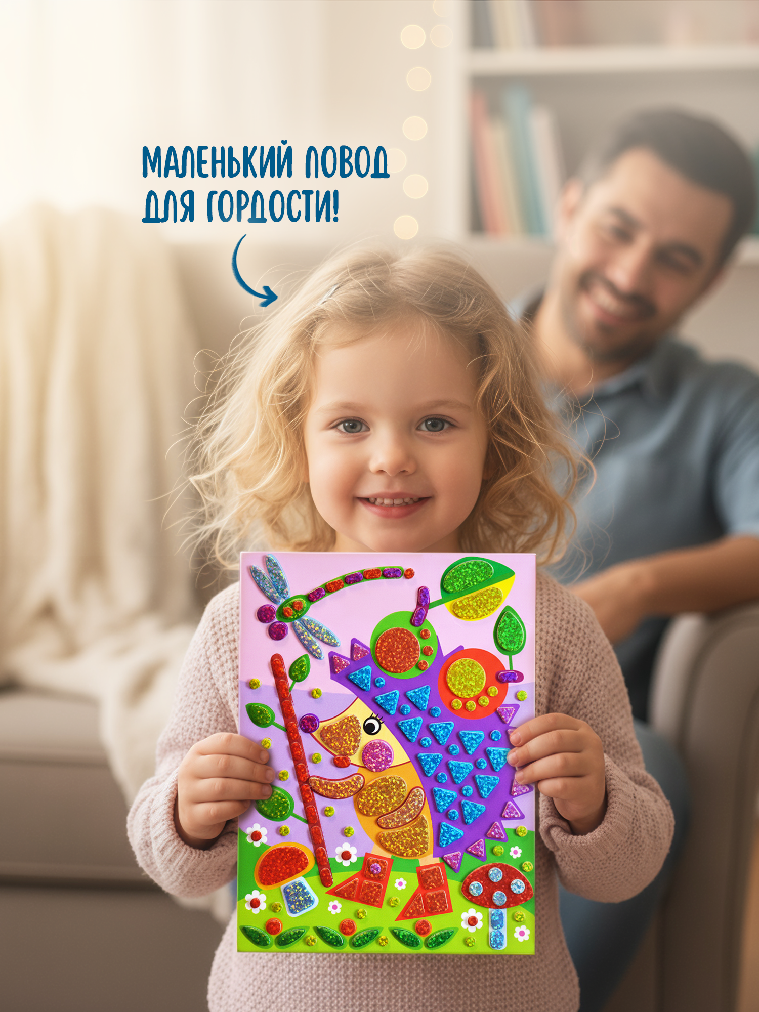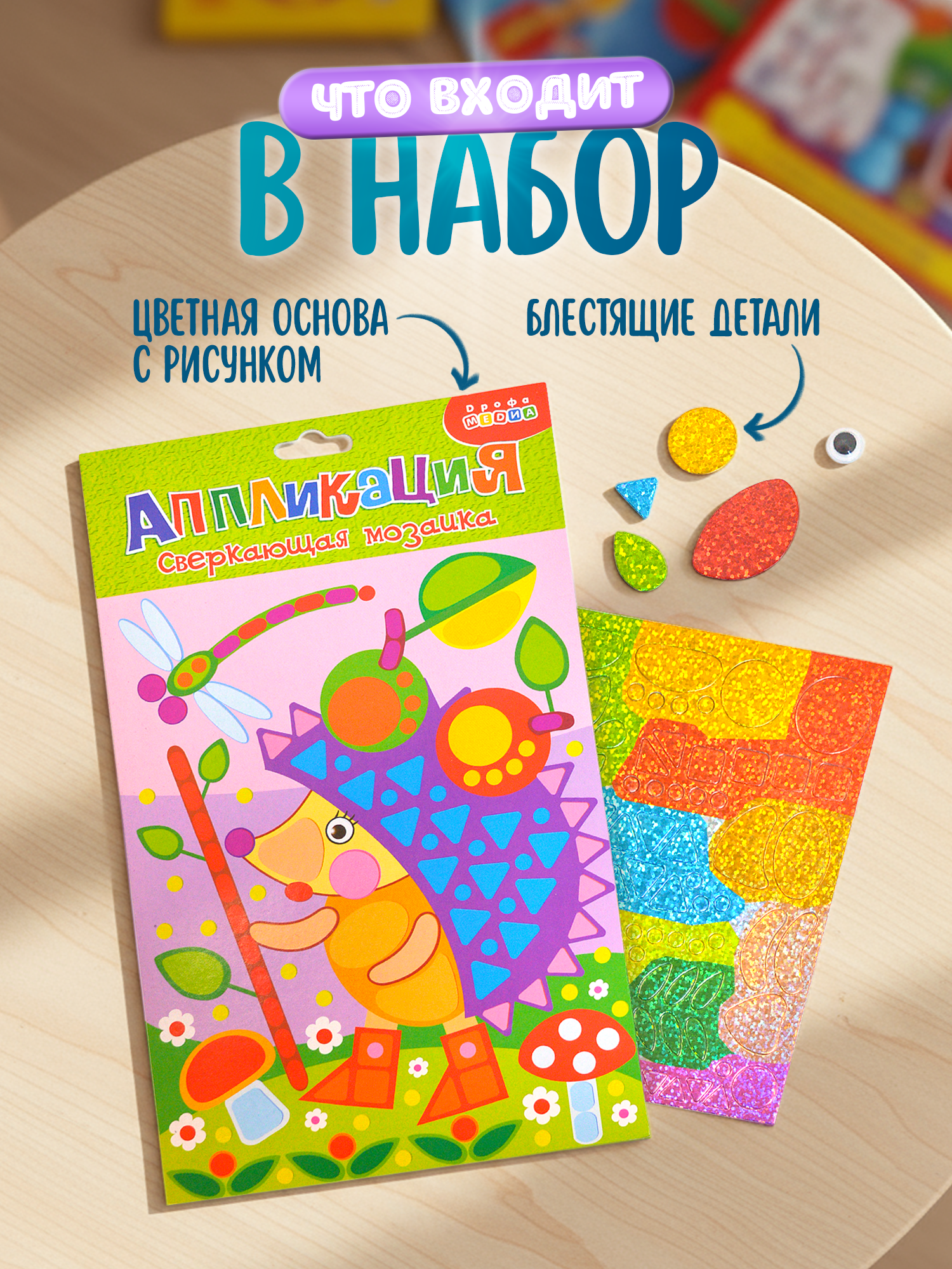 Малыш легко справится с работой, ведь ему не нужны ни клей, ни ножницы: объёмные детали легко приклеятся на картонную основу.