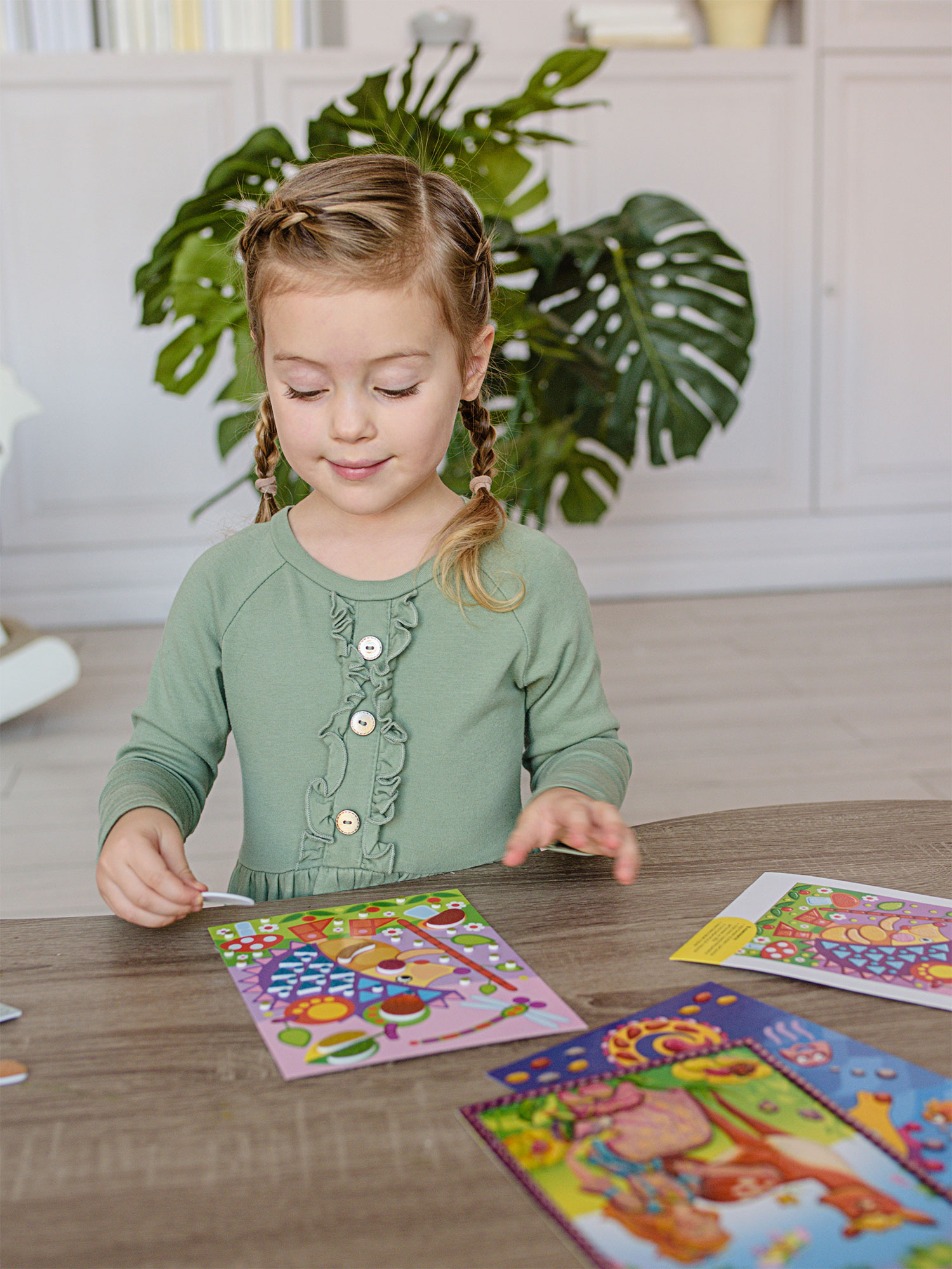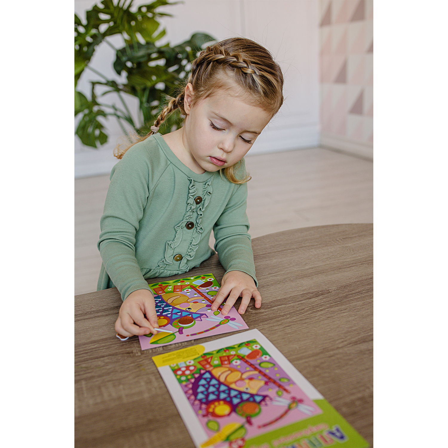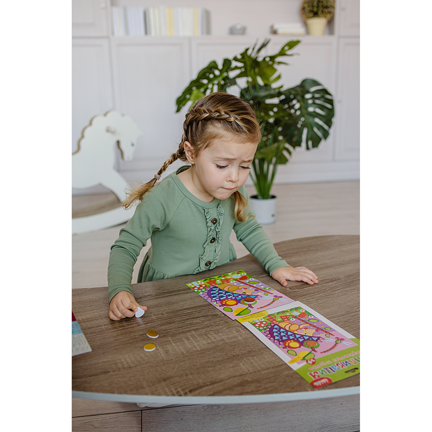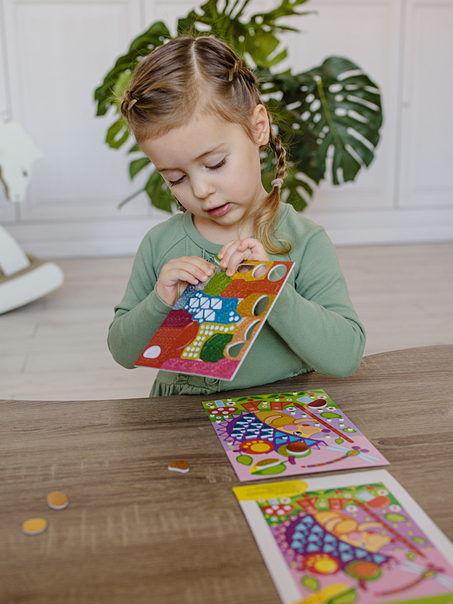 Малыш легко справится с работой, ведь ему не нужны ни клей, ни ножницы: объёмные детали легко приклеятся на картонную основу.