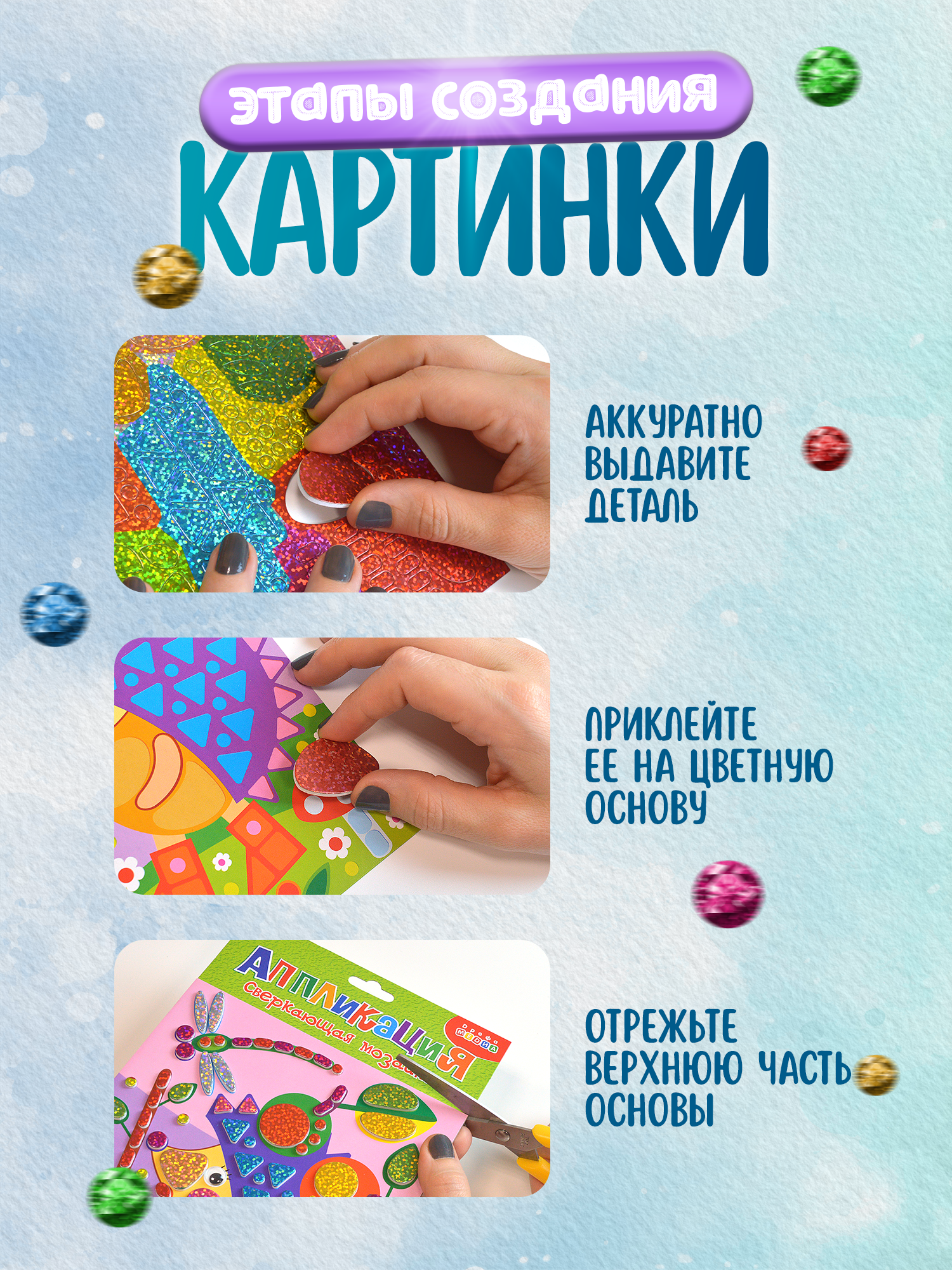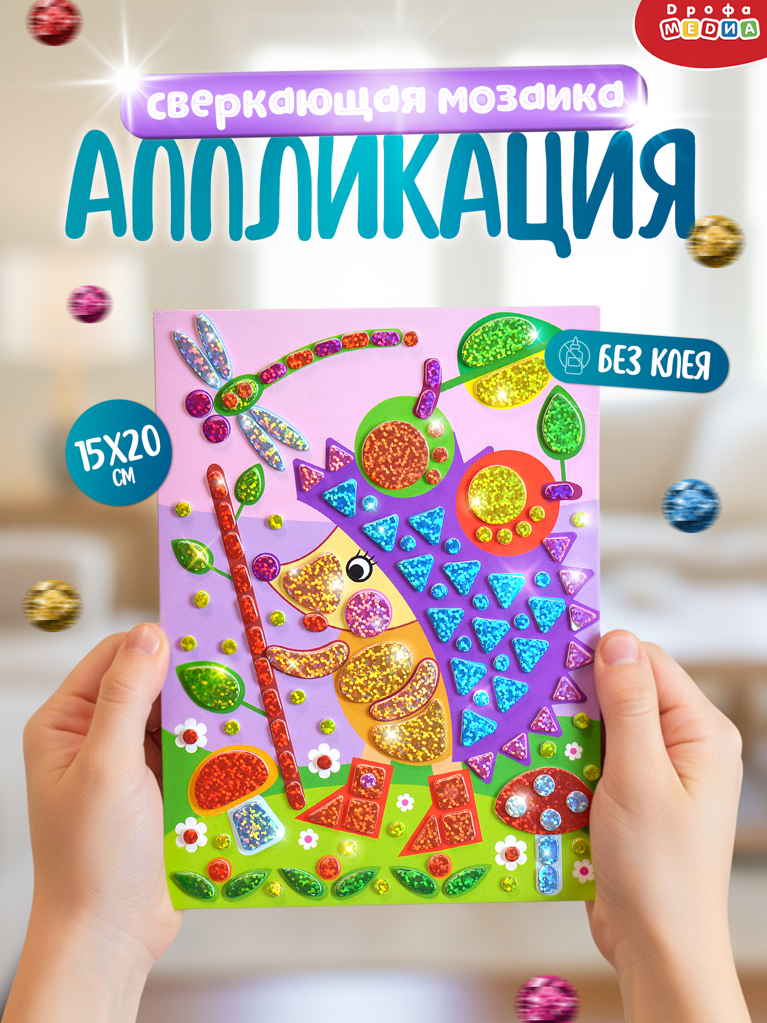 Праздничная и яркая аппликация, состоящая из красочных деталей, отличающихся по форме и размерам. Готовое изделие эффектно переливается всеми цветами радуги, благодаря покрытию деталей мозаики голографической плёнкой, придающей им необыкновенный блеск.