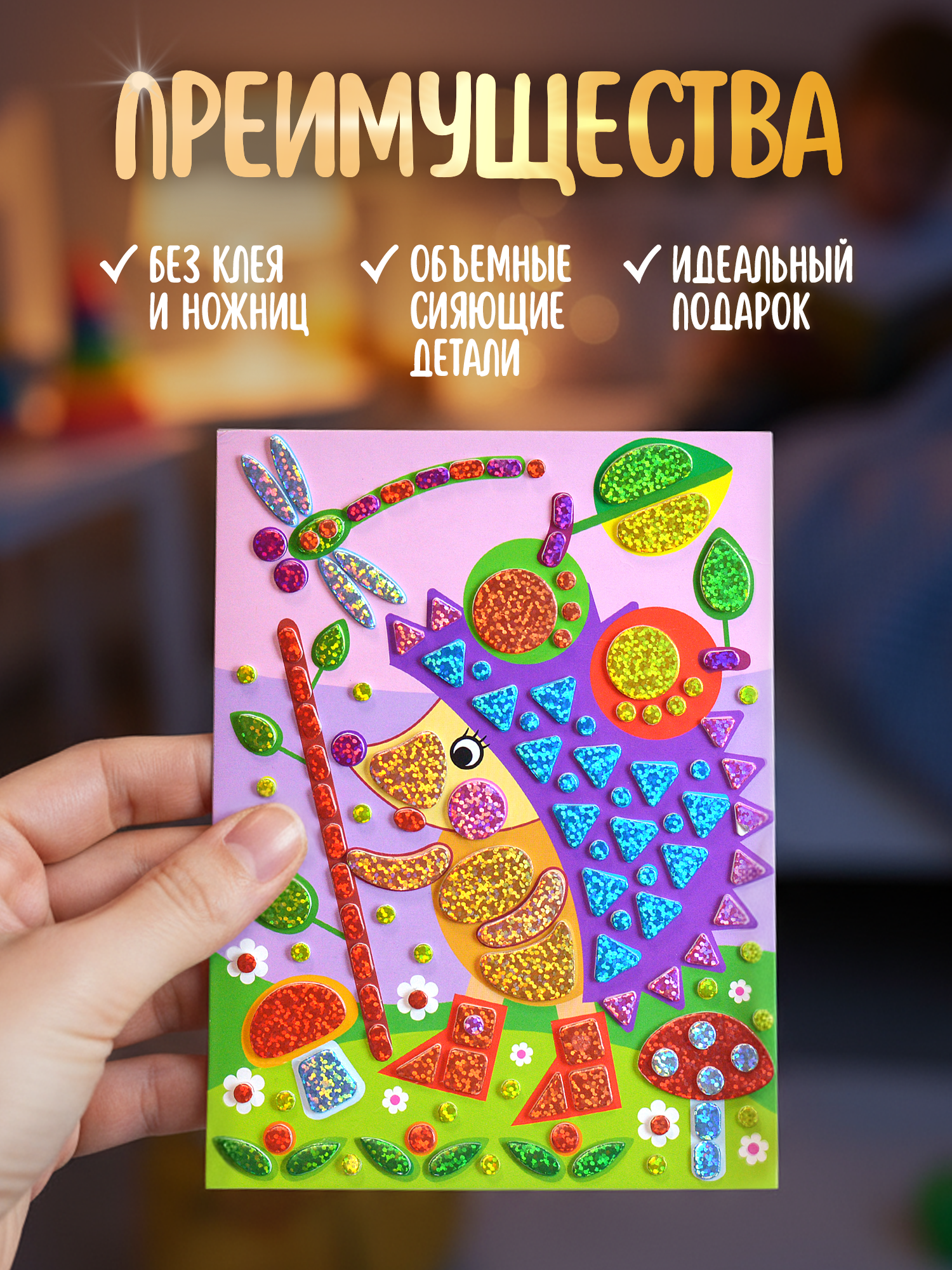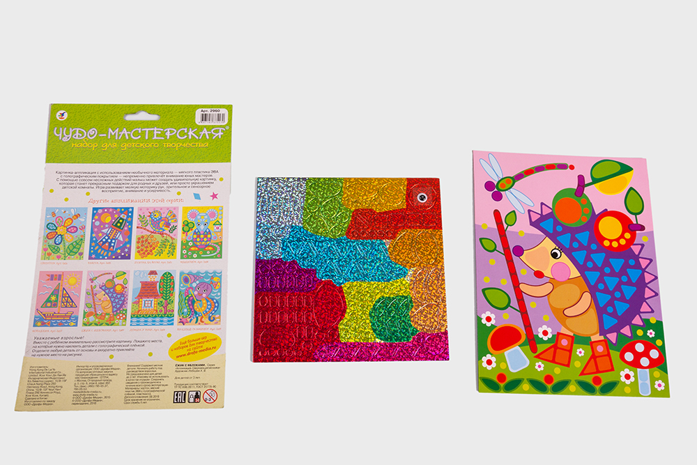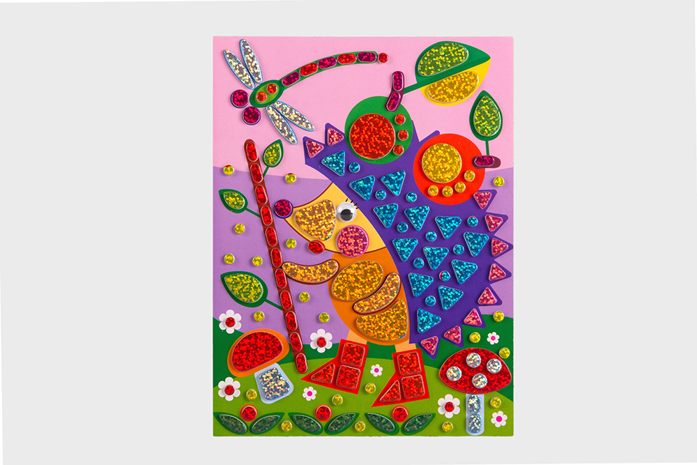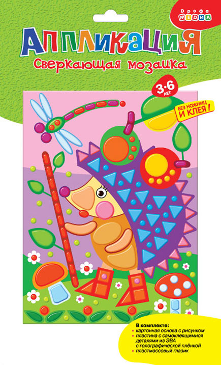 Очень нравится вся серия сверкающей-мозаики! Ёжик просто бесподобен - красавец в сапожках! Столько элементов на картинке и все красивые, яркие! Отклеиваются детали легко, ребенок в 4 года справляется самостоятельно! (я помогаю, иногда, отклеивать от основы, когда ребенок устал - все таки время занимает эта аппликация минут 40 у нас, иногда до часа возимся).
