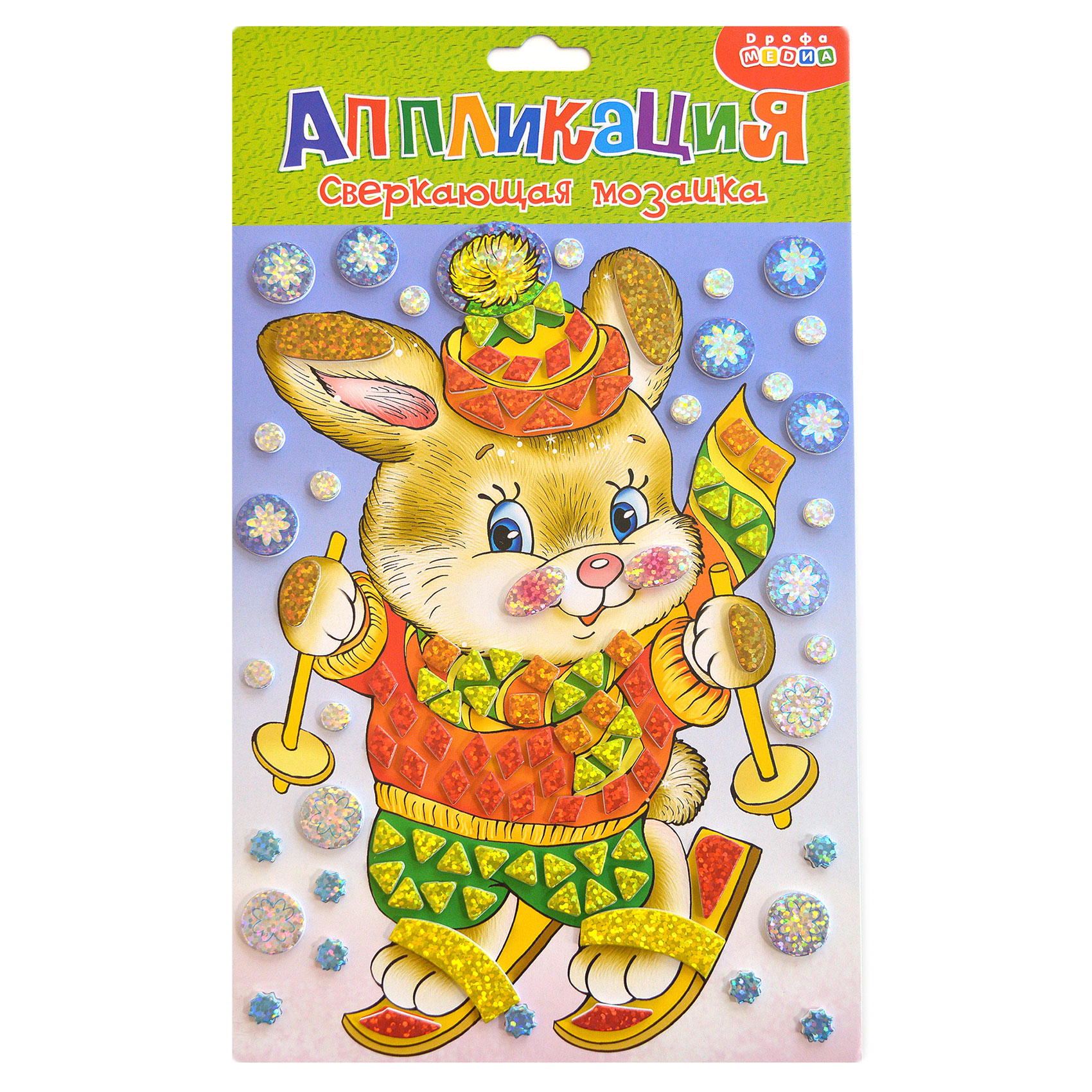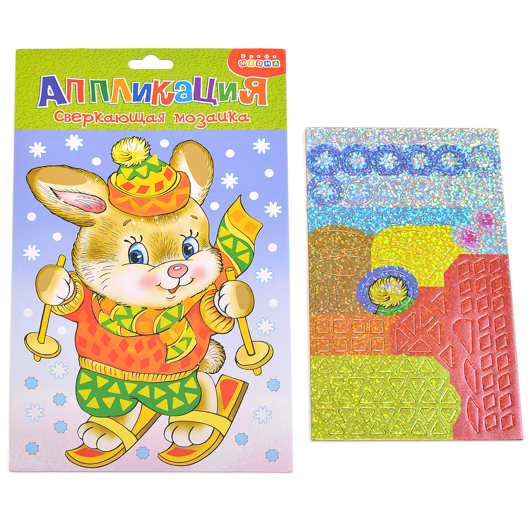 Праздничная и яркая аппликация, состоящая из красочных деталей, отличающихся по форме и размерам. Готовое изделие эффектно переливается всеми цветами радуги, благодаря покрытию деталей мозаики голографической плёнкой, придающей им необыкновенный блеск.