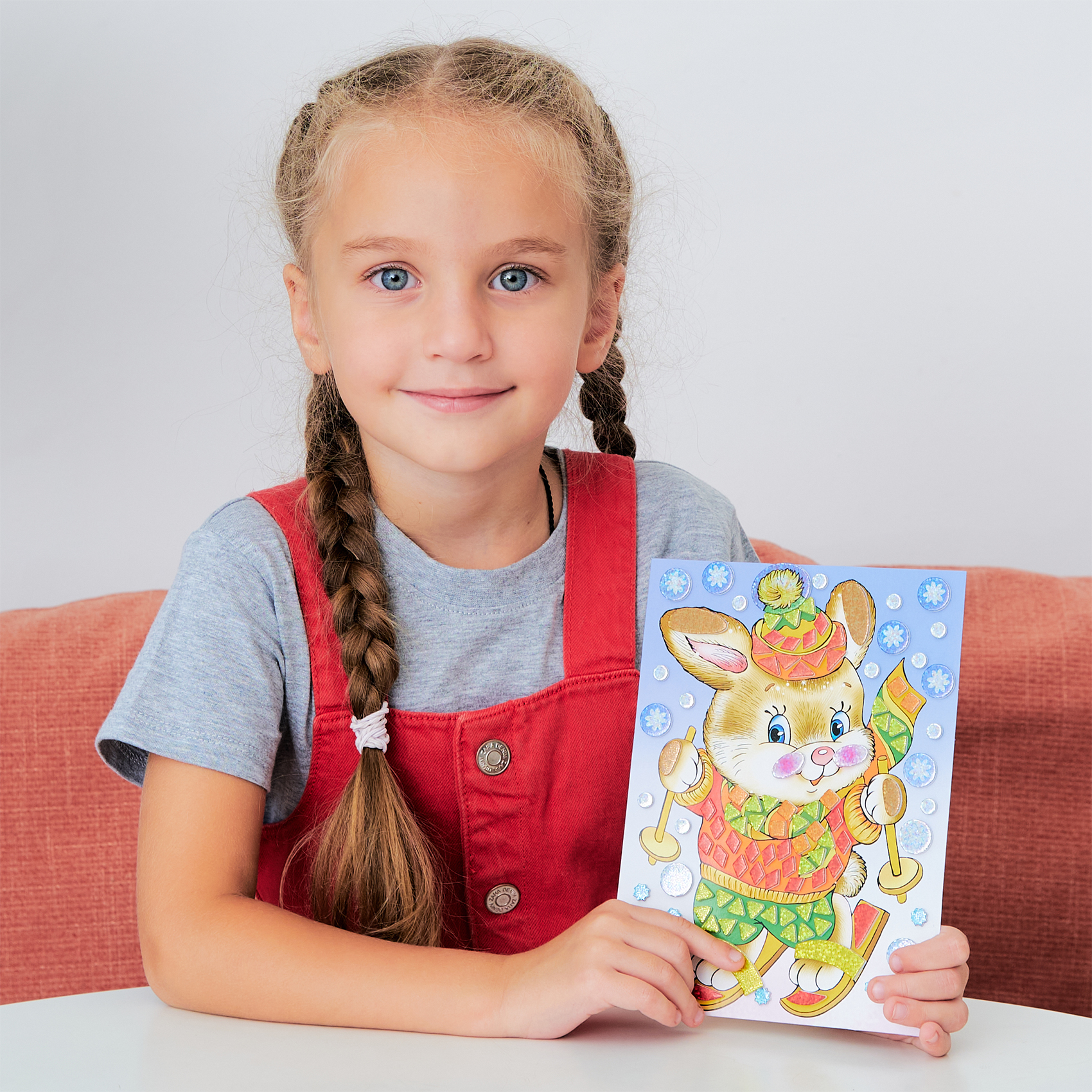 Малыш легко справится с работой, ведь ему не нужны ни клей, ни ножницы: объёмные детали легко приклеятся на картонную основу. Готовая картинка станет прекрасным подарком для родных и друзей, или просто украшением детской комнаты.