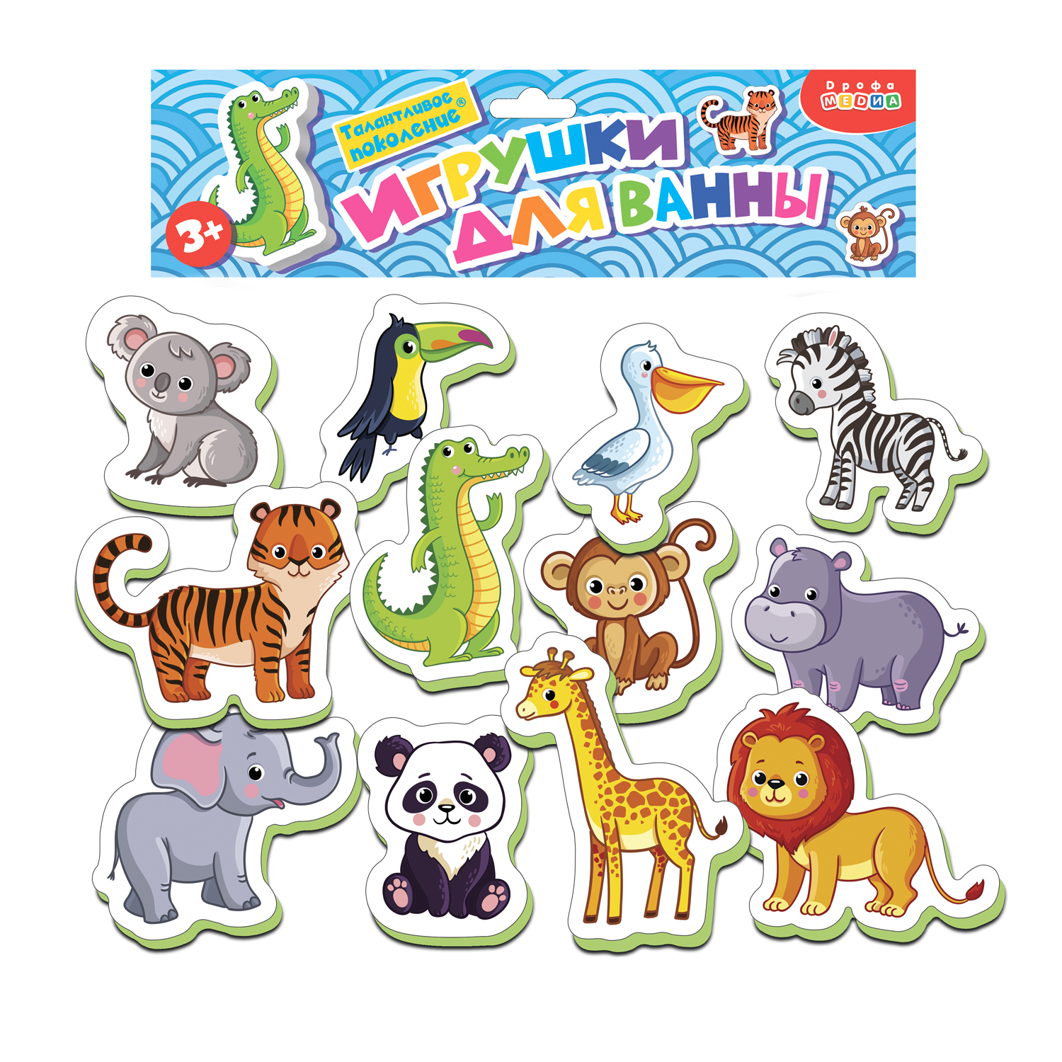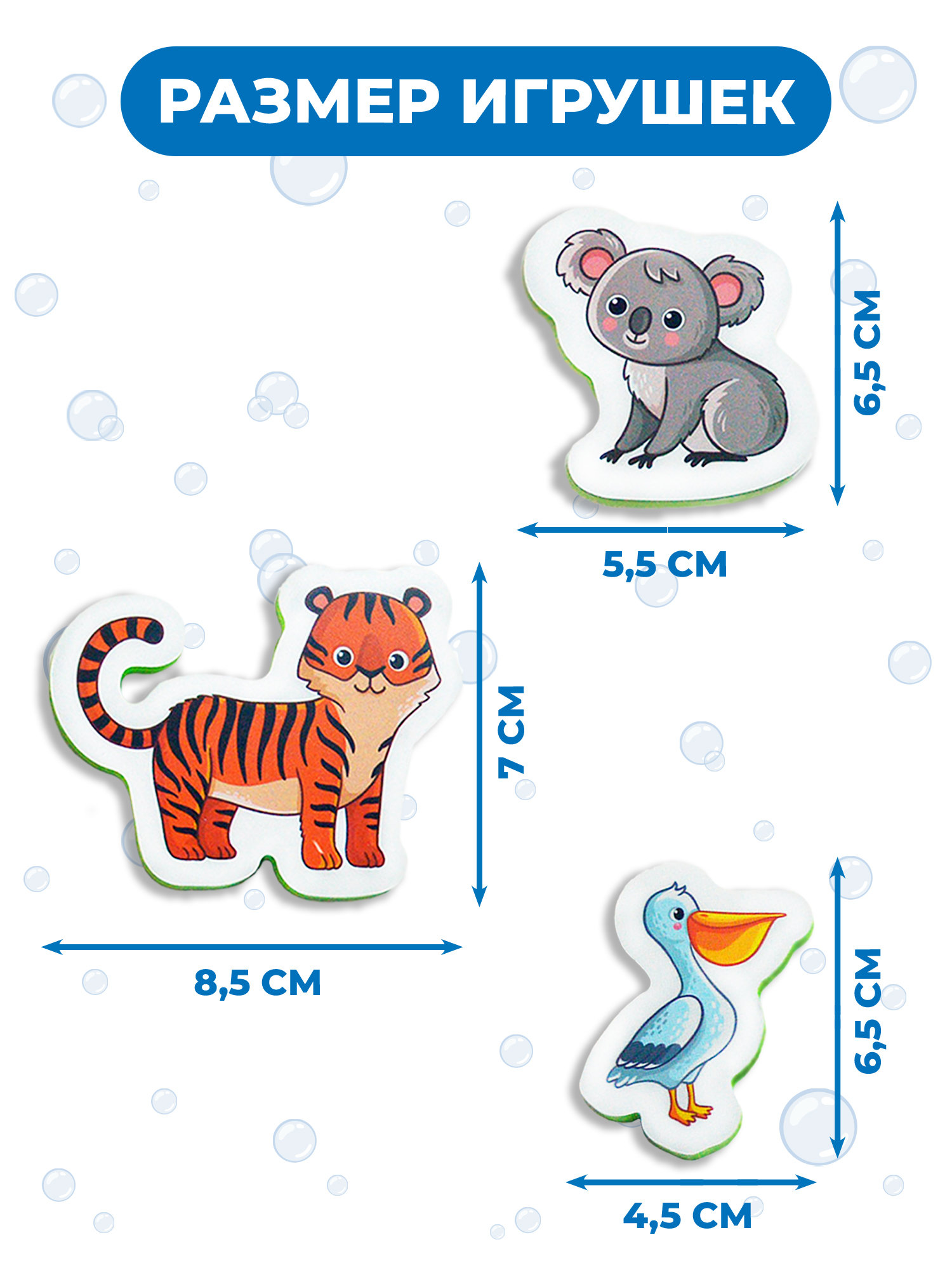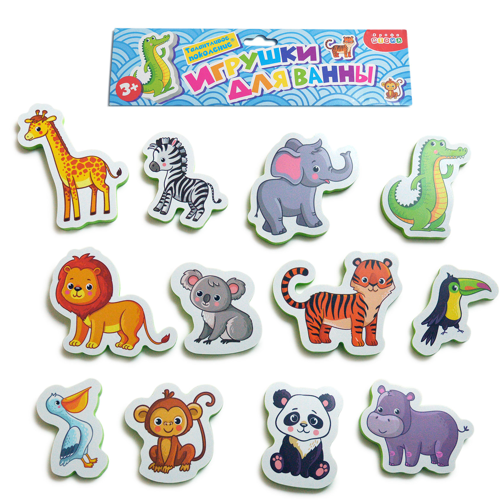 Перед вами набор игрушек для ванны, с которым можно купаться, а ещё использовать как рамку с вкладышами. Он изготовлен из мягкого пластика ЭВА. Благодаря материалу, игрушки могут плавать и прилипать к стенкам ванны, керамической плитке и другим гладким поверхностям, которые не боятся воды. Лёгкие, приятные на ощупь игрушки безопасны для детей.