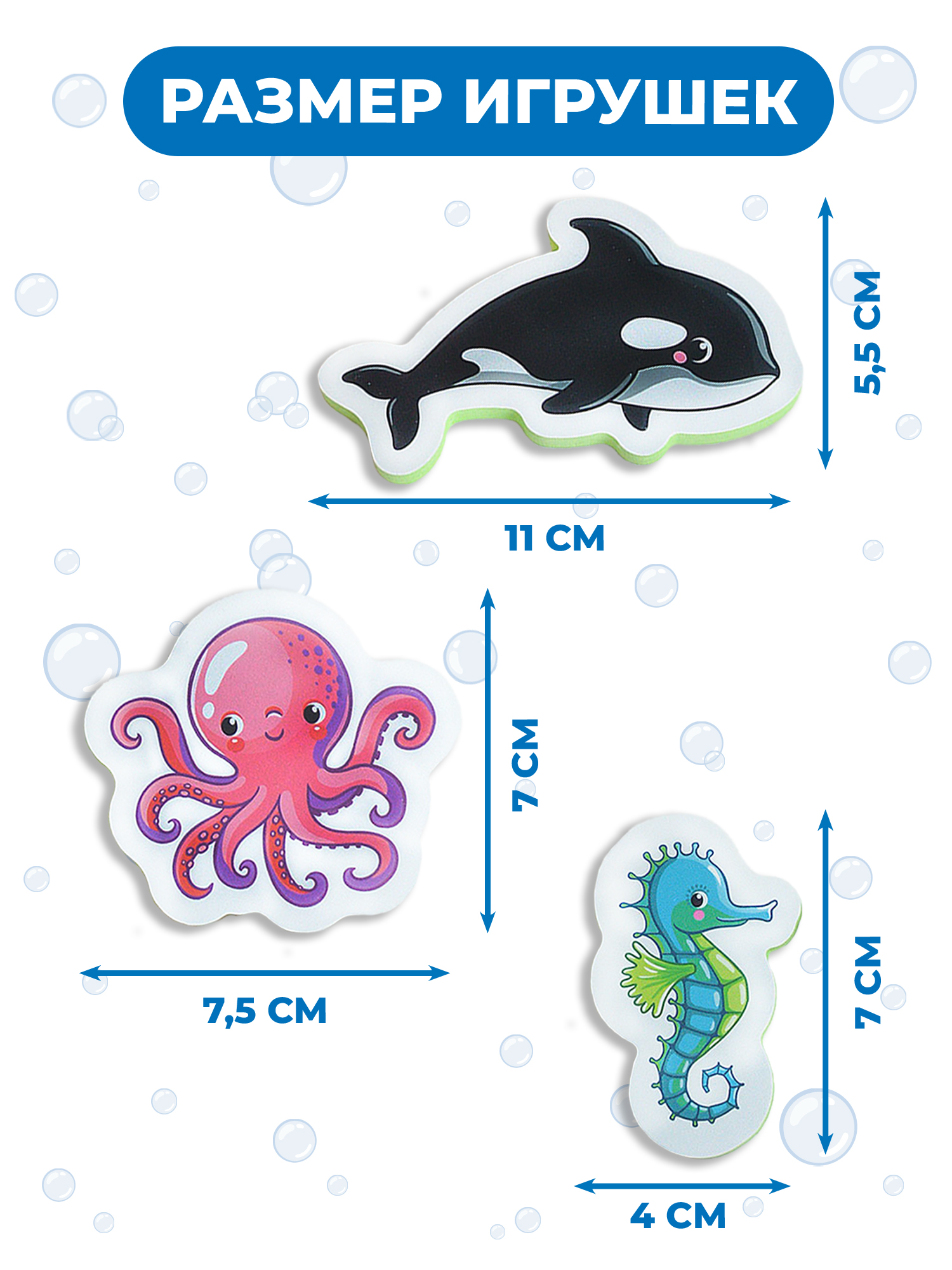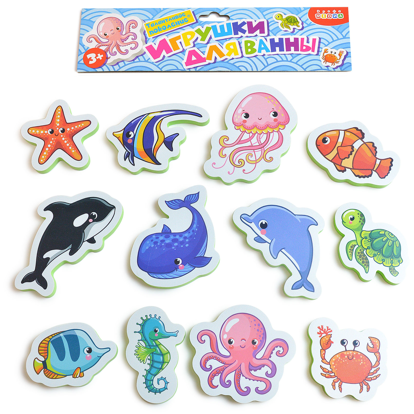 Перед вами набор игрушек для ванны, с которым можно купаться, а ещё использовать как рамку с вкладышами. Он изготовлен из мягкого пластика ЭВА. Благодаря материалу, игрушки могут плавать и прилипать к стенкам ванны, керамической плитке и другим гладким поверхностям, которые не боятся воды. Лёгкие, приятные на ощупь игрушки безопасны для детей.