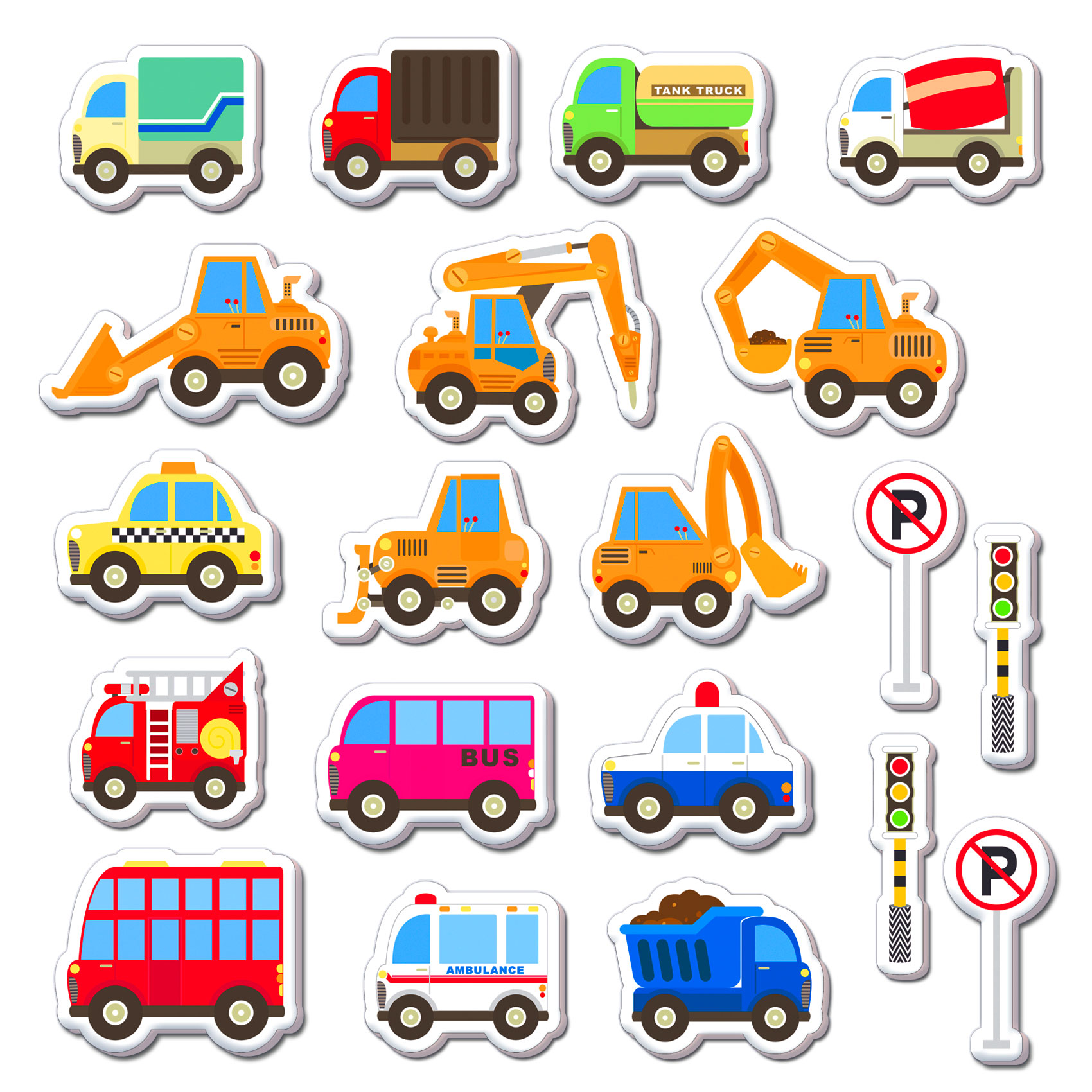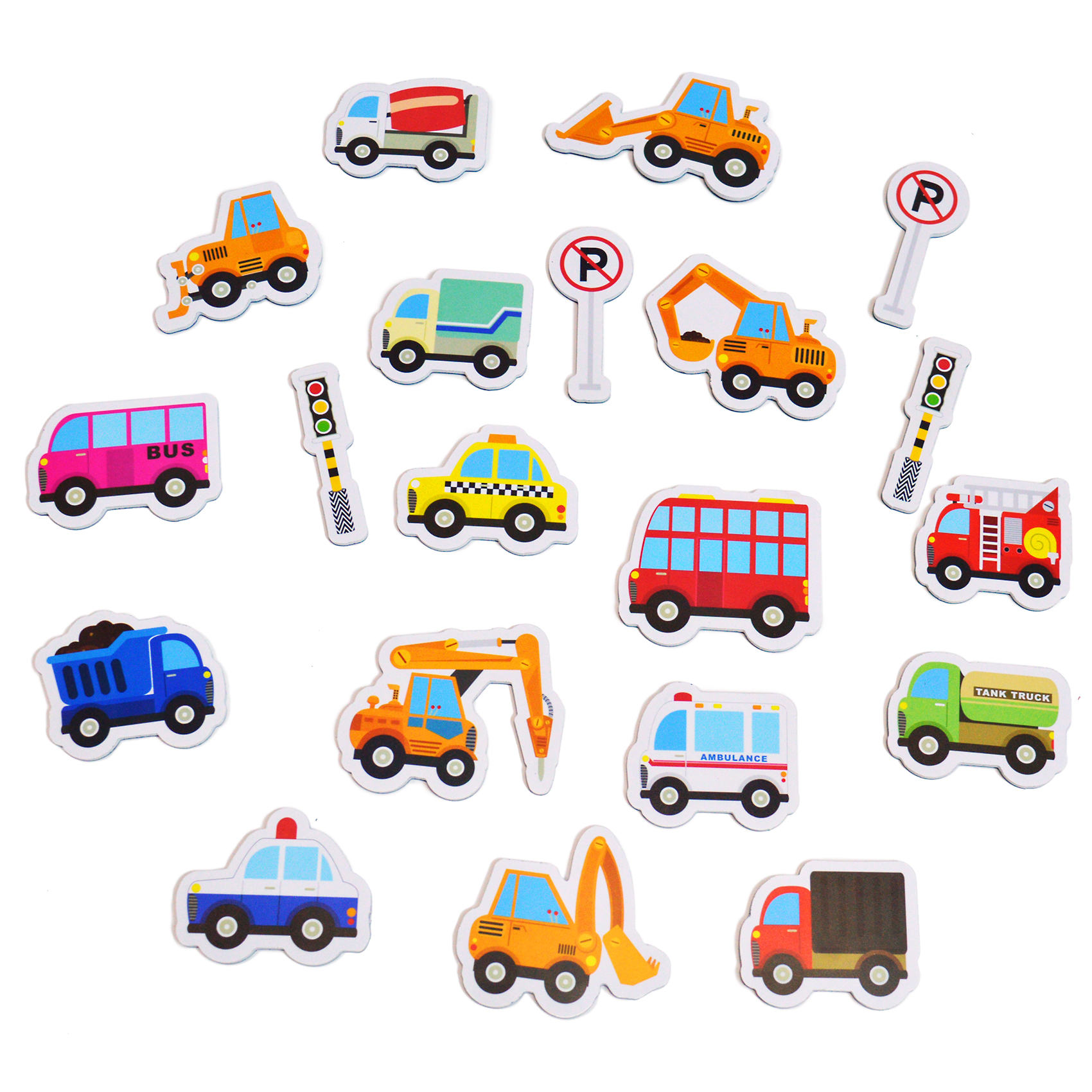 В наборе 20 фигурок: городские автомобили, строительная техника, светофоры и дорожные знаки. Спросите ребёнка, какие машины ему знакомы, для чего они предназначены. Расскажите, для чего нужны остальные. Поощряйте желание ребёнка придумывать сюжеты для игры.