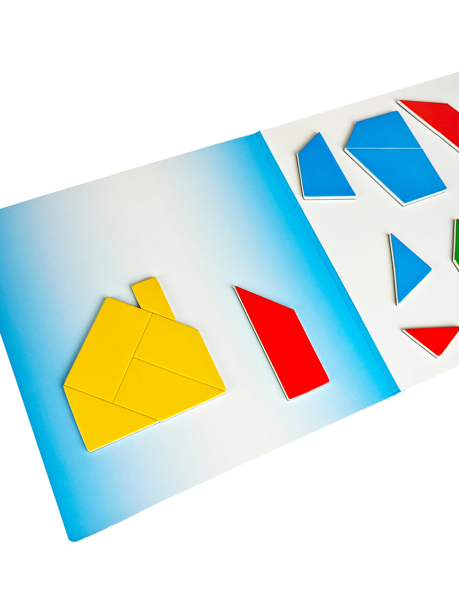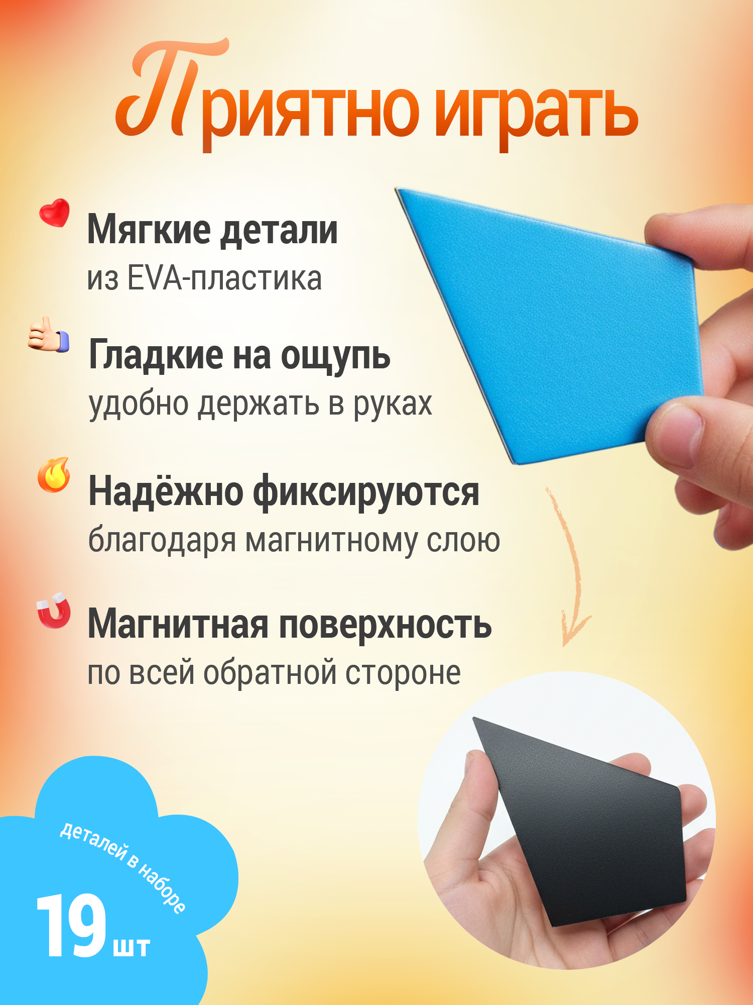 Также разноцветные детали можно использовать как мозаику, собирать и выкладывать из них различные фигуры. На одной стороне планшета расположено игровое поле, а на другой – место для хранения деталей. Детали выполнены из мягкого пластика ЭВА и магнитного винила – они объемные и тактильно приятные. Такие детали удобно держать в руках, а магнитная основа надежно удерживает их на поле во время игры.