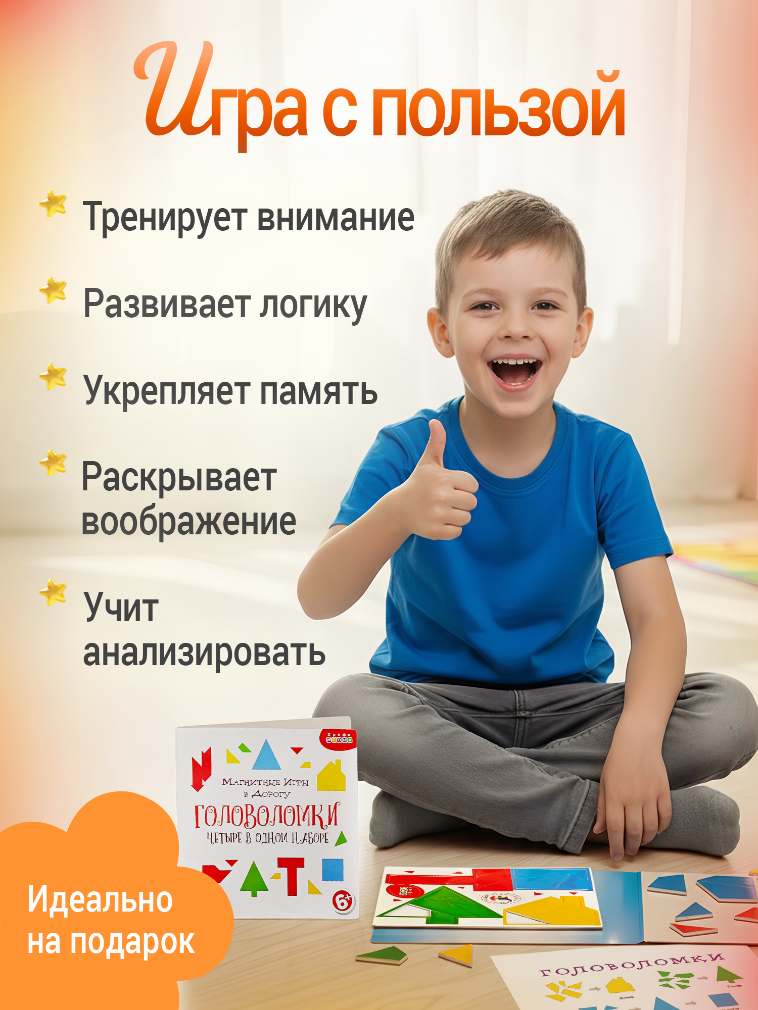 Игра тренирует логику, память и сообразительность, развивает пространственное мышление. Развивашки для детей – это идеальный способ занять маленьких путешественников! Игра в дорогу «Головоломки» легкая и компактная, не займет много места и выручит в дальней дороге.