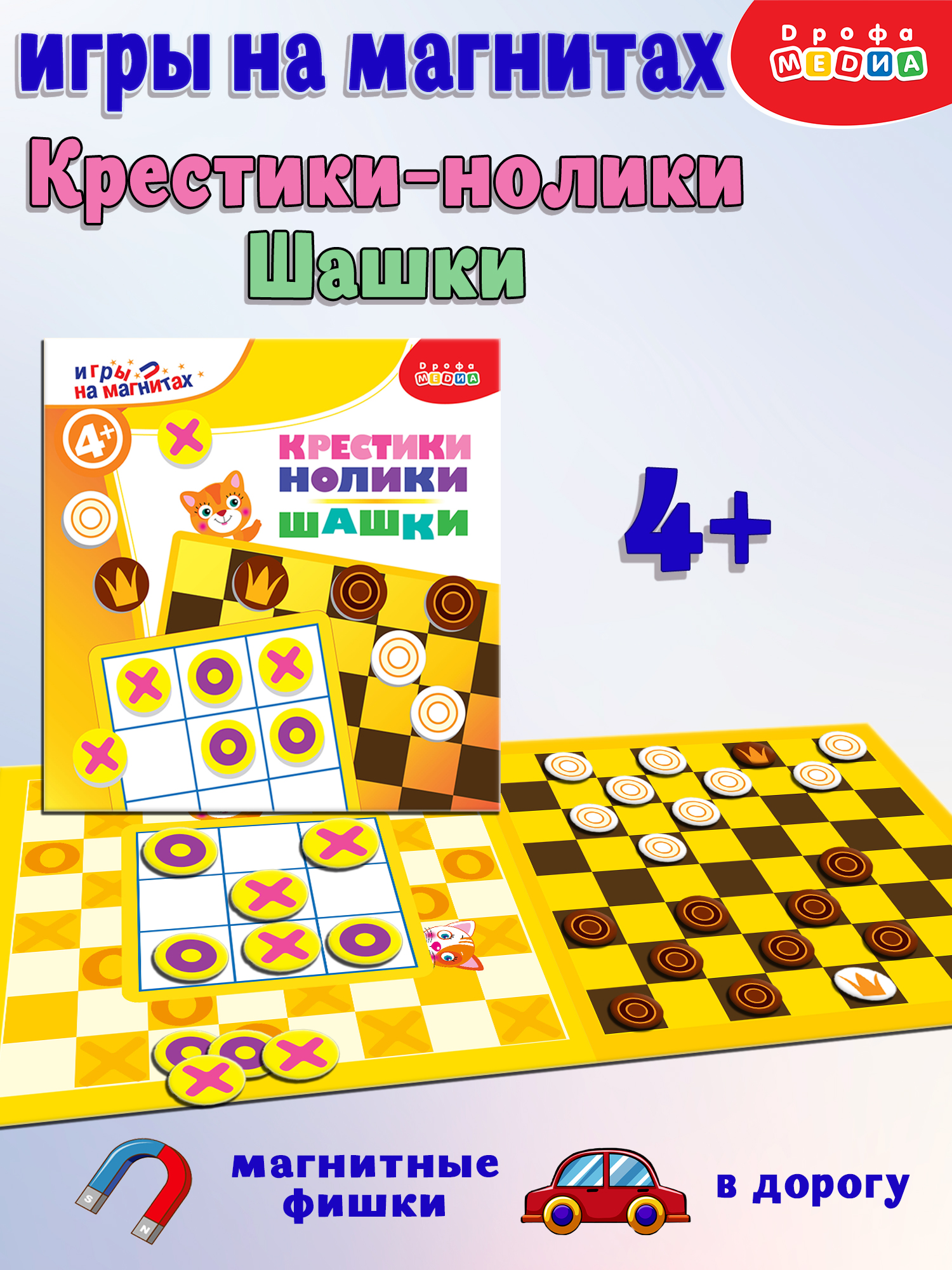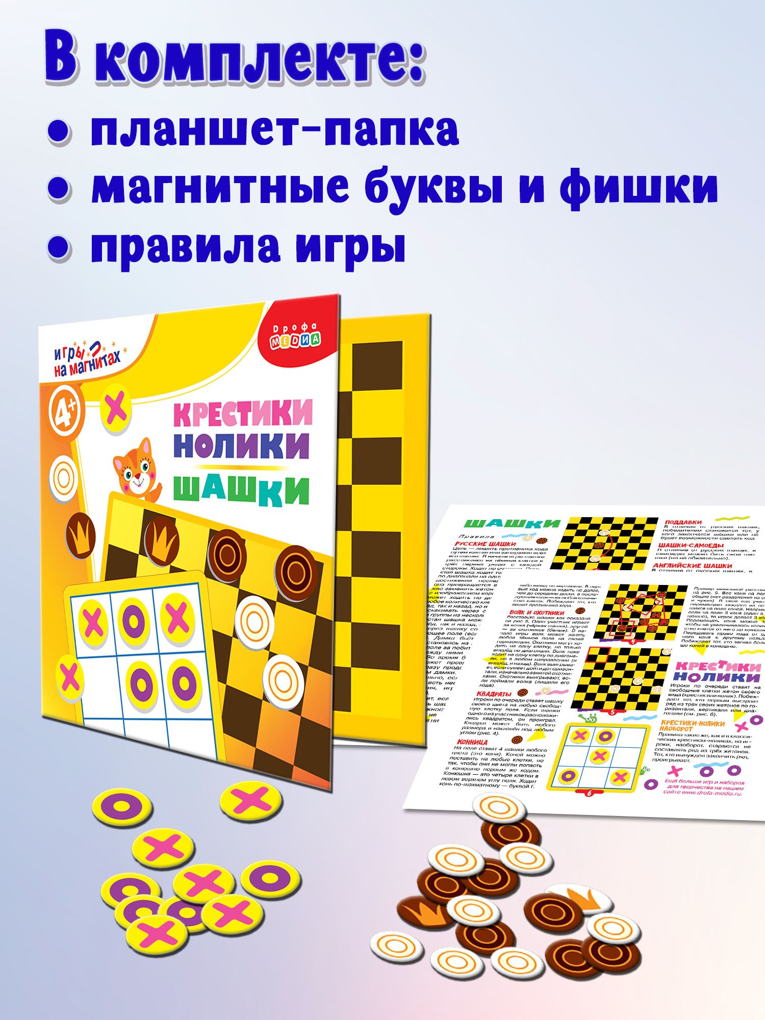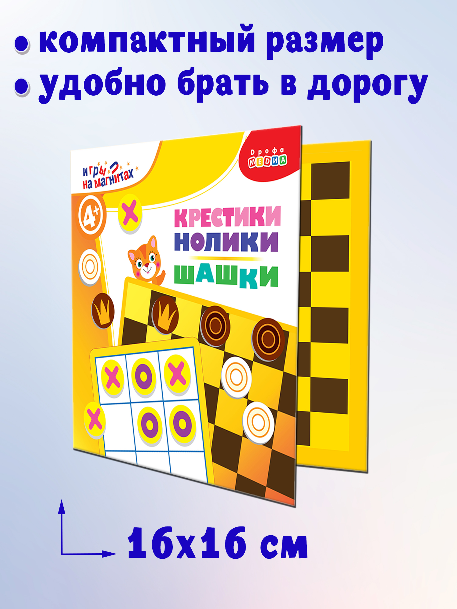 Компактных планшет удобно хранить и брать с собой в путешествие. Жетоны из безопасного мягкого полимерного материала толщиной 2 мм приятно держать в руках, а магнитная основа удерживает их на поле во время игры, не давая разлетаться. Игры развивают мышление, память, внимание, сообразительность. В правилах приведены несколько вариантов игры в шашки и крестики-нолики.