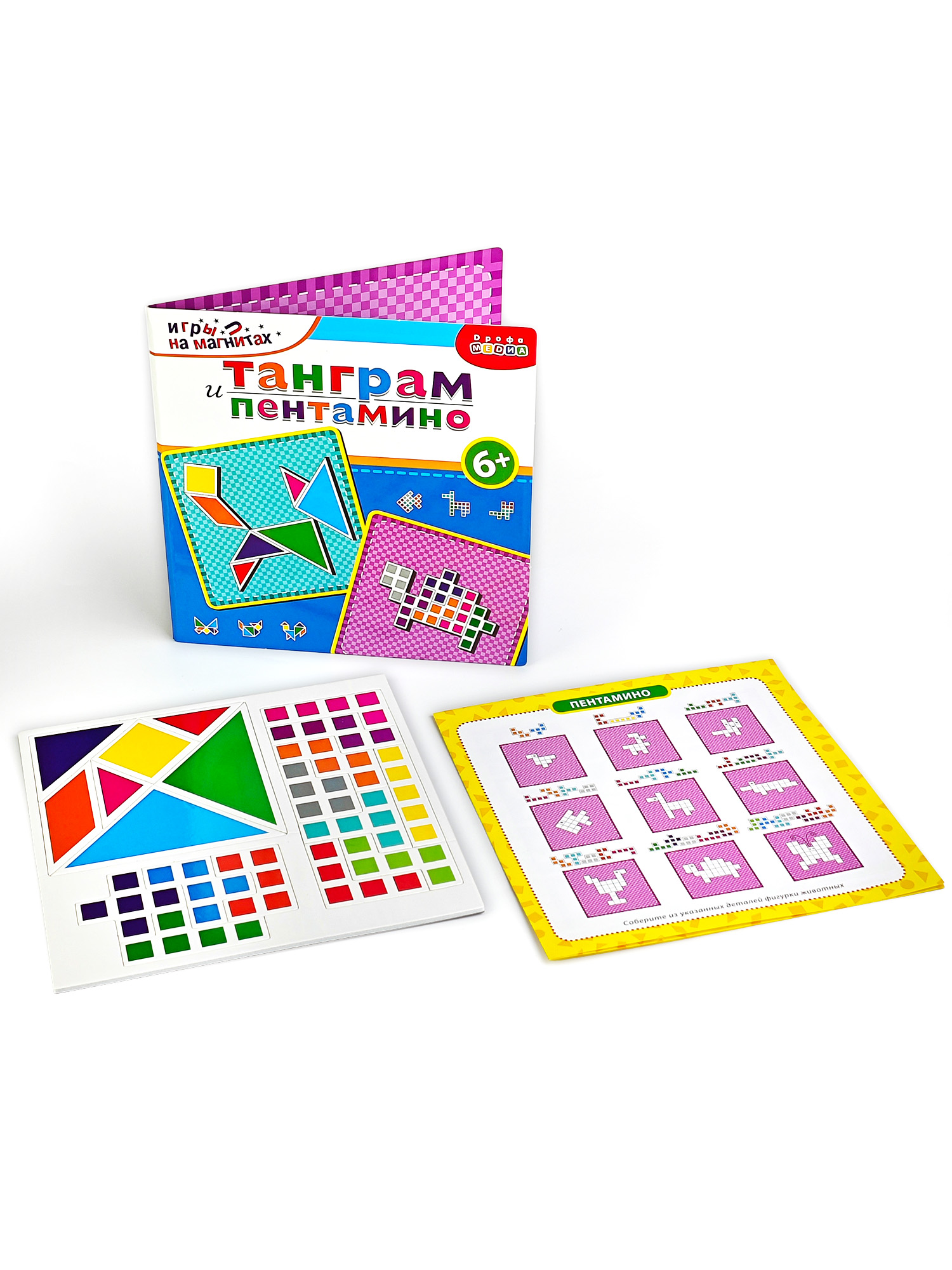 В комплекте: планшет, 7 деталей на магнитах для танграма, 12 деталей на магнитах для пентамино, листовка с заданиями и ответами.