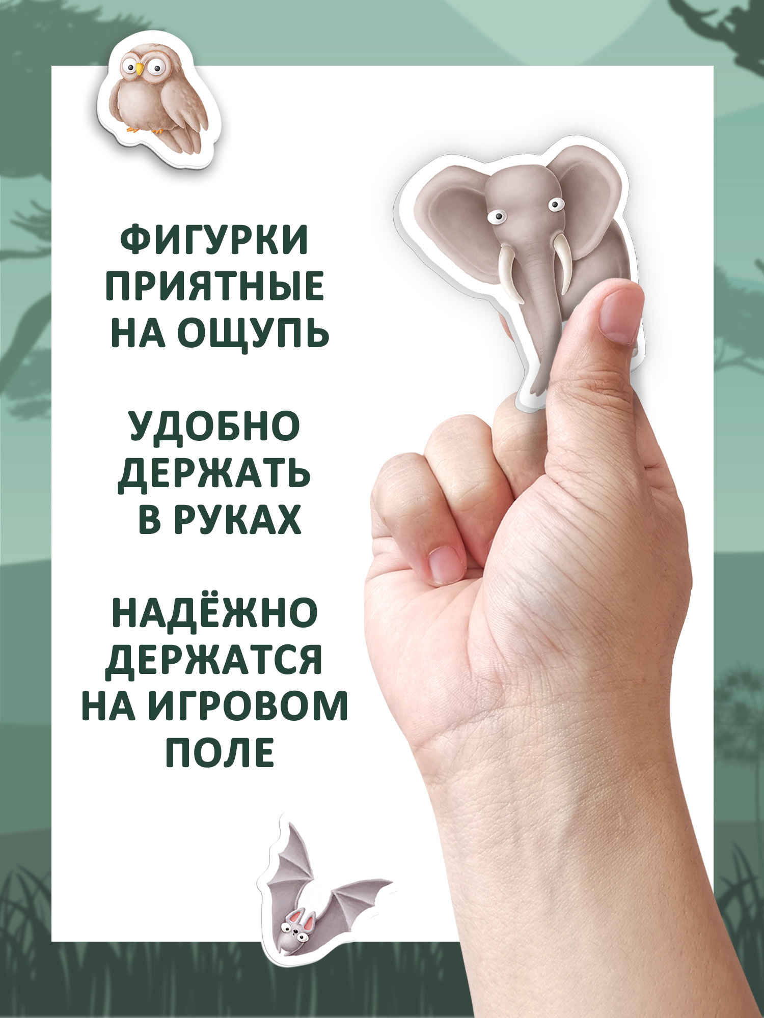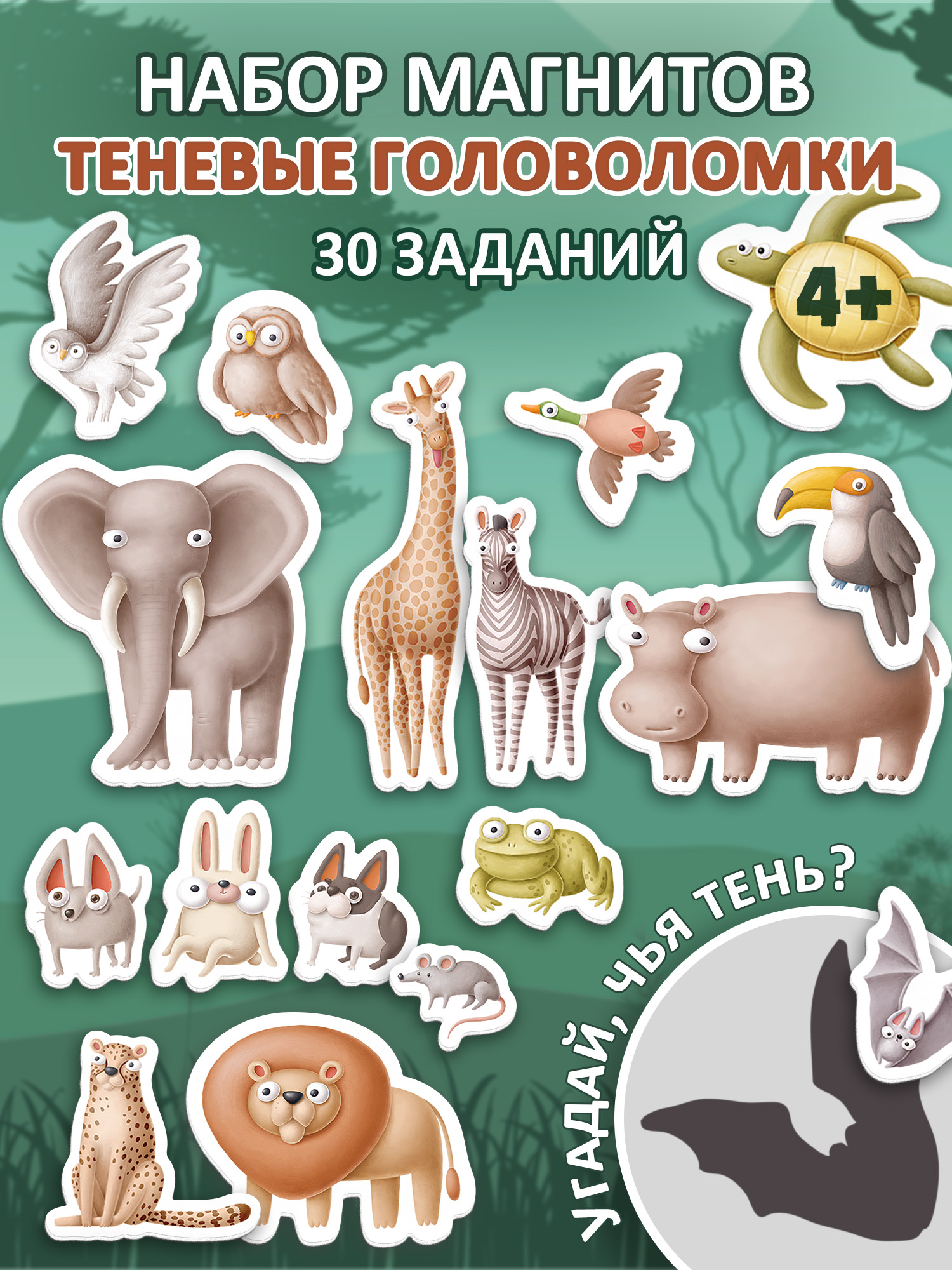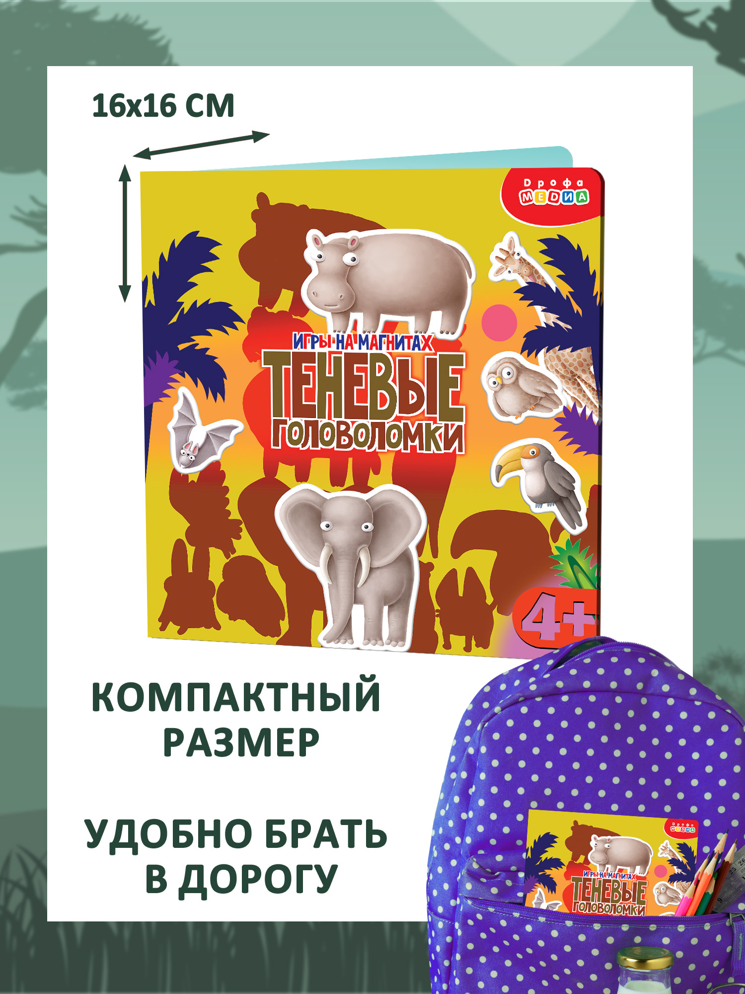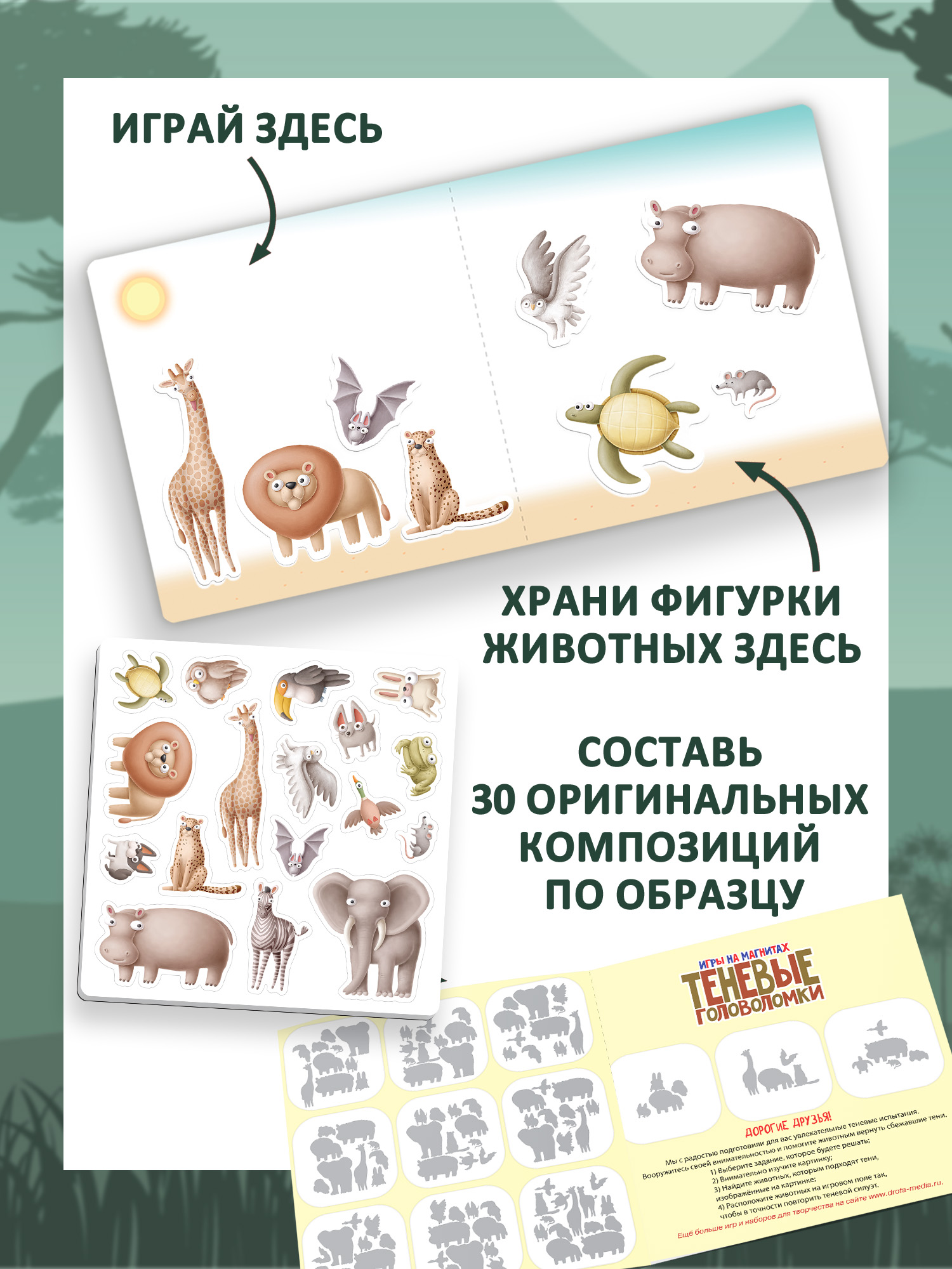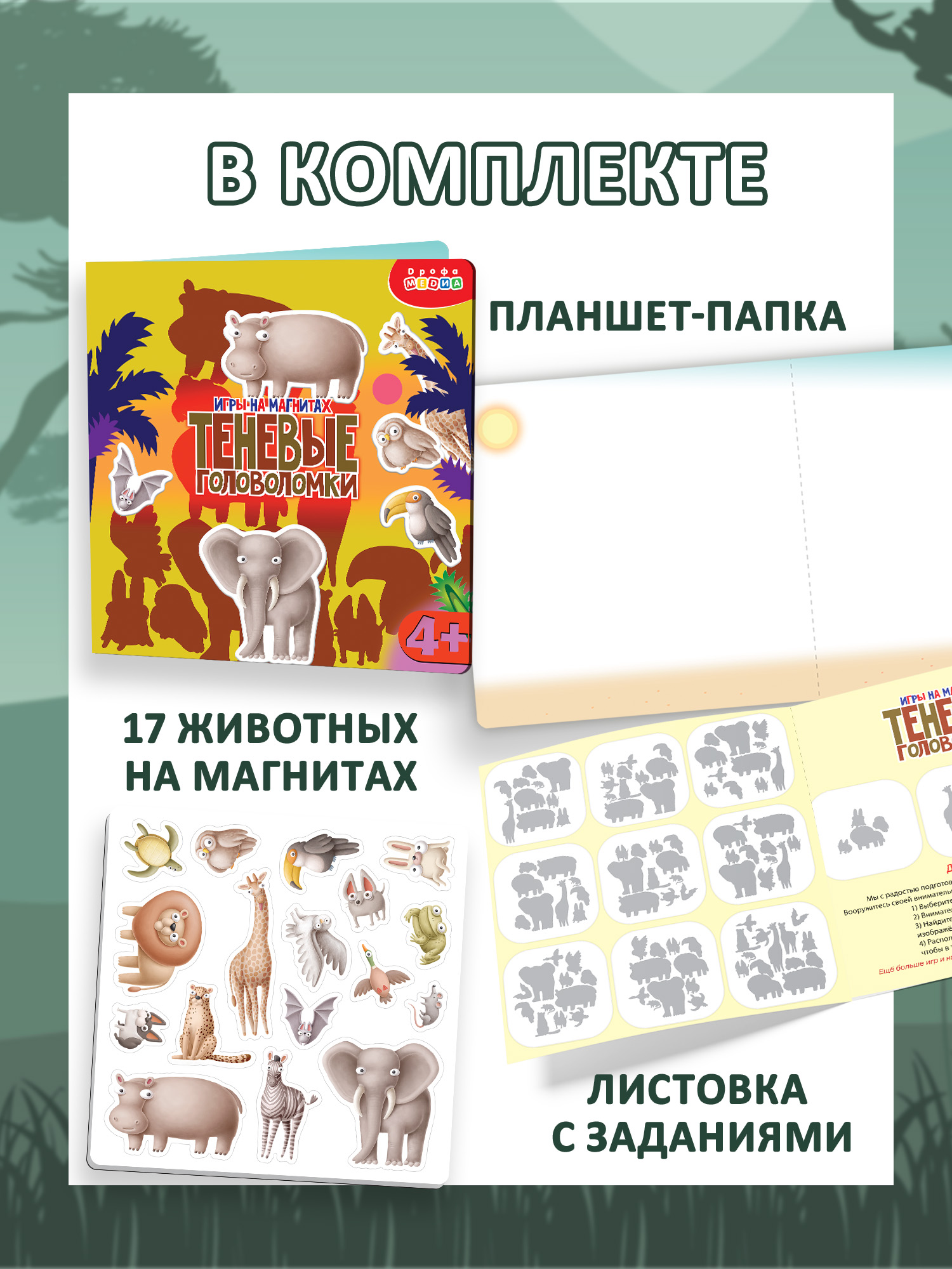 В комплекте: магнитный планшет, 17 животных на магнитах, листовка с заданиями.