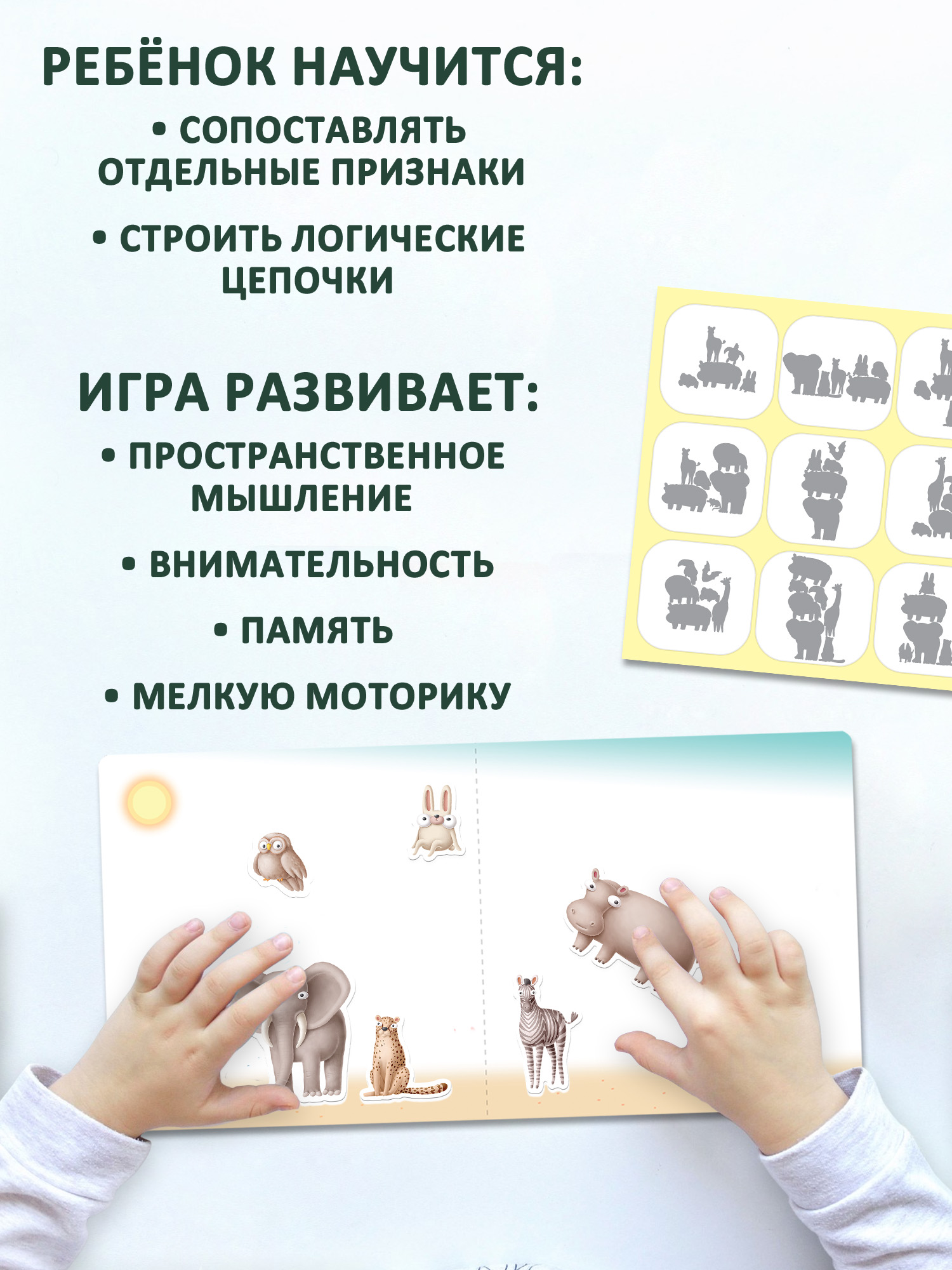Игра научит ребёнка сопоставлять отдельные признаки и проводить логические цепочки, а также поможет развить внимательность, память и мелкую моторику.