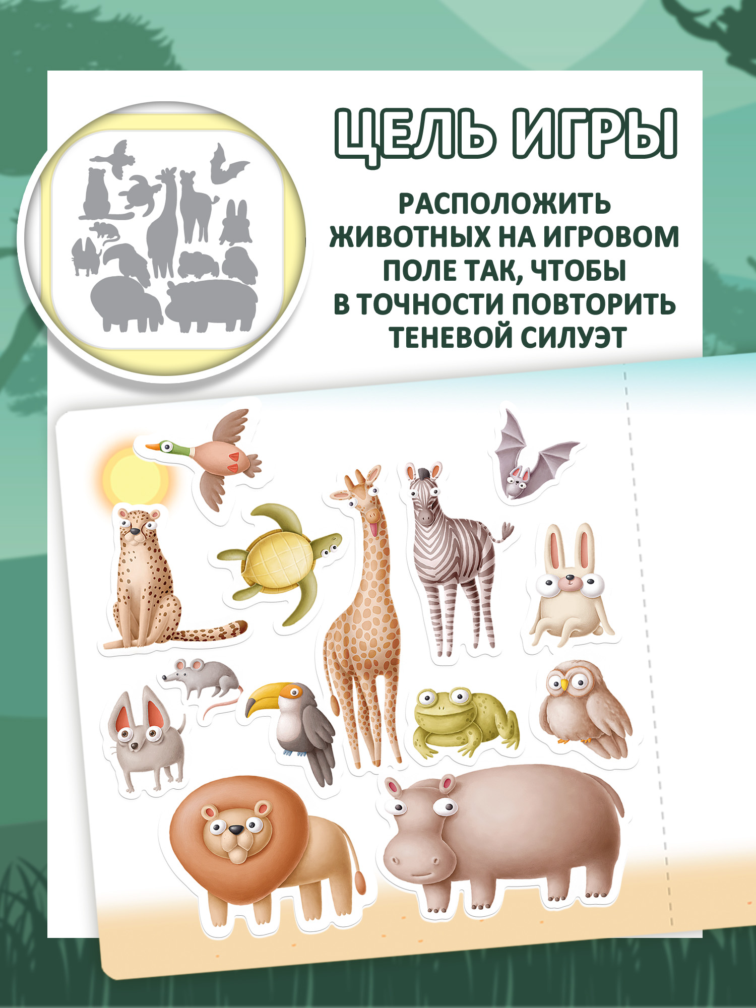 На листовке выберите загадку с тенями и внимательно изучите её. Найдите тех бедняжек, от которых убежали их тени. Расположите животных на игровом поле так, чтобы в точности повторить теневой силуэт. Только тогда игривые тени вернутся к своим хозяевам!