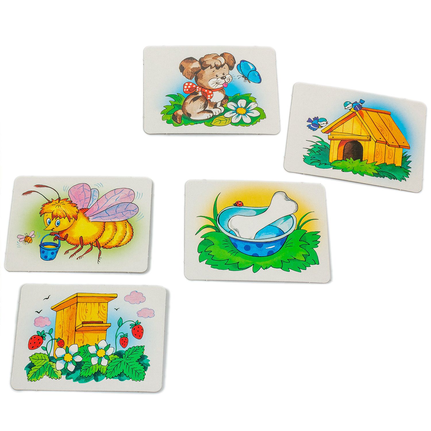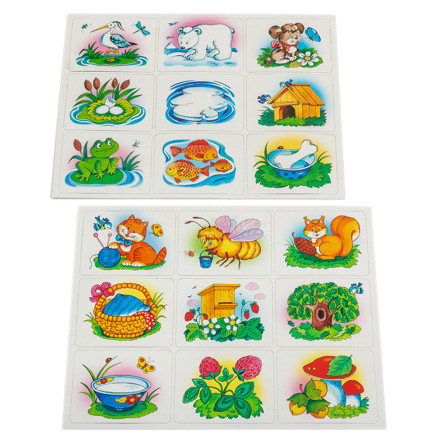 Игрок должен подобрать три карточки, связанные следующей ассоциацией: животное — место обитания — пища. На карточках изображены знакомые ребёнку животные: котёнок и щенок, белочка и пчела, цапля и белый медведь. Игра развивает ассоциативное мышление, внимание, расширяет кругозор, обогащает словарный запас.