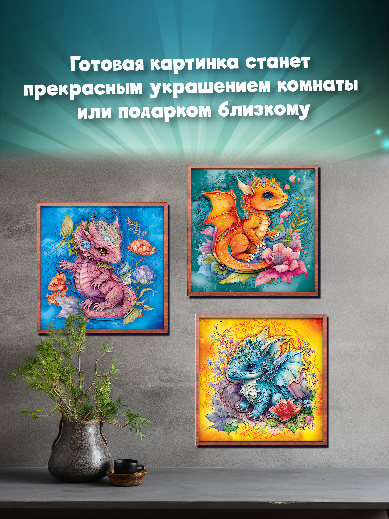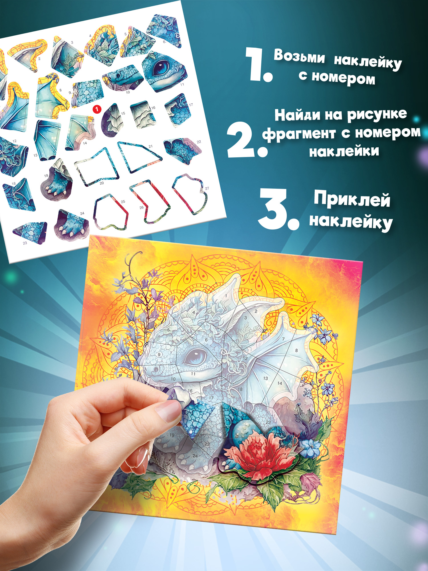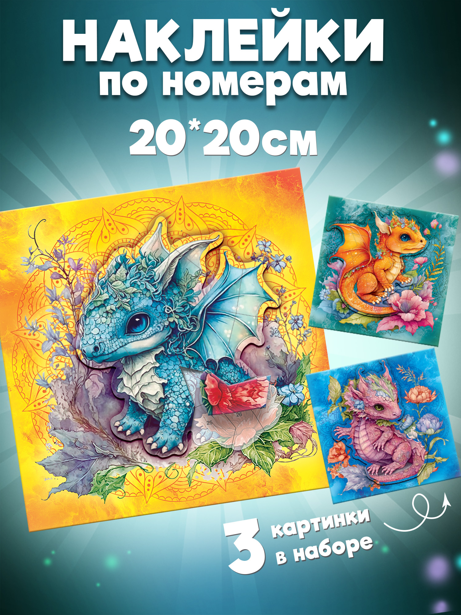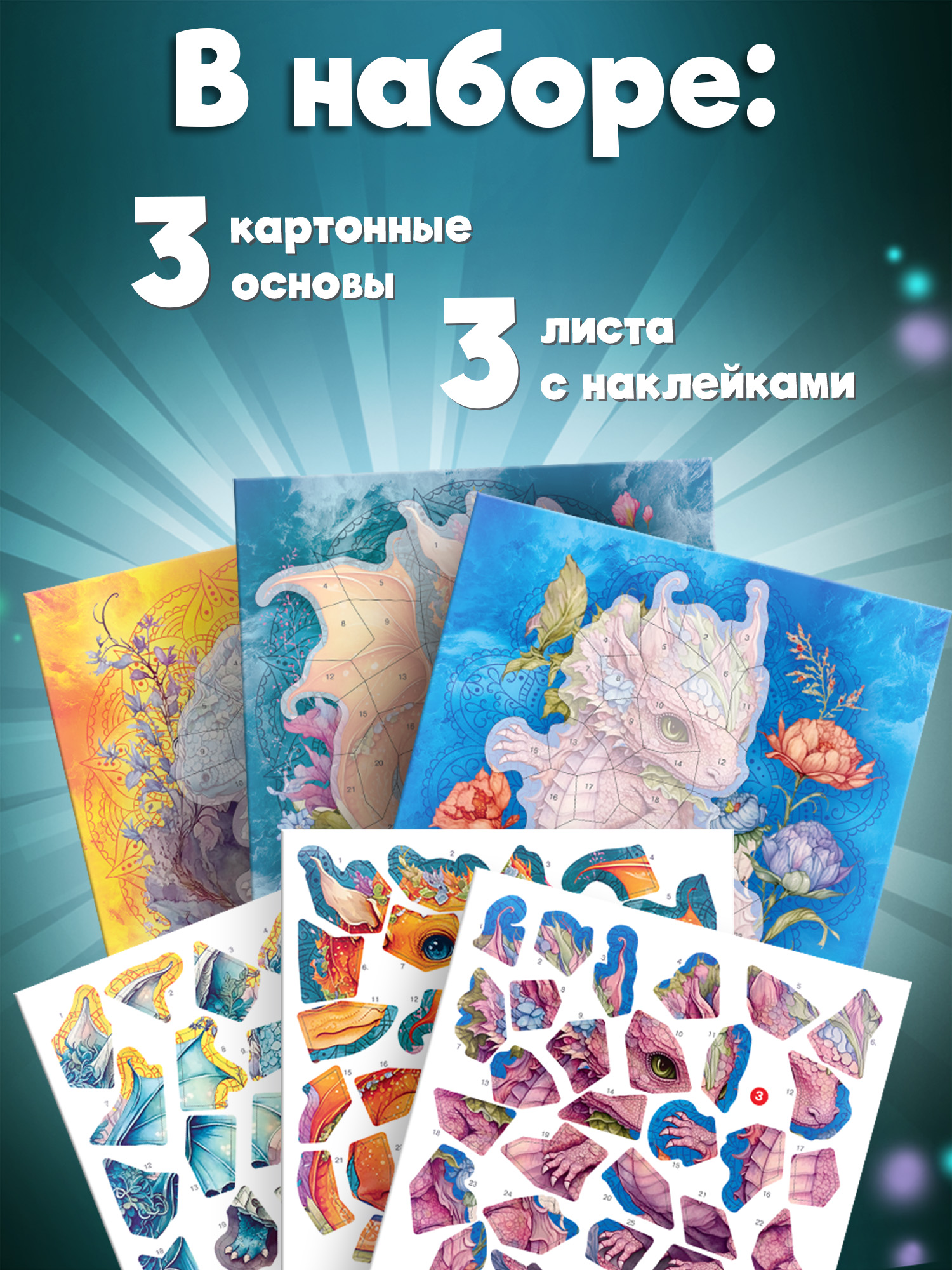 Аппликация наклейками по номерам – это увлекательный набор для детского творчества. В наборе есть всё необходимое – 3 картинки-основы с очаровательными дракончиками и 3 набора наклеек.