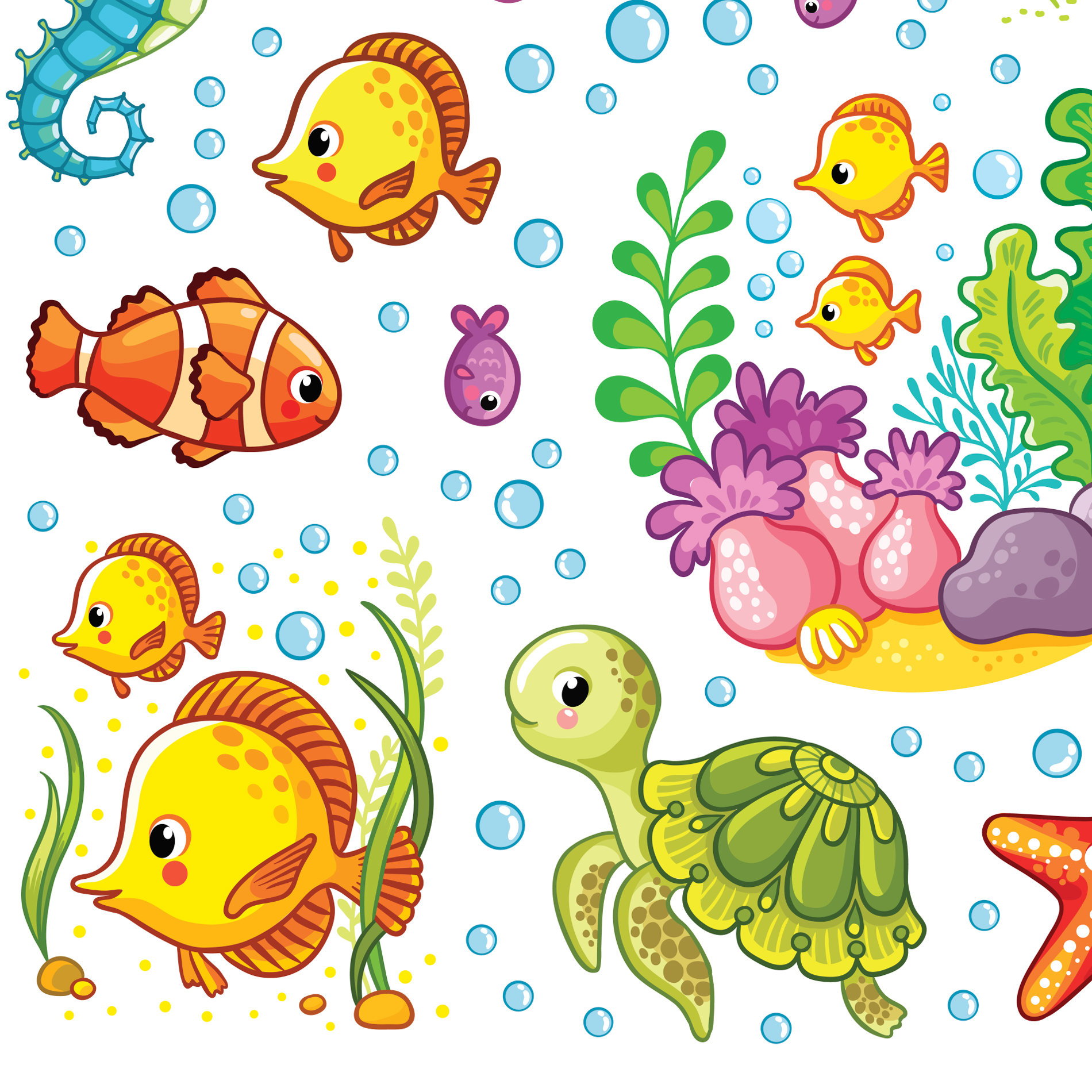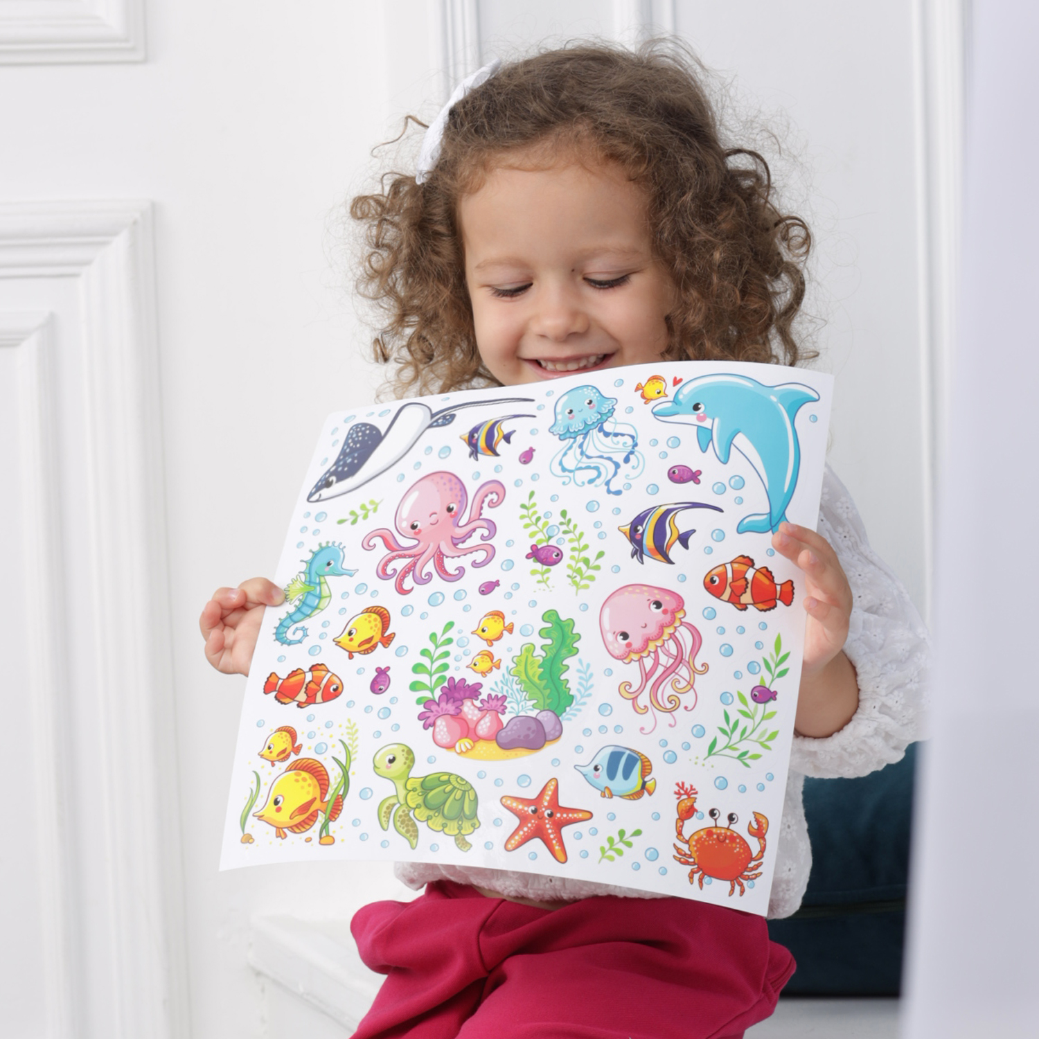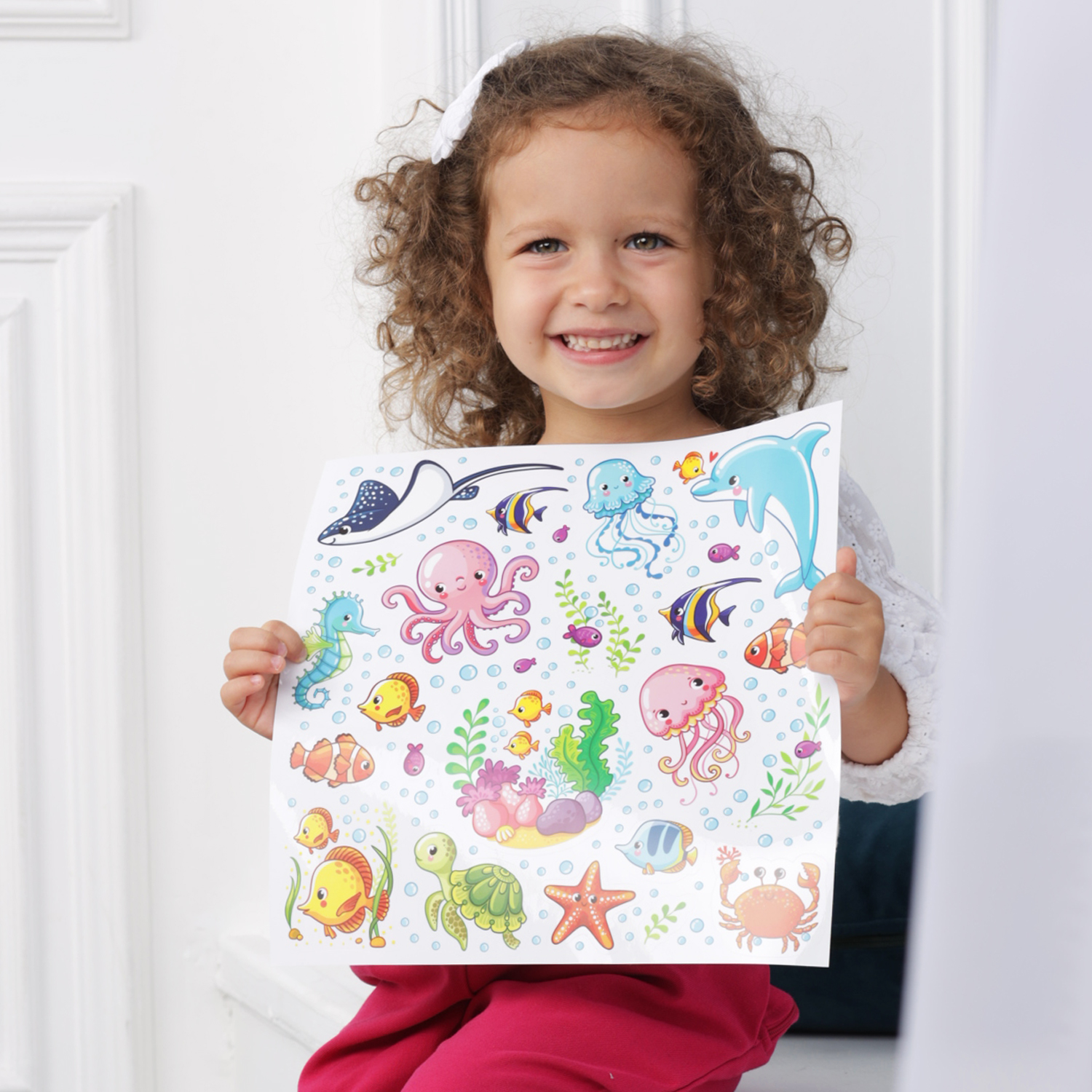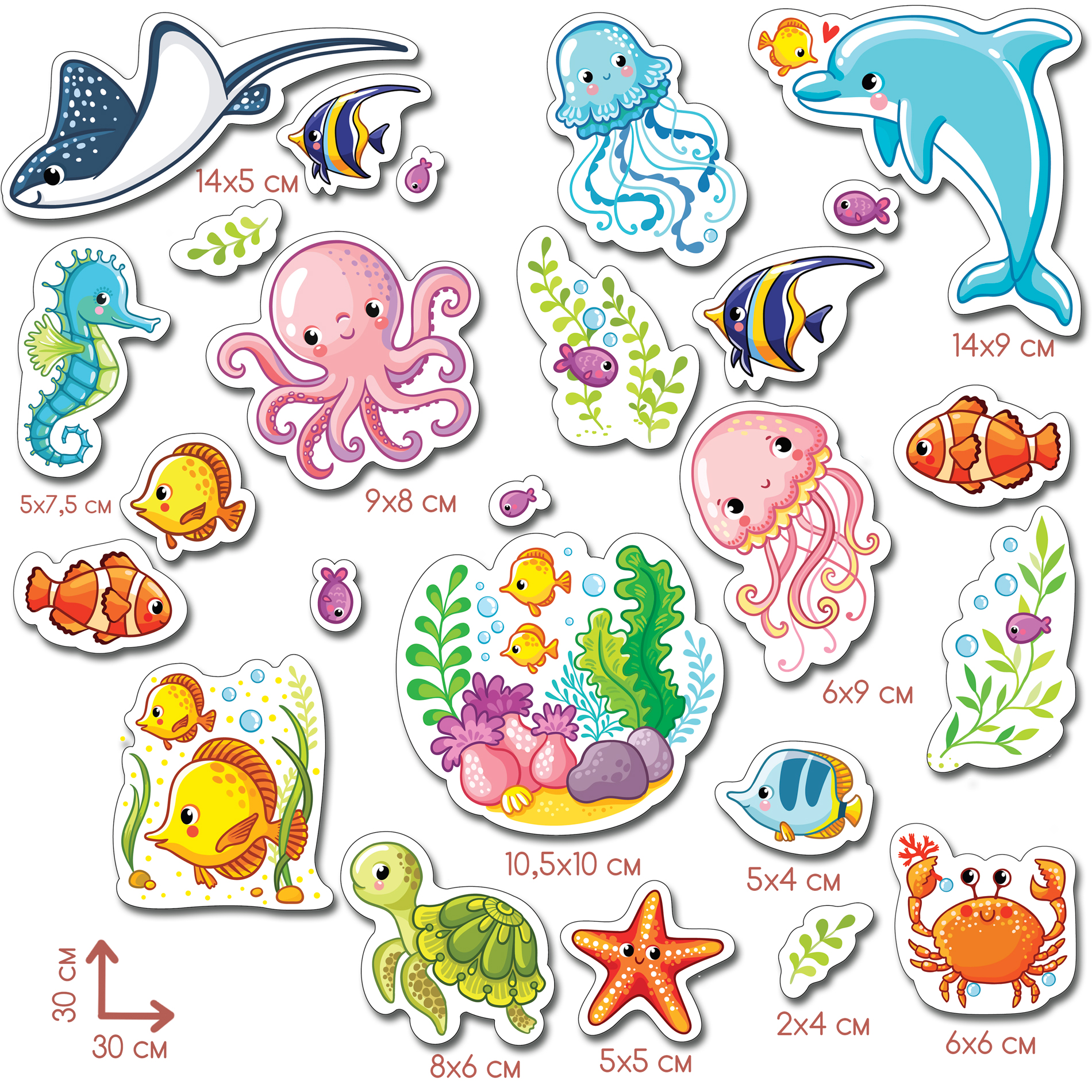 Каждое изображение вырезано отдельно. Наклейки не оставляют следов, их можно переклеивать несколько раз. Яркий декоративный набор для ванны.