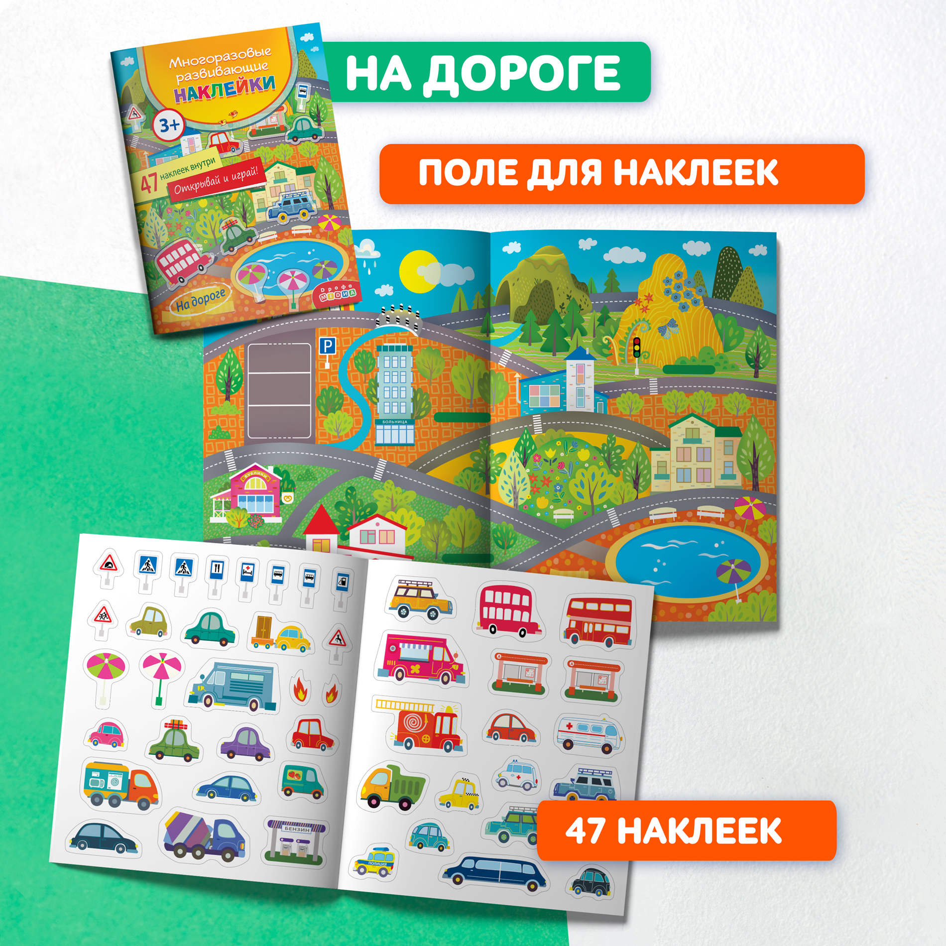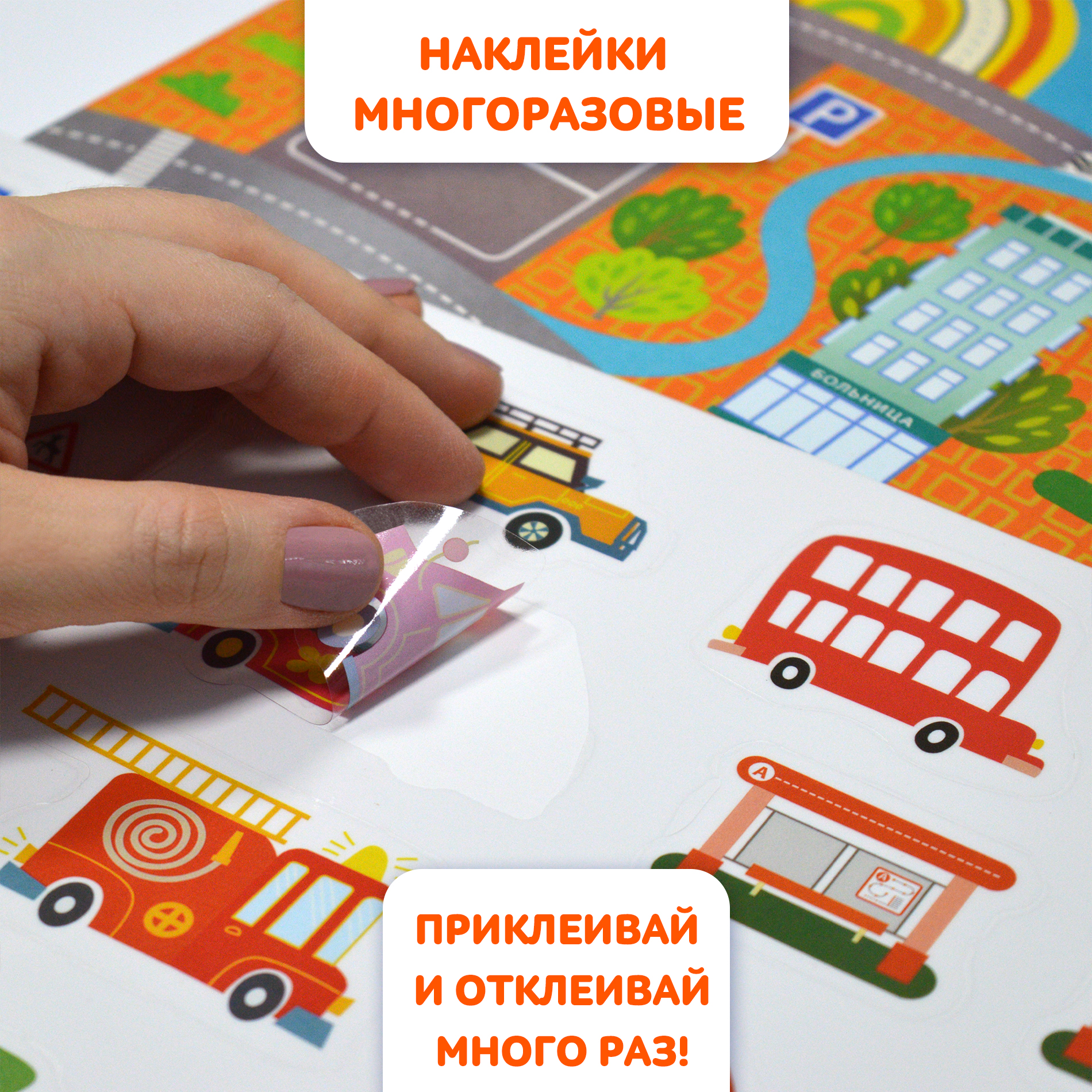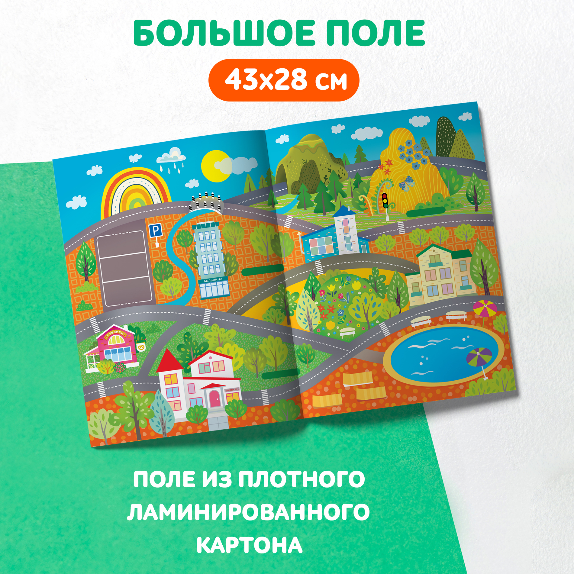Набор для игры с многоразовыми наклейками «На дороге» отлично подойдёт для мальчиков и даже для некоторых девочек. Если раскрыть папку, ребёнок увидит красочное игровое поле — настоящий город с дорогами, пляжной зоной, парковкой, горами, а также больницей, школой и жилыми домами.
