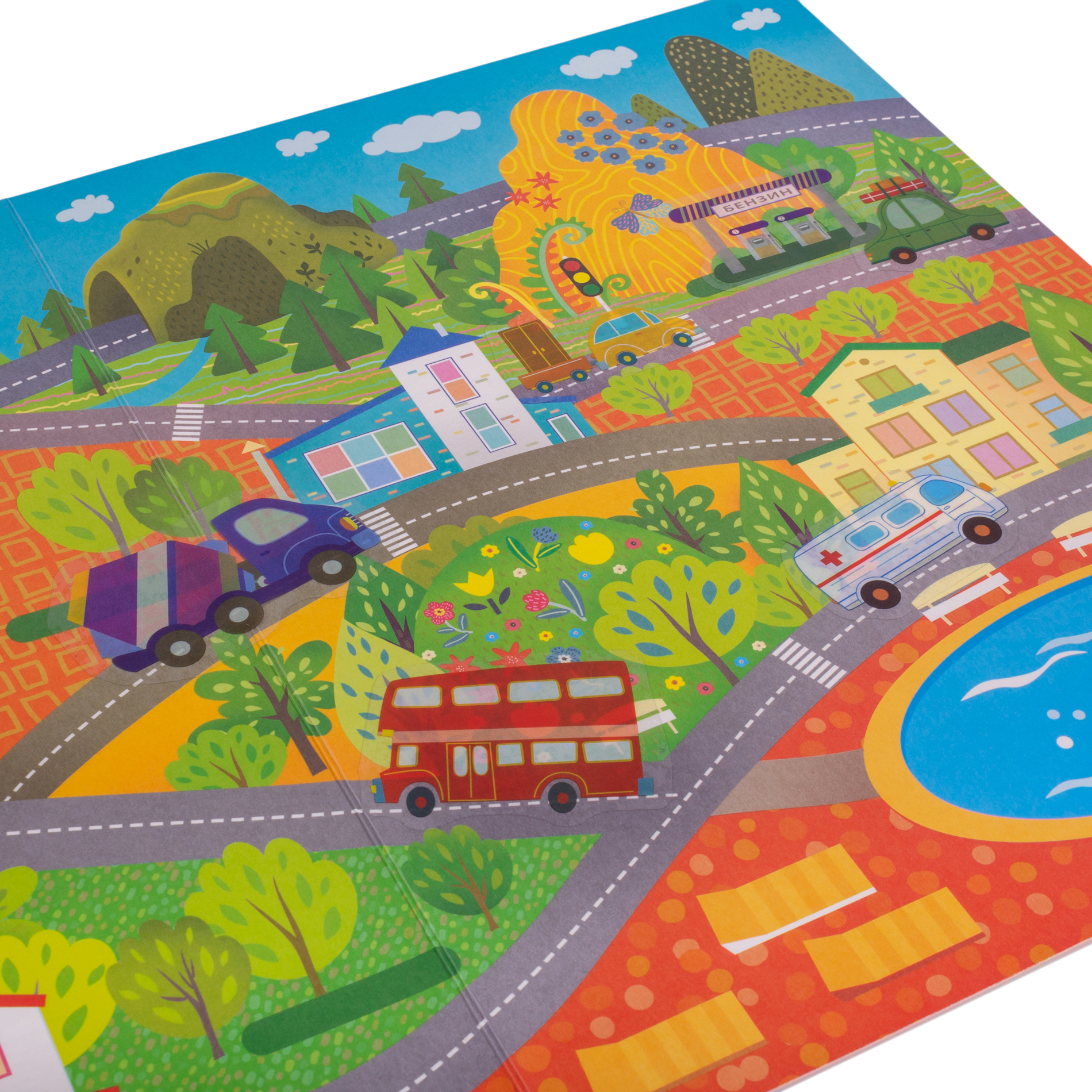 Малыш познакомится с различными видами транспорта — легковыми и грузовыми автомобилями, пожарной машиной и скорой помощью, бетономешалкой и автобусом, а также узнает о дорожных знаках (пешеходный переход, туннель, автобусная остановка), расставит в городе остановки и заправки, и даже «потушит» пожар. Ребёнку будет весело и интересно создавать новую историю каждый день!