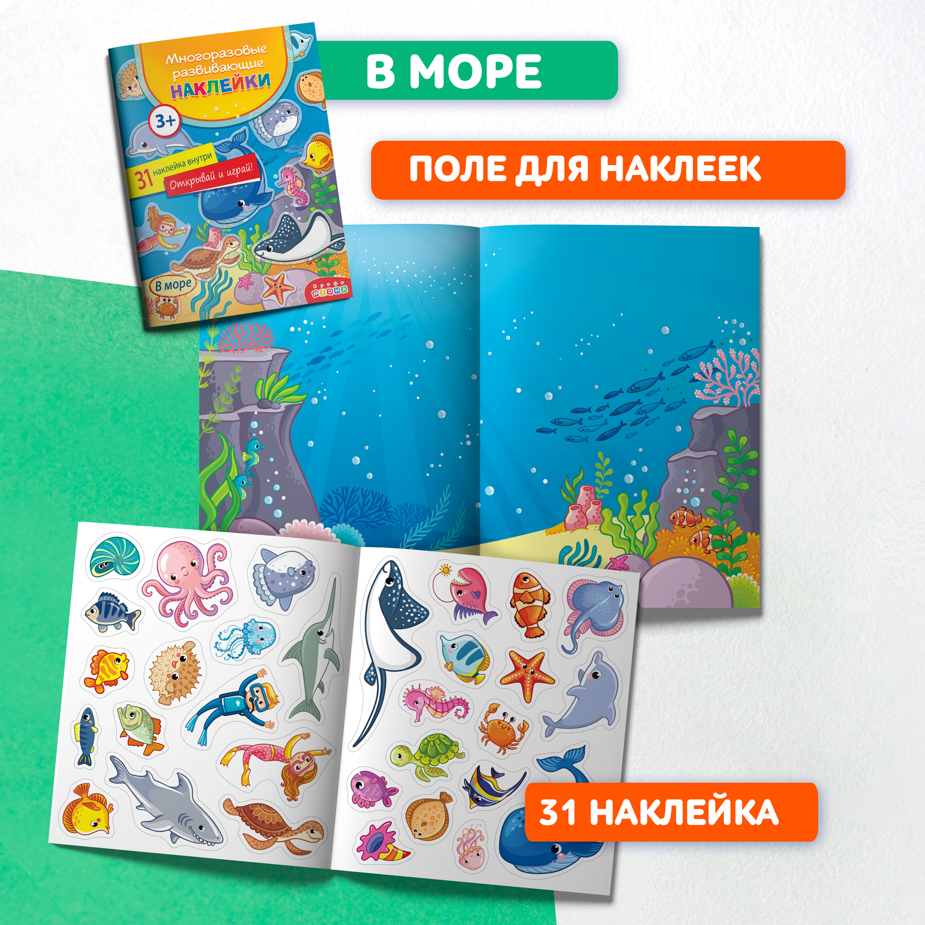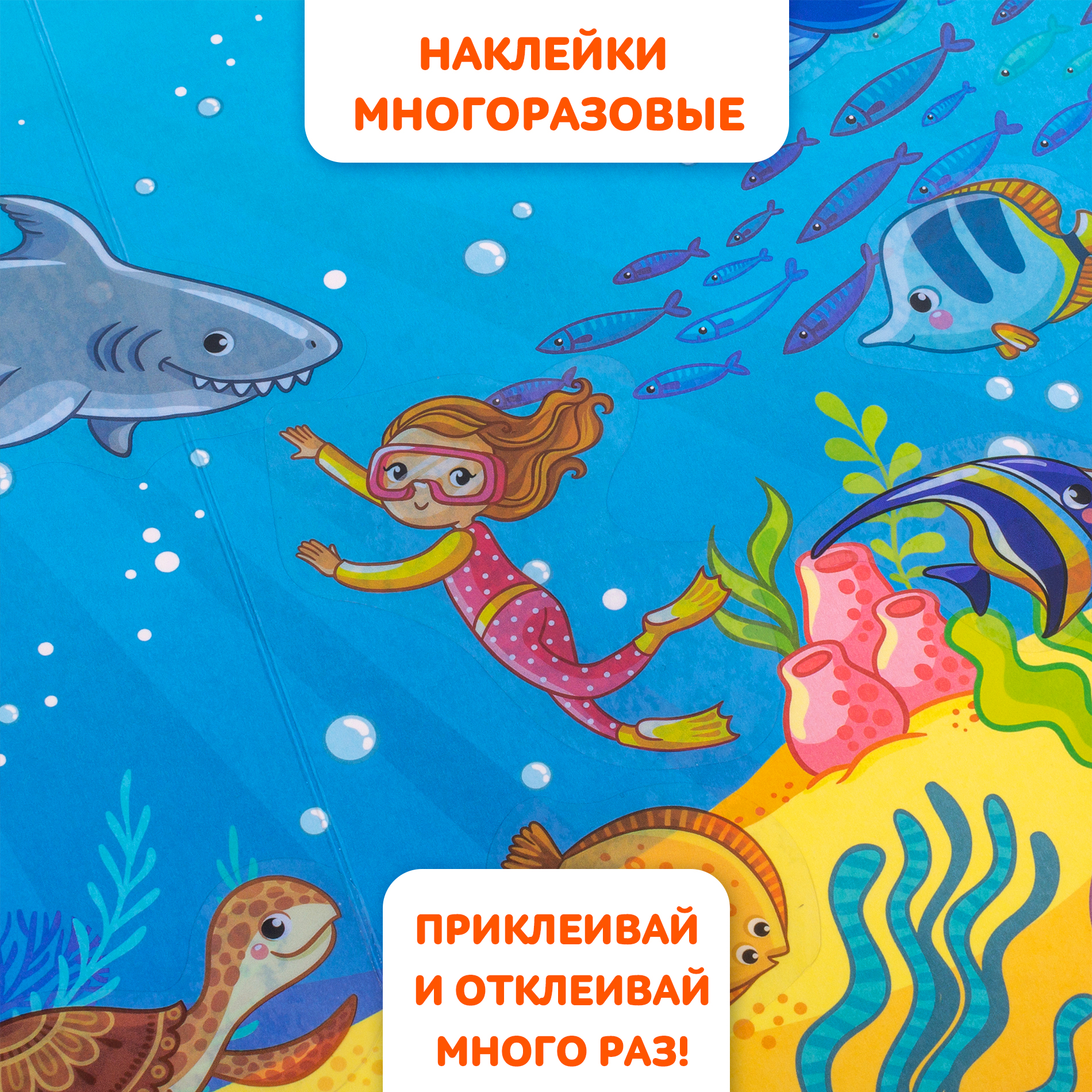 Набор для игры с многоразовыми наклейками «В море» отлично подойдёт для девочек и для мальчиков. Если раскрыть папку, ребёнок увидит красочное игровое поле — дно моря с золотистым песком и разноцветными водорослями.