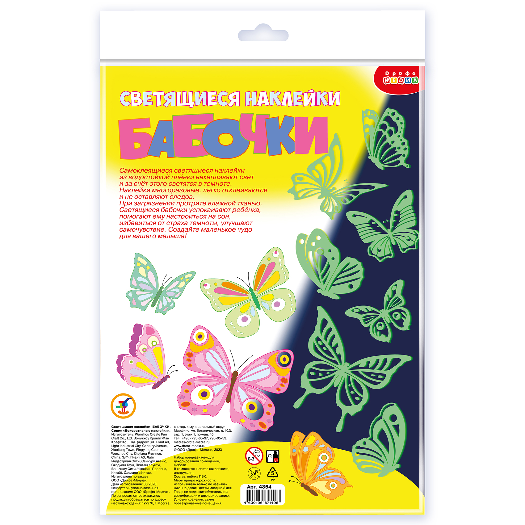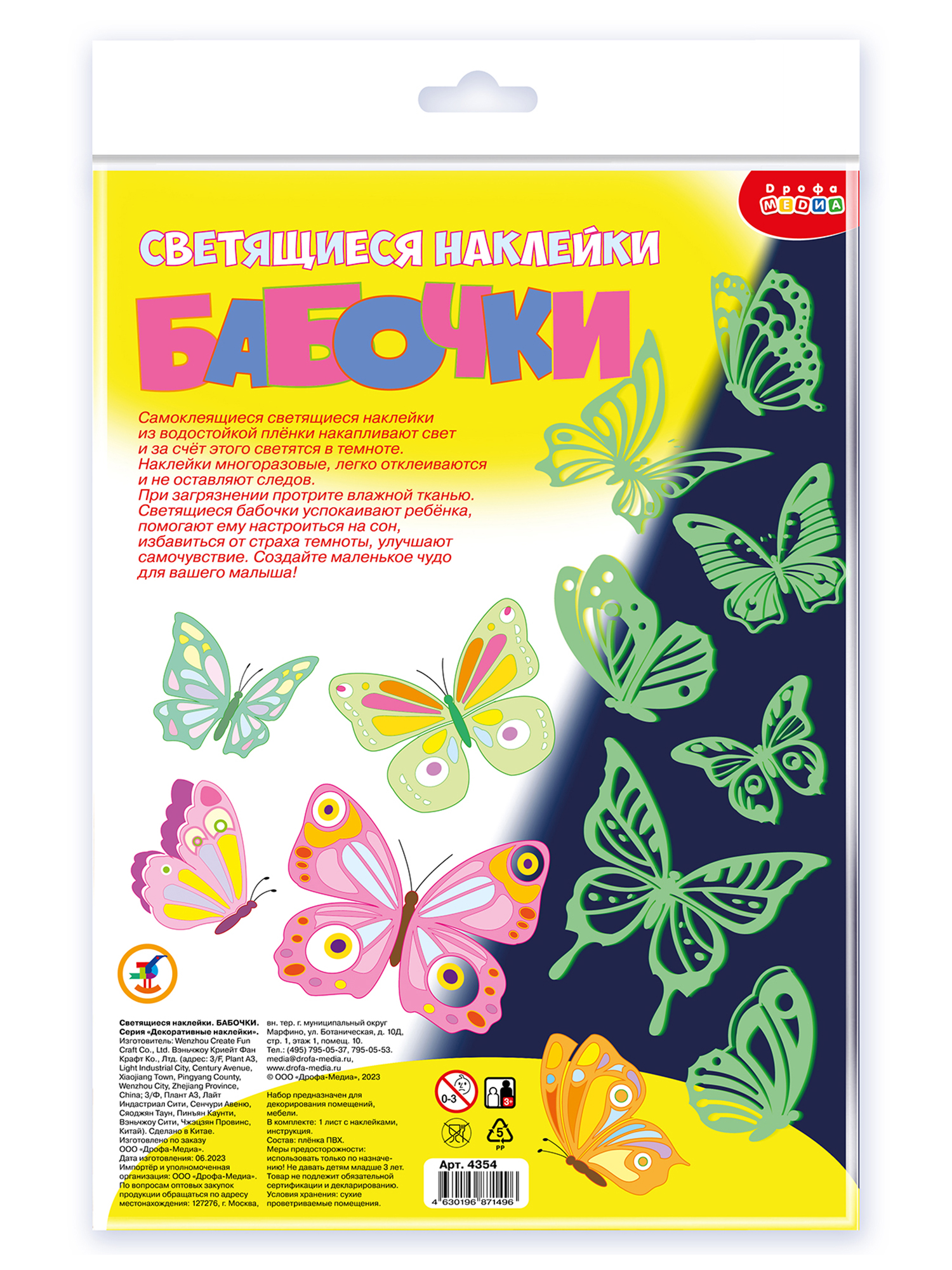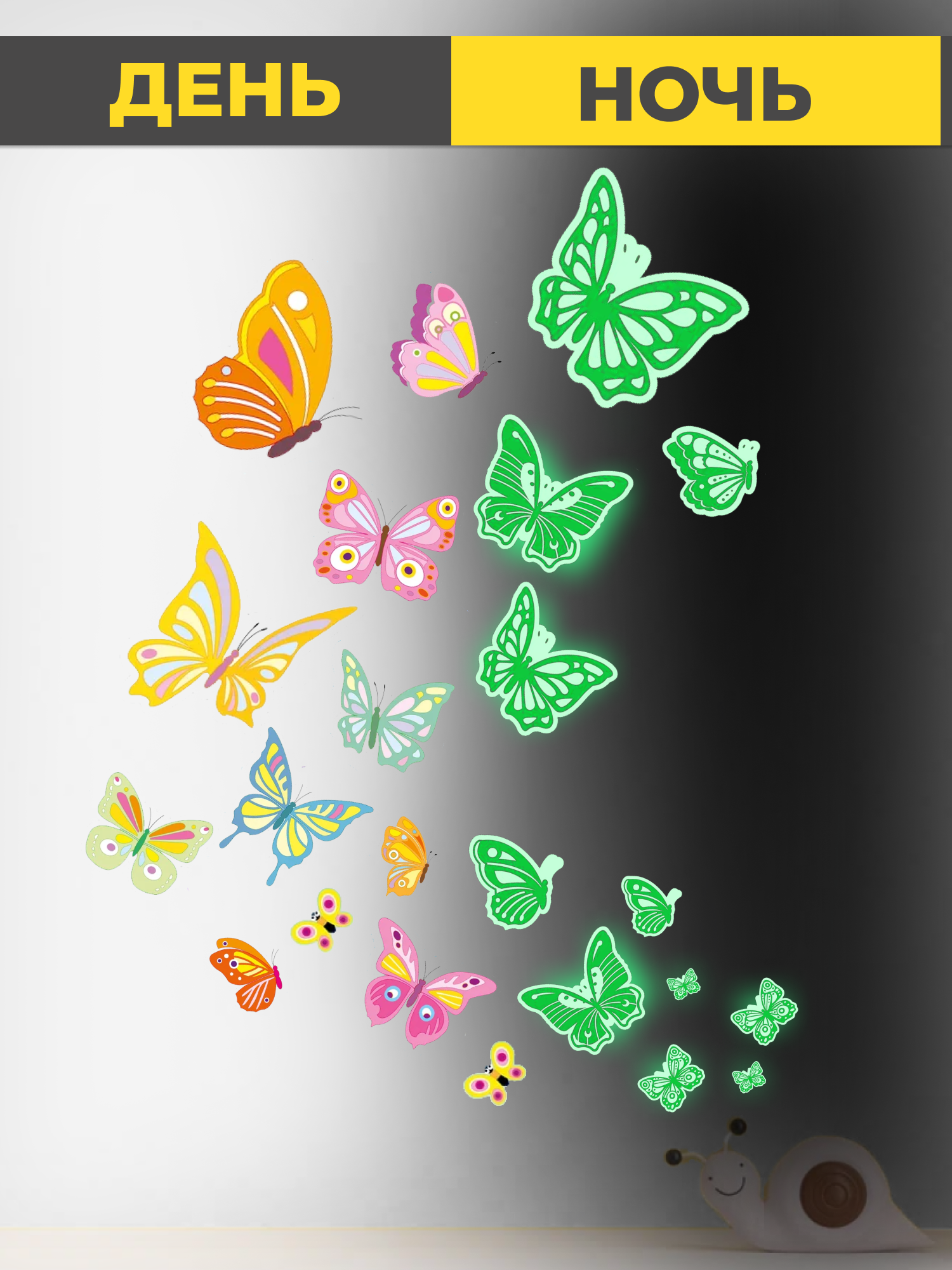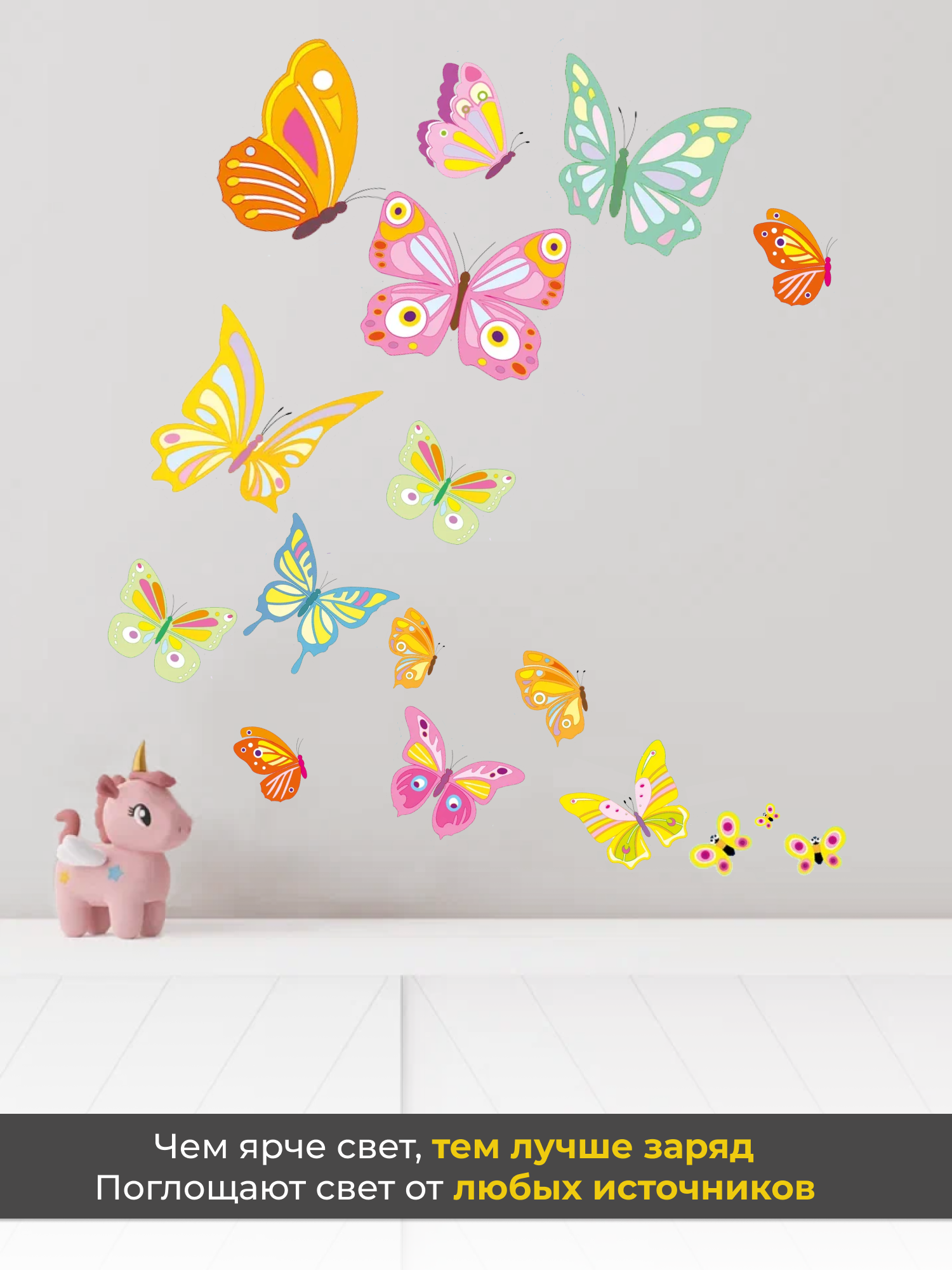 Самоклеящиеся светящиеся наклейки из водостойкой плёнки накапливают тепло и за счёт этого светятся в темноте. Наклейки многоразовые, легко отклеиваются и не оставляют следов. Подходят для украшения детской комнаты, кухни, ванной и т. д. Светящиеся бабочки успокаивают ребенка, помогают ему настроиться на сон, избавиться от страха темноты, улучшают настроение.