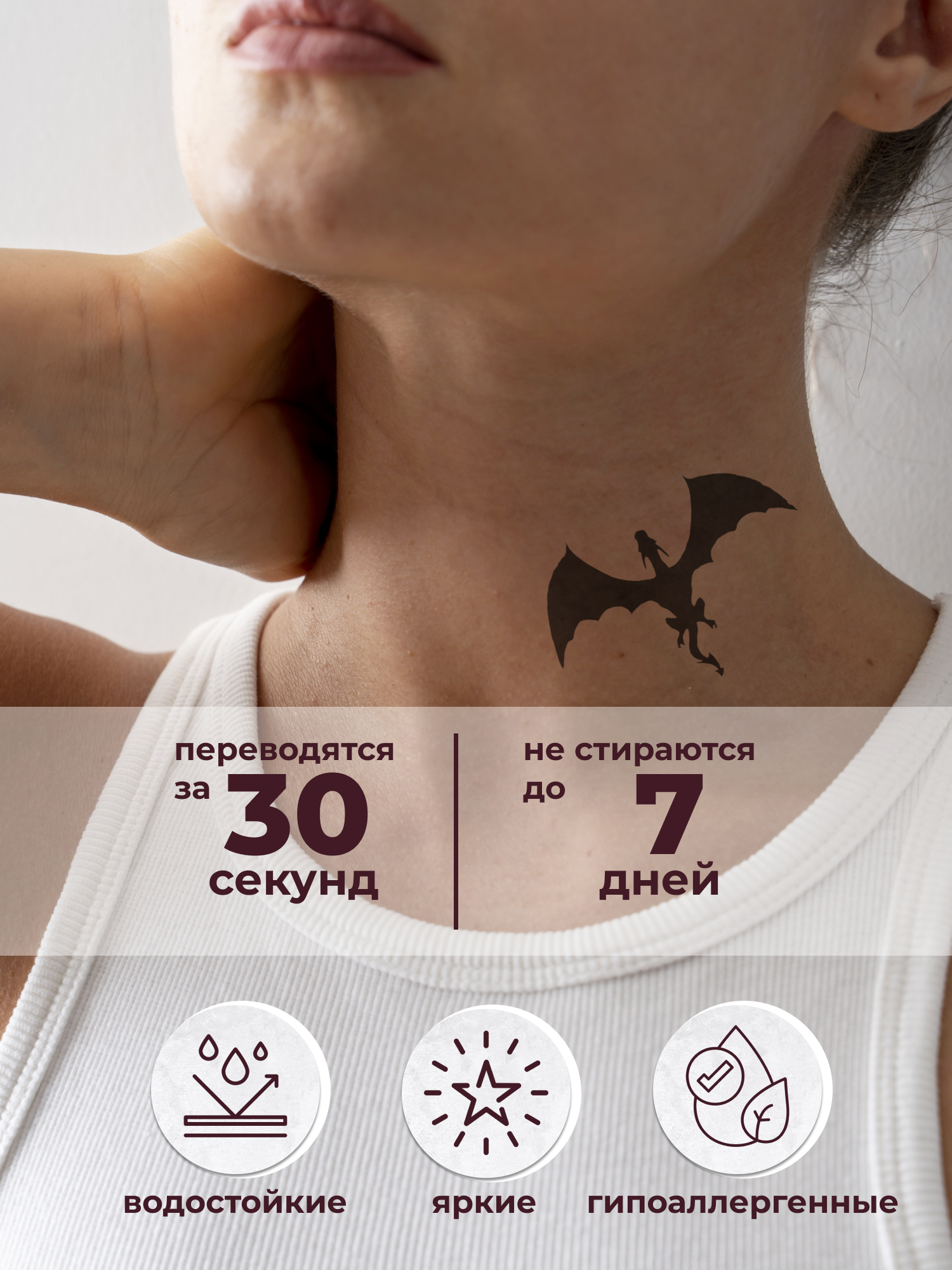 Татуировка держится от 1 до 7 дней, не боится воды, не раздражает кожу.