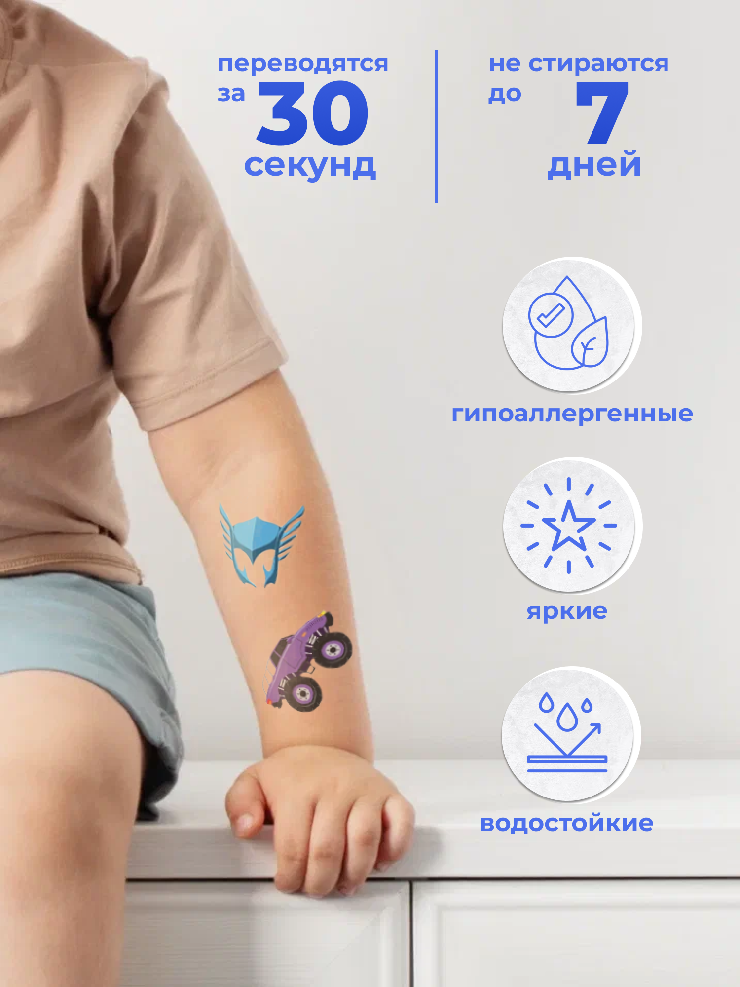 Татуировка держится от 1 до 7 дней, не боится воды, не раздражает кожу.