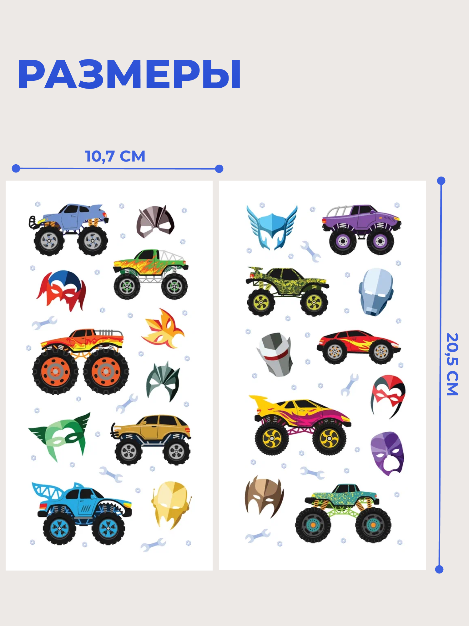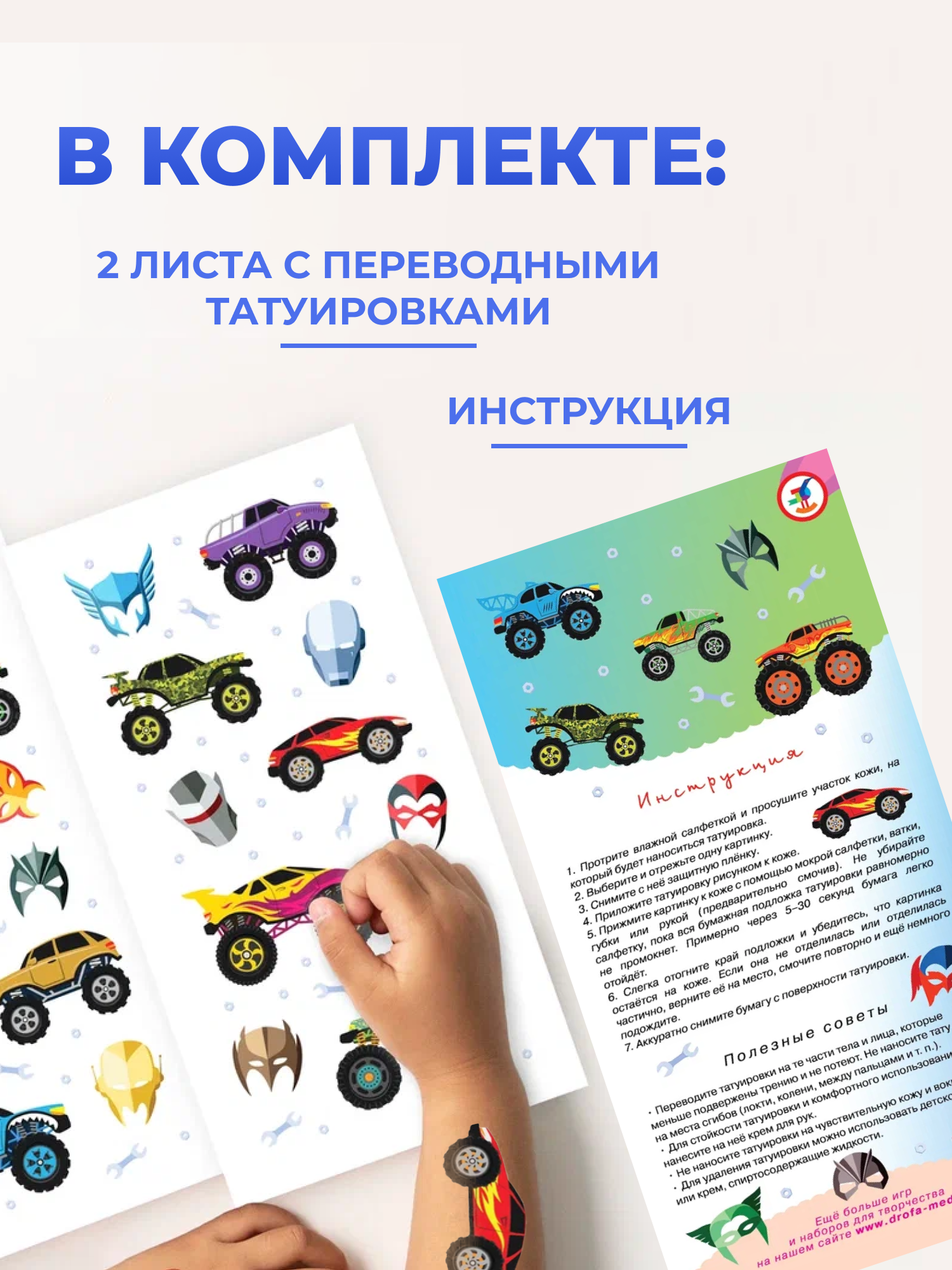В комплекте: 2 листа с переводными татуировками, инструкция.