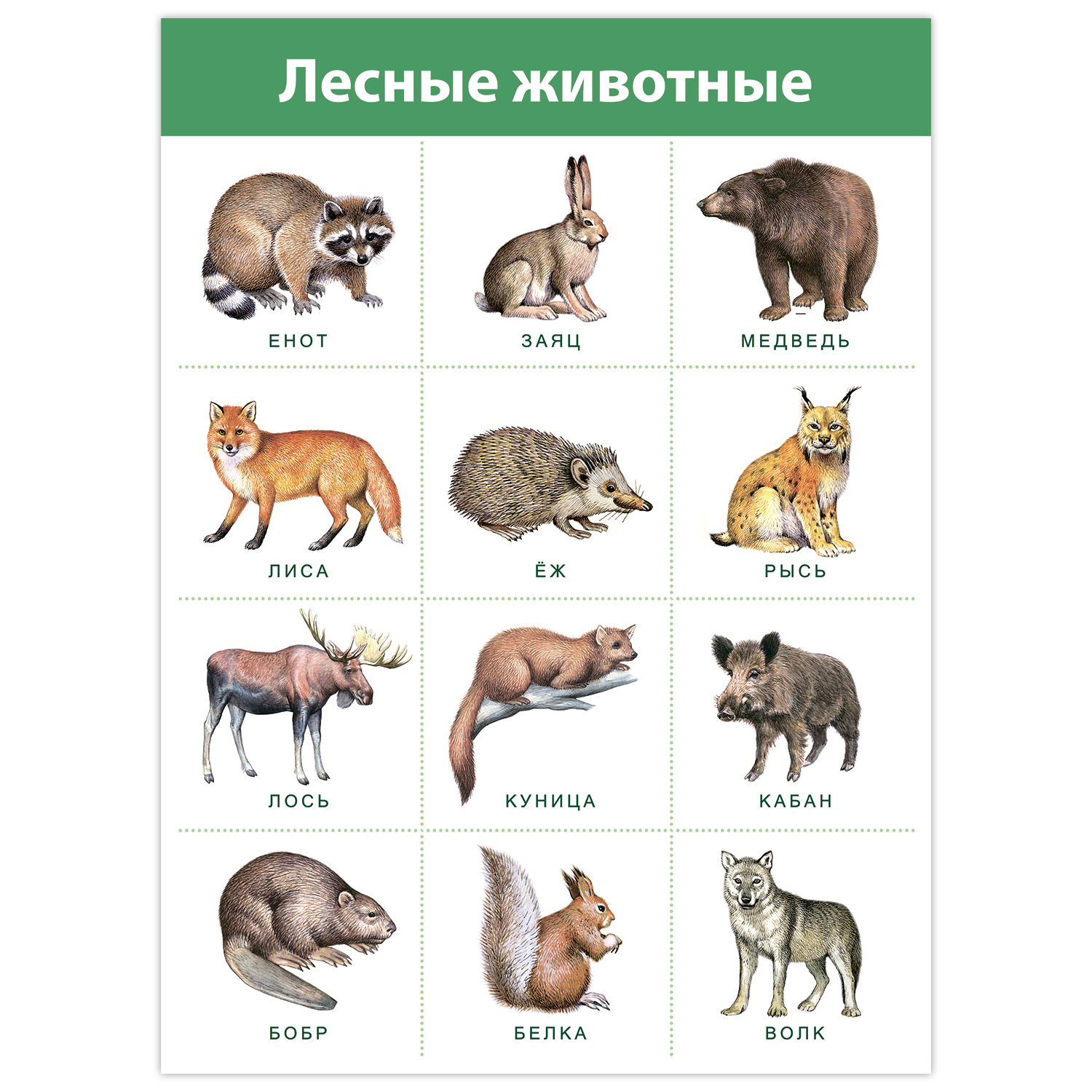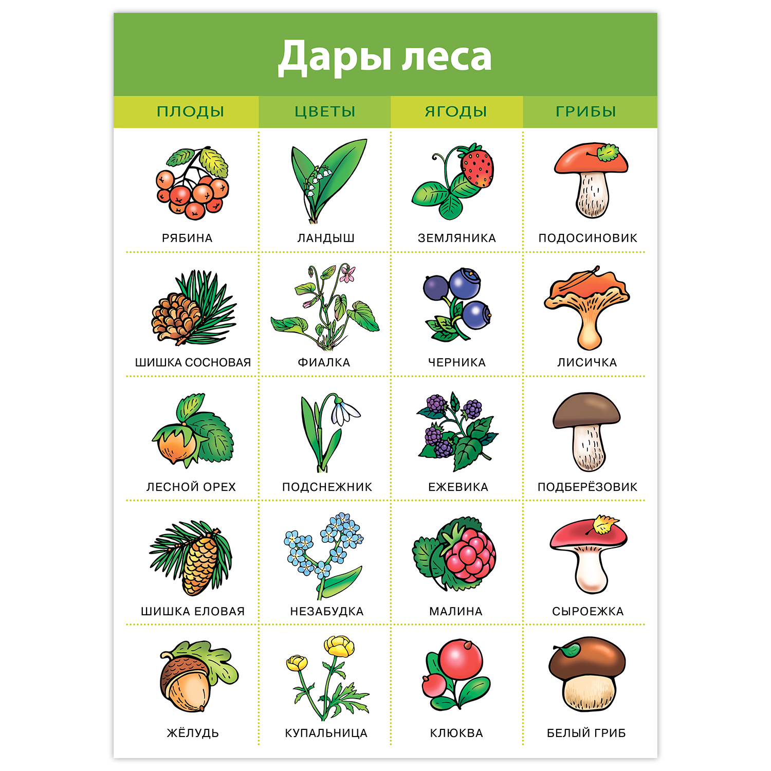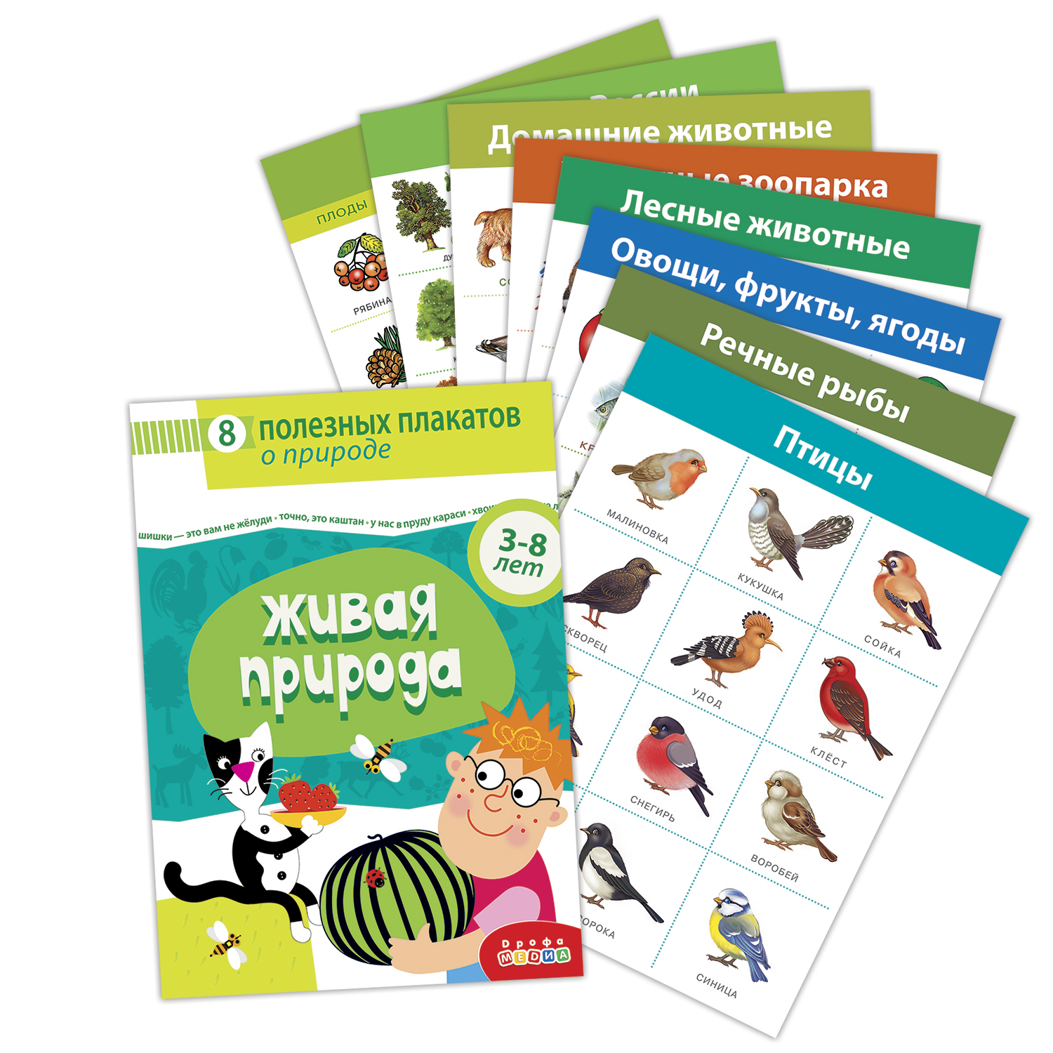 Плакаты из комплекта «Живая природа» помогут сформировать представление о мире растений и животных. Ребёнок научится различать виды зверей, птиц, рыб, запомнит названия любимых фруктов и ягод.
