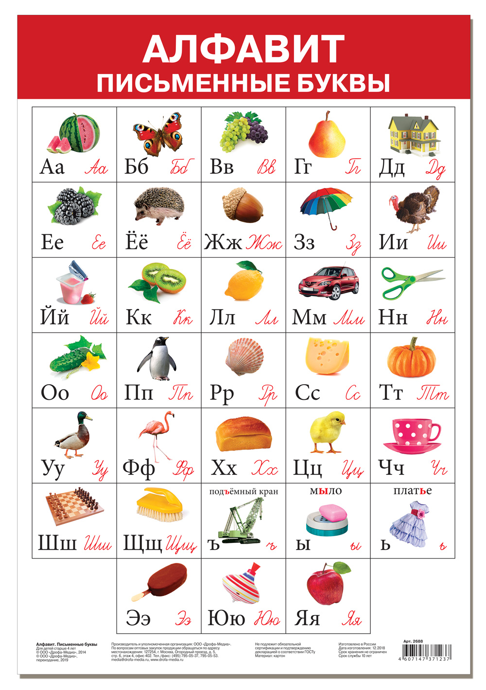 Плакат знакомит с образом печатных и письменных букв, учит определять первый звук в слове. Для детей, начинающих обучение письму. Плакат поможет при подготовке ребёнка к школе.