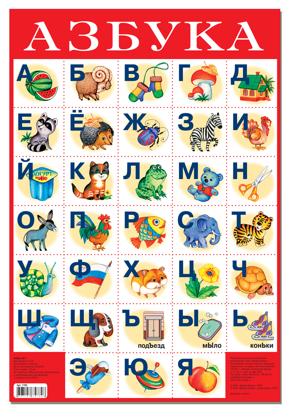 Плакат можно использовать для обучения и развития детей дома, в детском саду или в школе. Азбука знакомит детей с буквами русского алфавита, учит определять первый звук в слове.