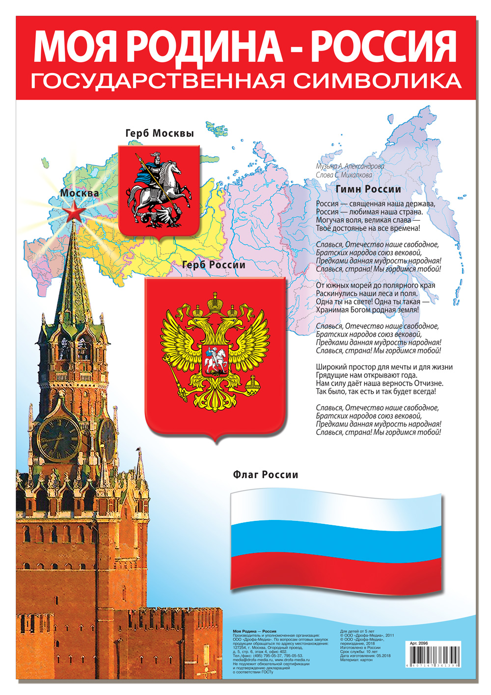 Плакат можно использовать для обучения и развития детей дома, в детском саду или в школе. Плакат знакомит с государственными символами России: флагом, гербом и гимном, Московским Кремлём и московским гербом.