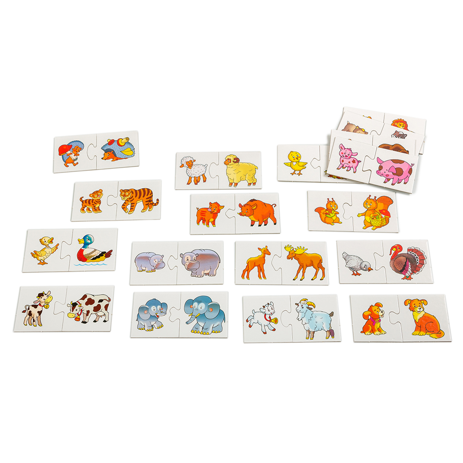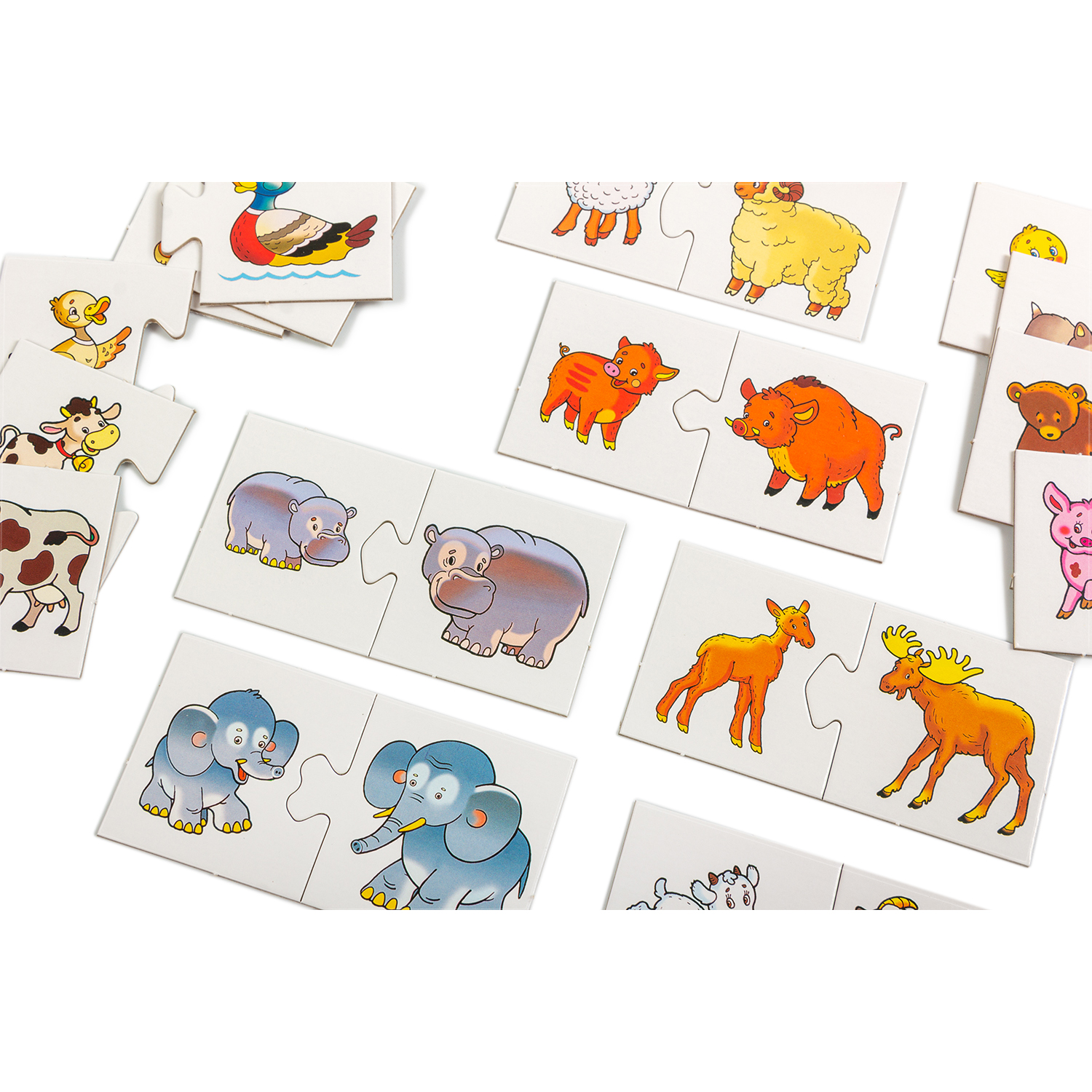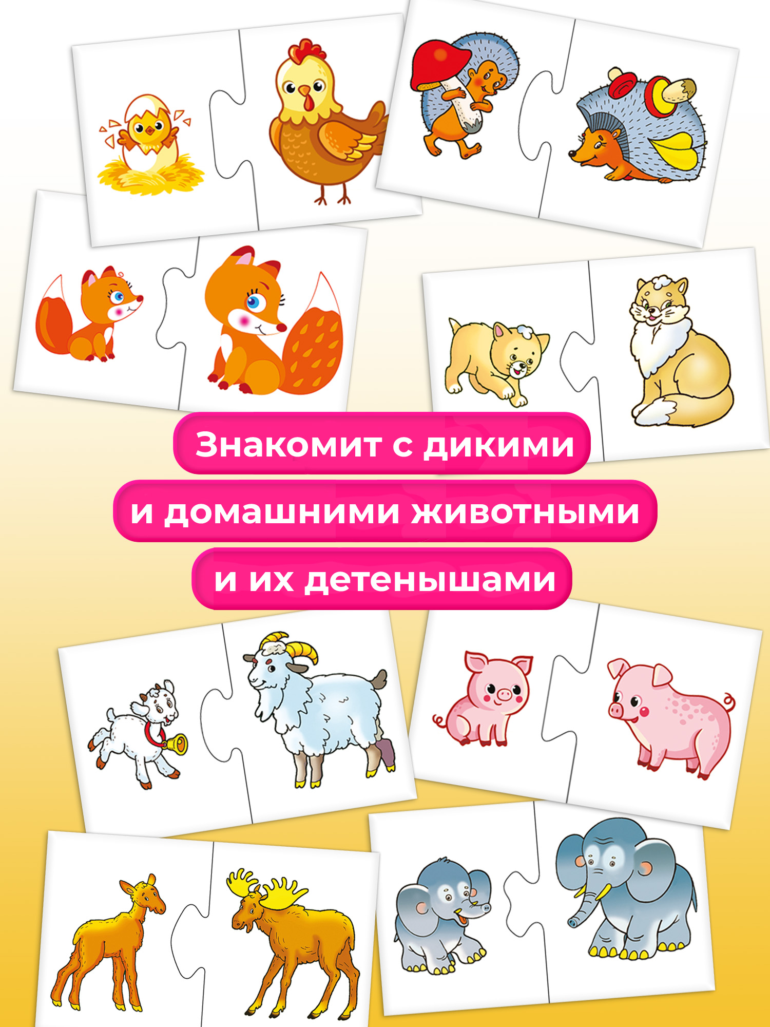 Игра знакомит с дикими и домашними животными, названиями детёнышей, учит соотносить взрослых животных и малышей, развивает внимание, речь, мелкую моторику, навыки самопроверки. Фигурная форма карточек поможет проверить, правильно ли подобраны картинки: если допущена ошибка, пазловый замок не соединится.