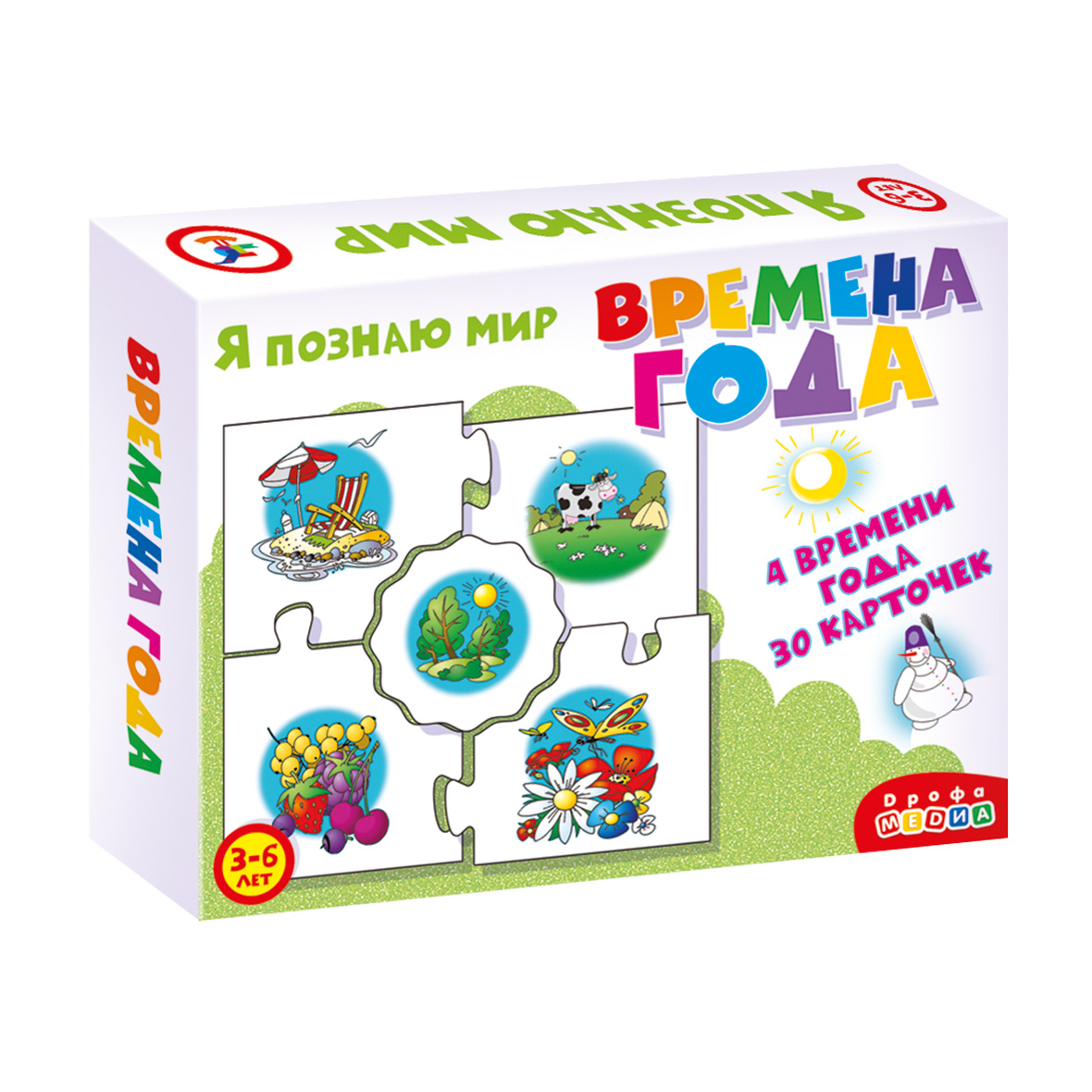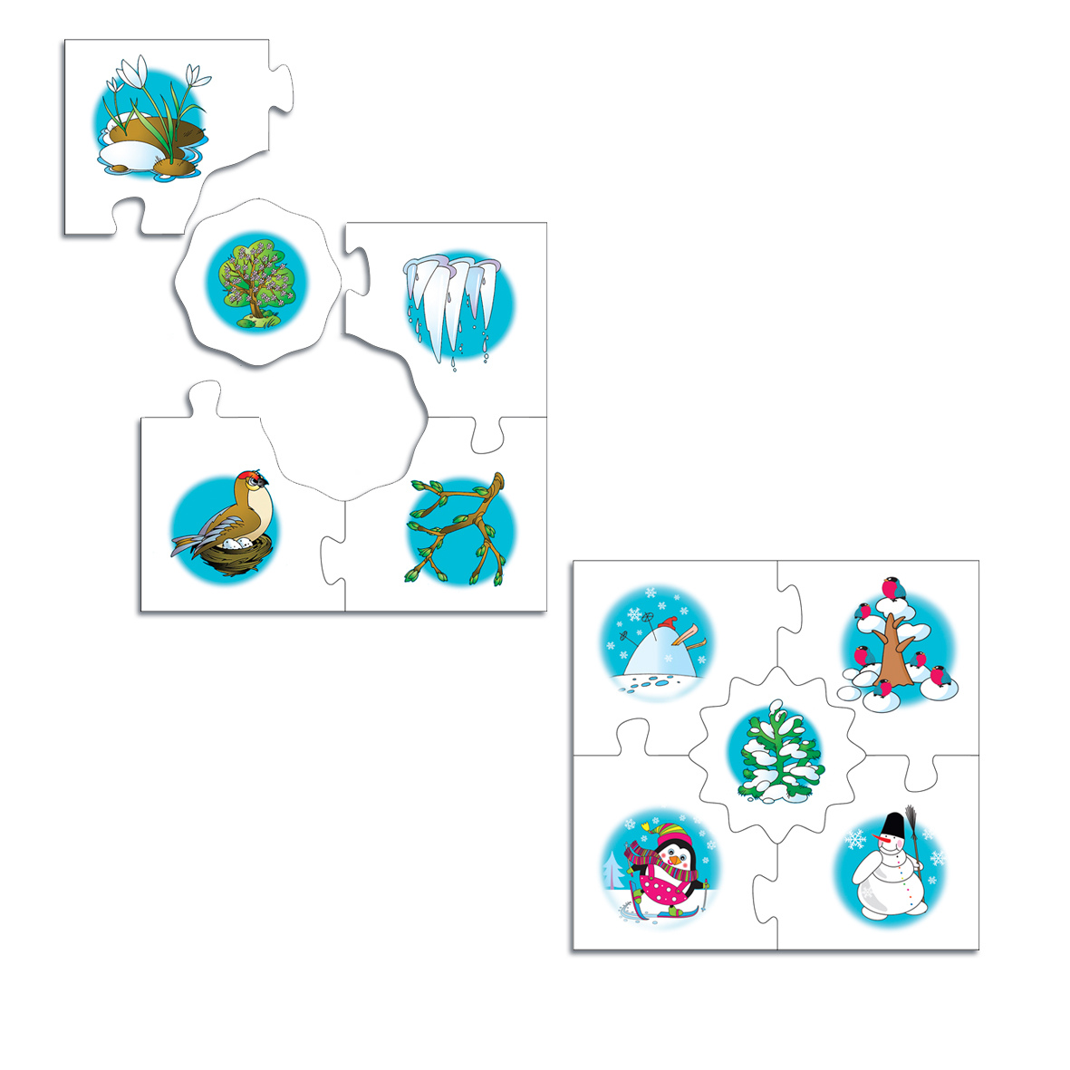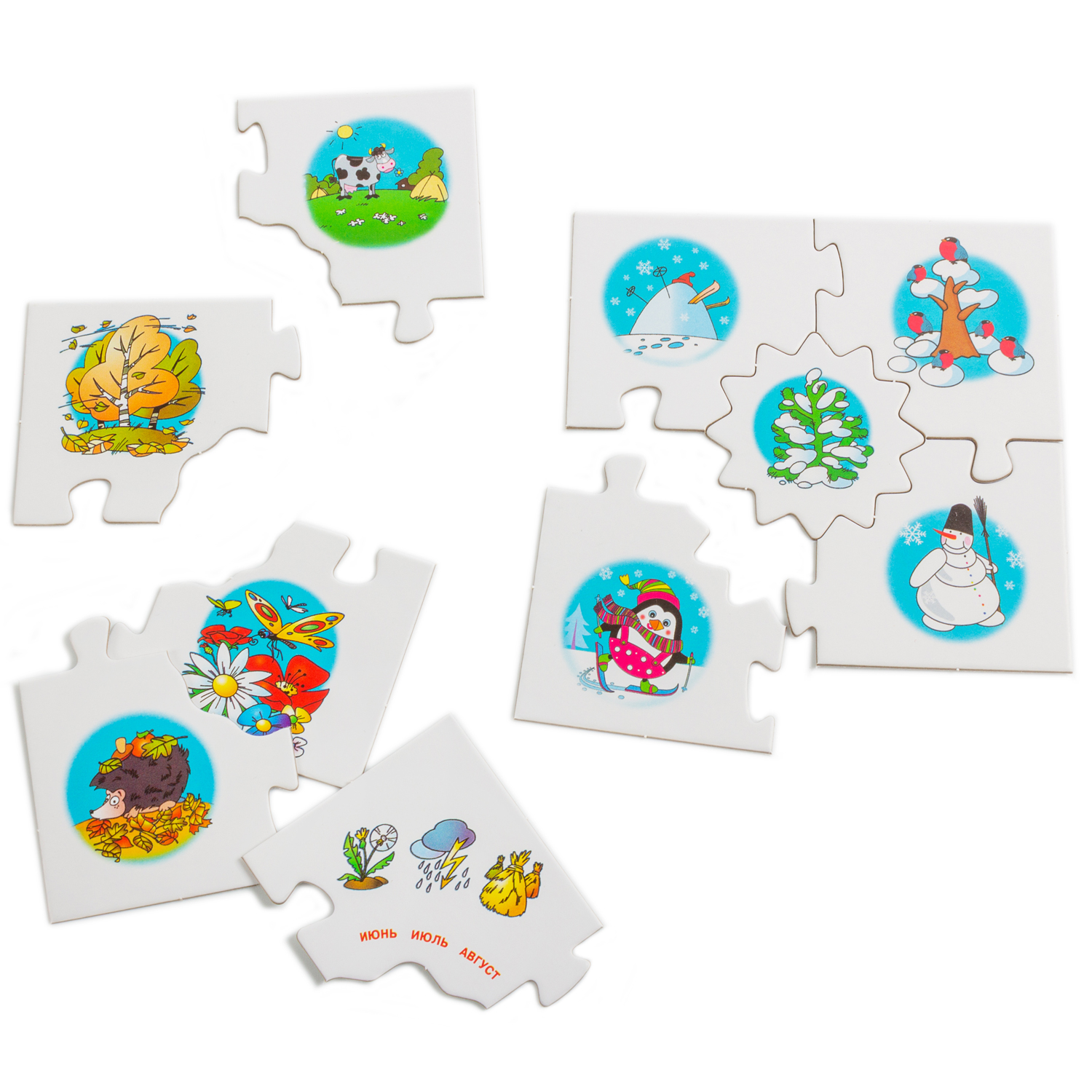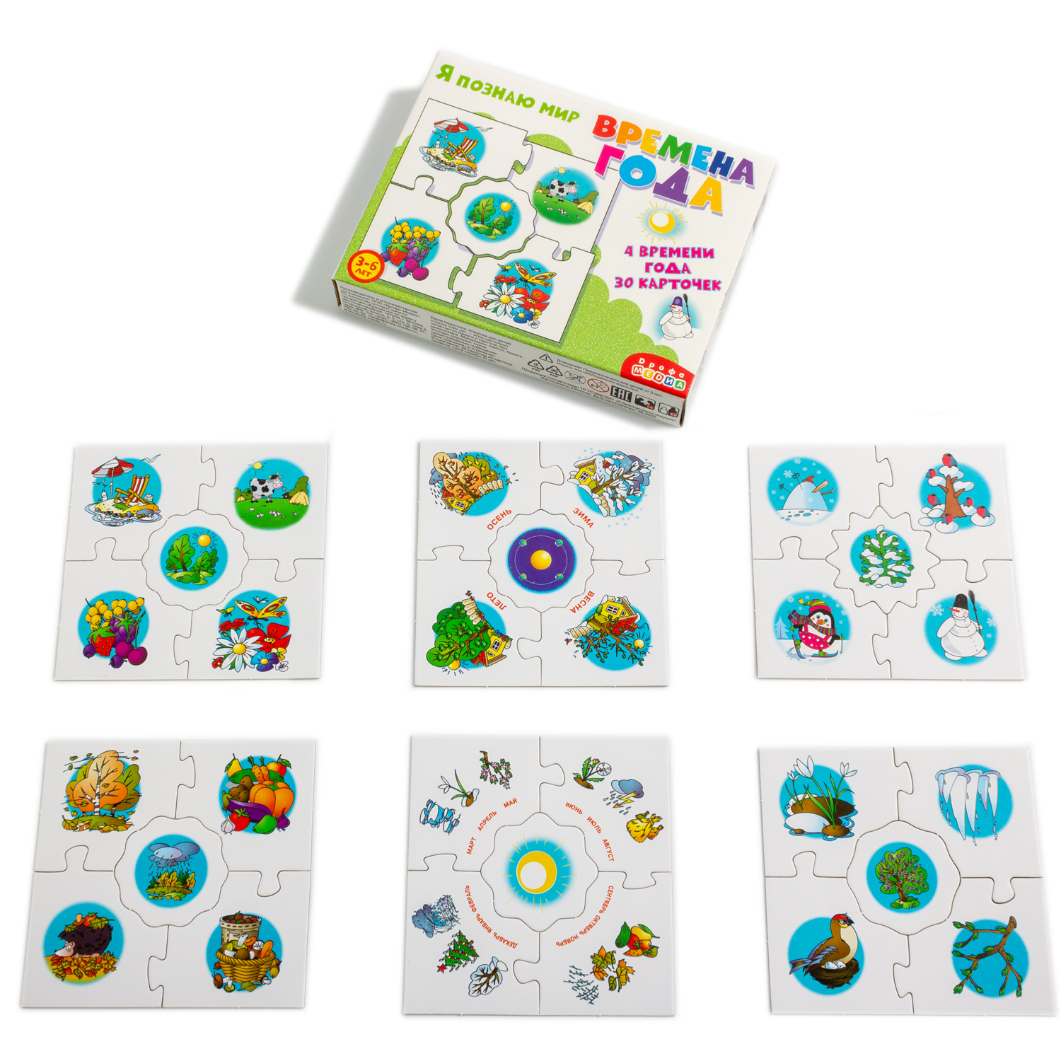 Игра знакомит ребенка с сезонными изменениями, учит сравнивать предметы, анализировать информацию, устанавливать закономерности, развивает наблюдательность, интерес к окружающему миру, навыки самоконтроля. Задача игрока – собрать вокруг центральной карточки с изображением одного из времён года четыре карточки с явлениями, характерными для этого периода. Фигурная форма карточек поможет проверить, правильно ли подобраны картинки: если допущена ошибка, пазловый замок не соединится.