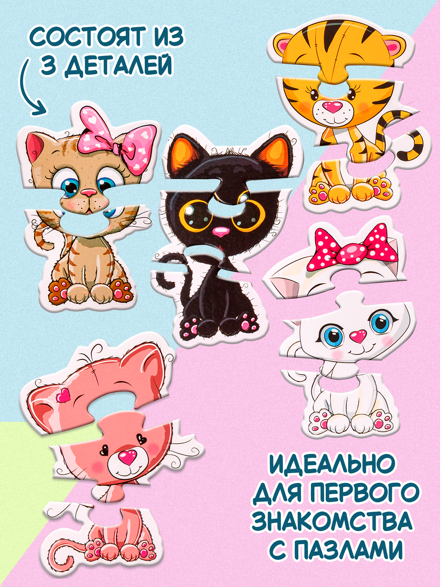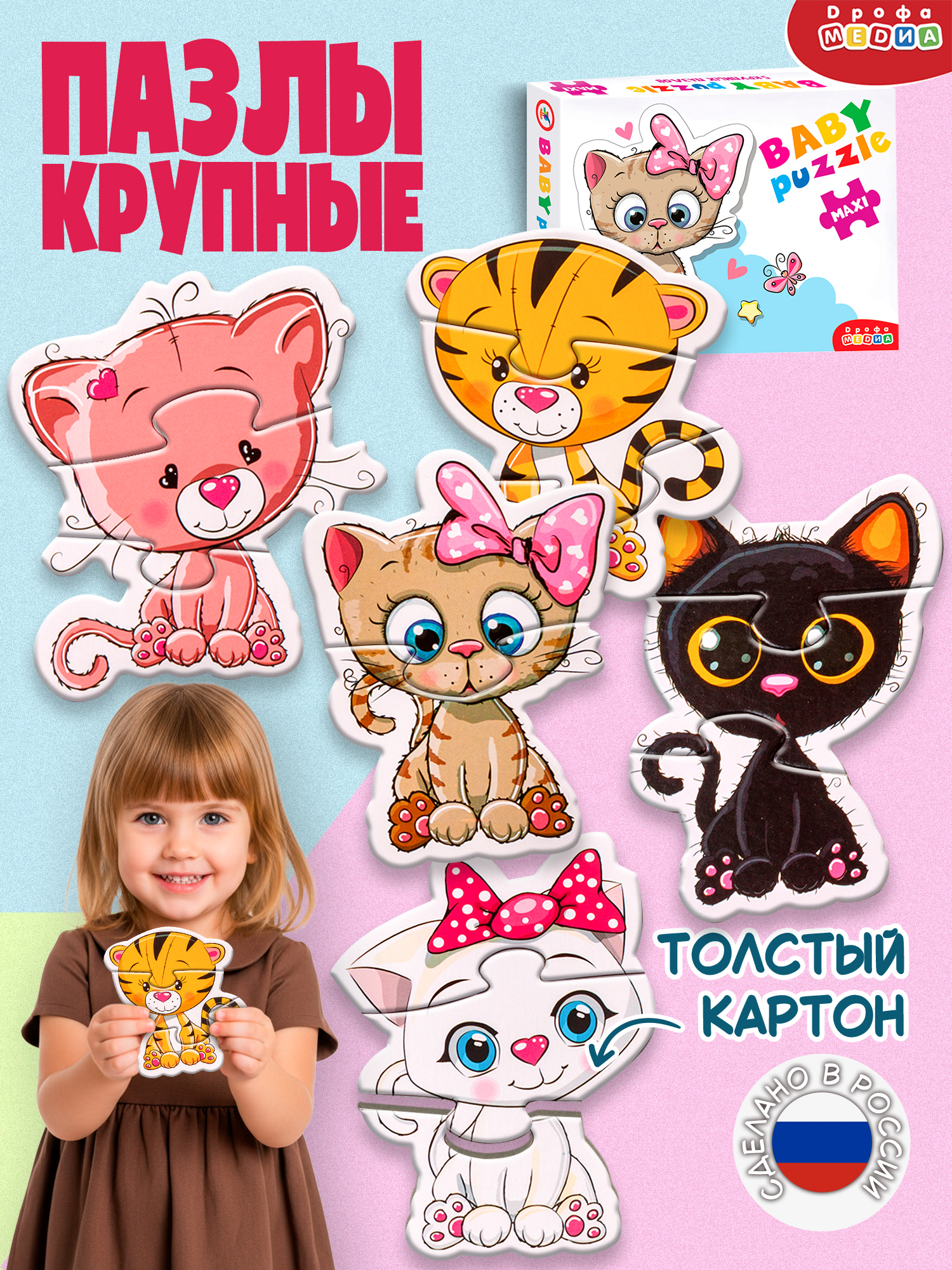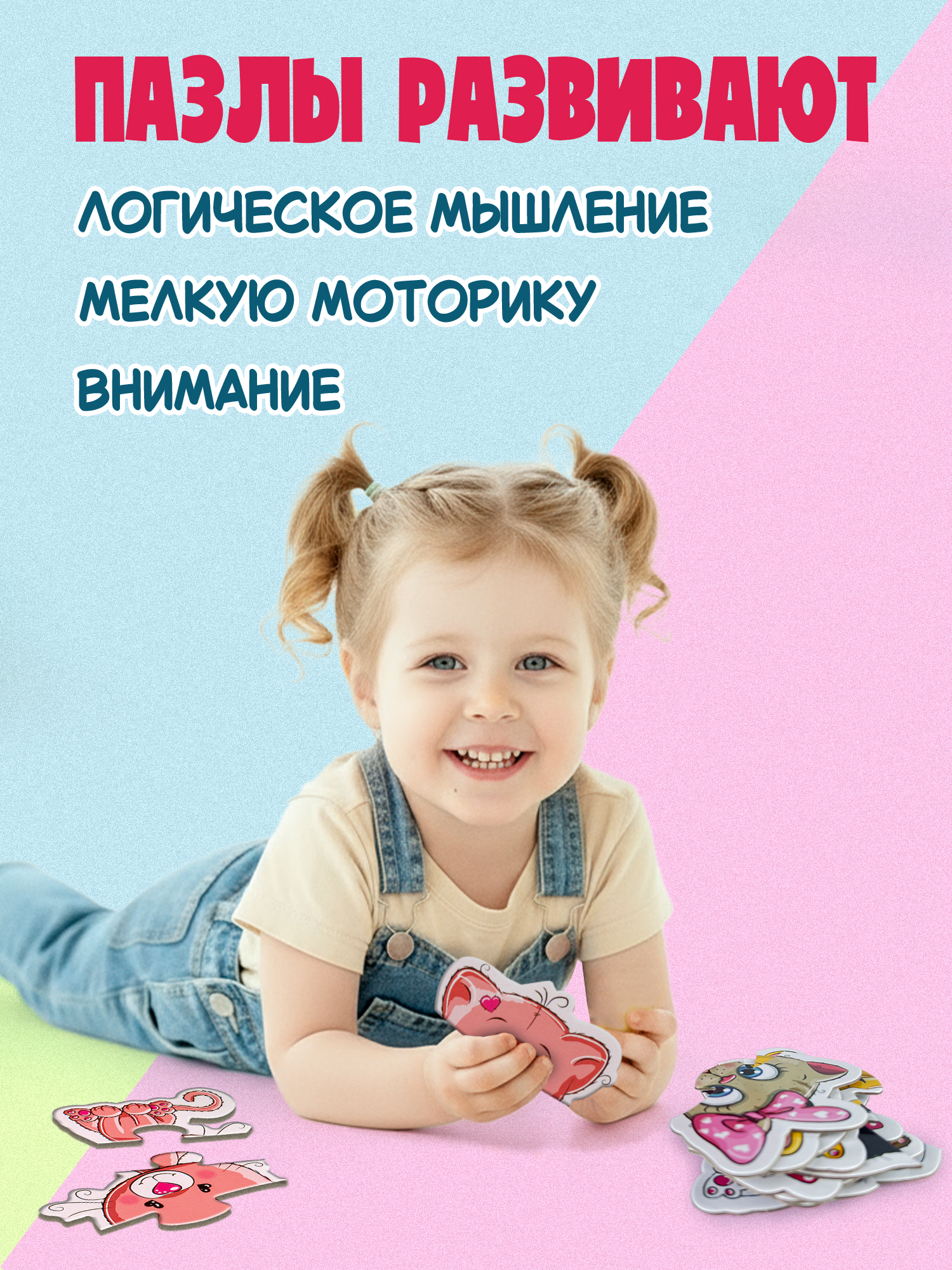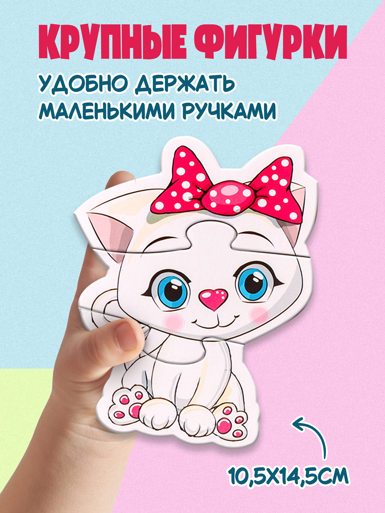 Крупные пазлы подходят для самых маленьких и помогут разнообразить занятия с ребёнком, сделать их интересными и полезными. В наборе 5 фигурок животных, разделённых на 2-3 элемента. Яркие узнаваемые картинки привлекут внимание малыша, а крупные детали из плотного картона помогут в развитии мелкой моторики.