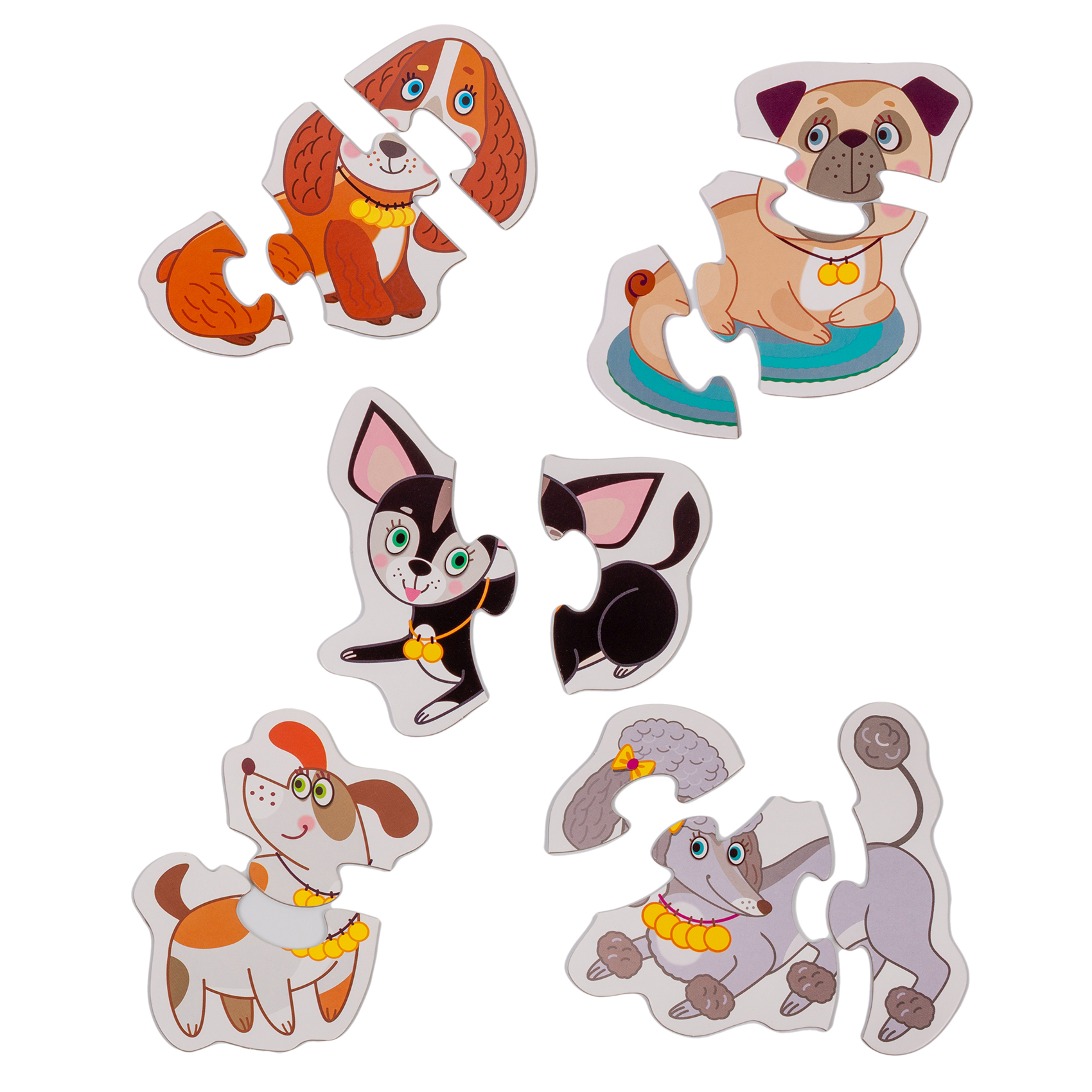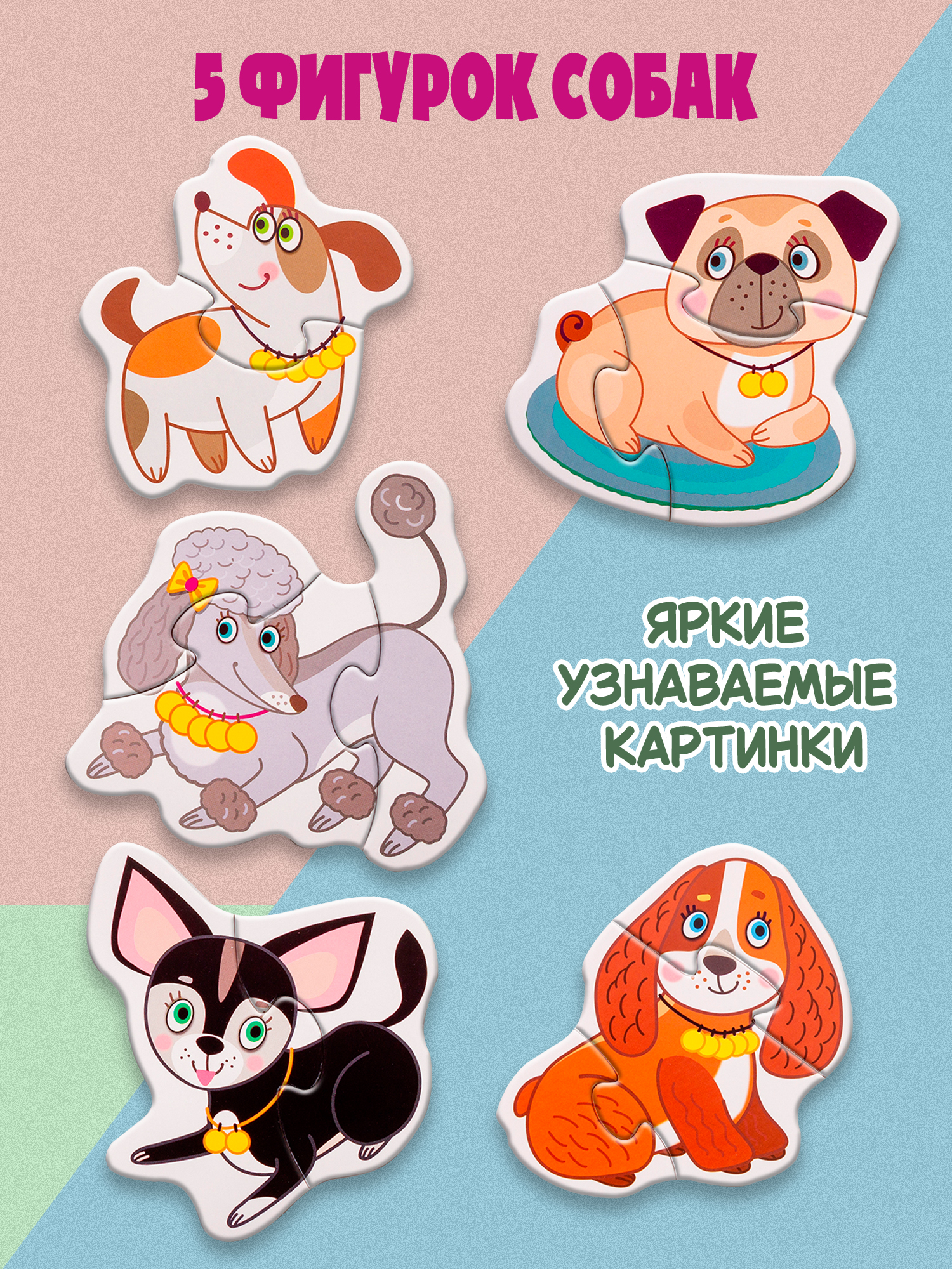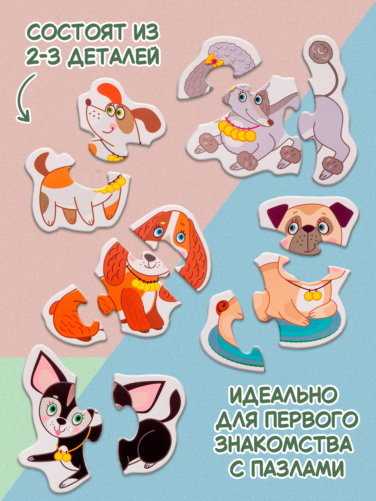 Крупные пазлы подходят для самых маленьких и помогут разнообразить занятия с ребёнком, сделать их интересными и полезными. В наборе 5 фигурок собачек, разделённых на 2-3 элемента. Яркие узнаваемые картинки привлекут внимание малыша, а крупные детали из плотного картона помогут в развитии мелкой моторики.