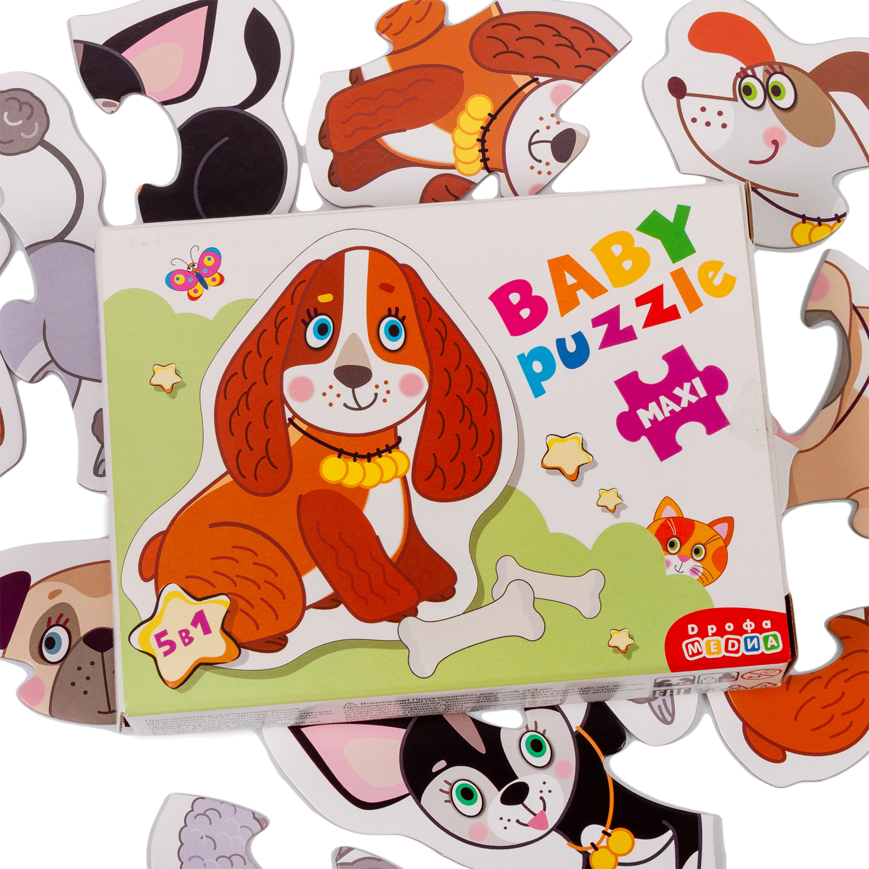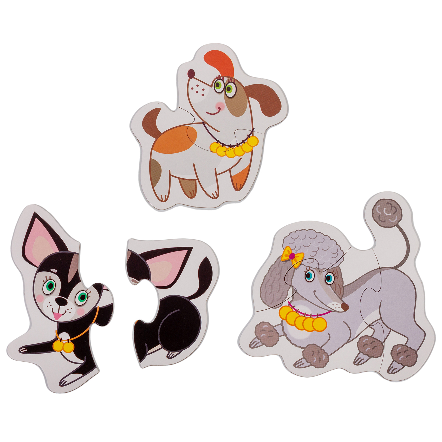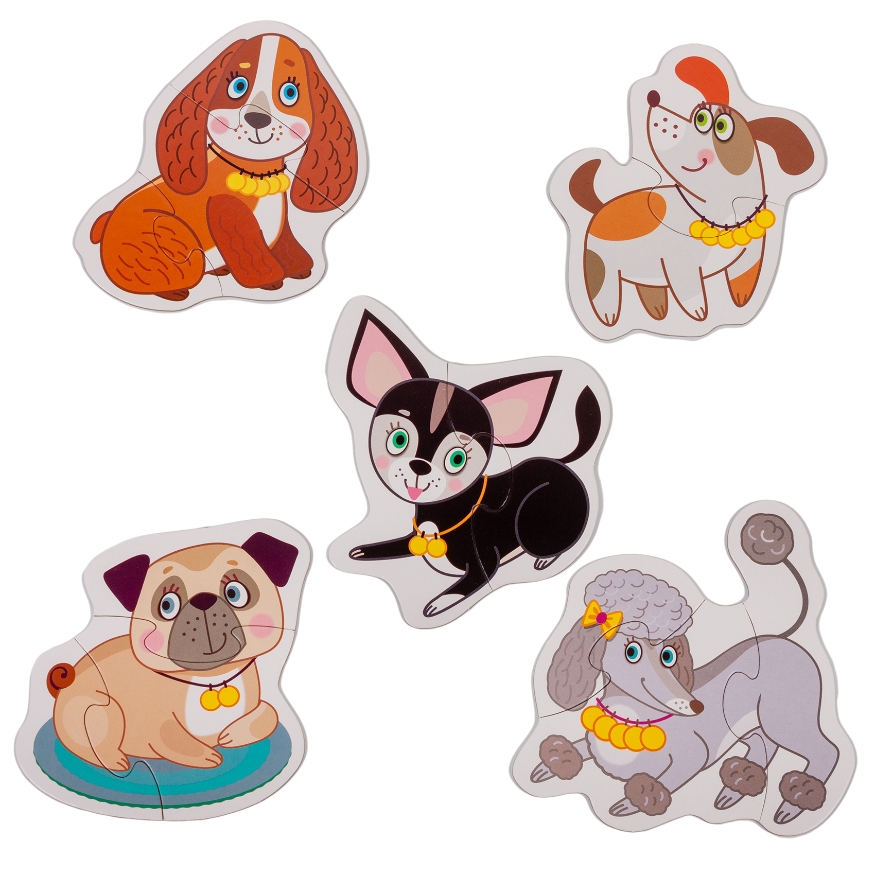 Крупные пазлы подходят для самых маленьких и помогут разнообразить занятия с ребёнком, сделать их интересными и полезными. В наборе 5 фигурок собачек, разделённых на 2-3 элемента. Яркие узнаваемые картинки привлекут внимание малыша, а крупные детали из плотного картона помогут в развитии мелкой моторики.