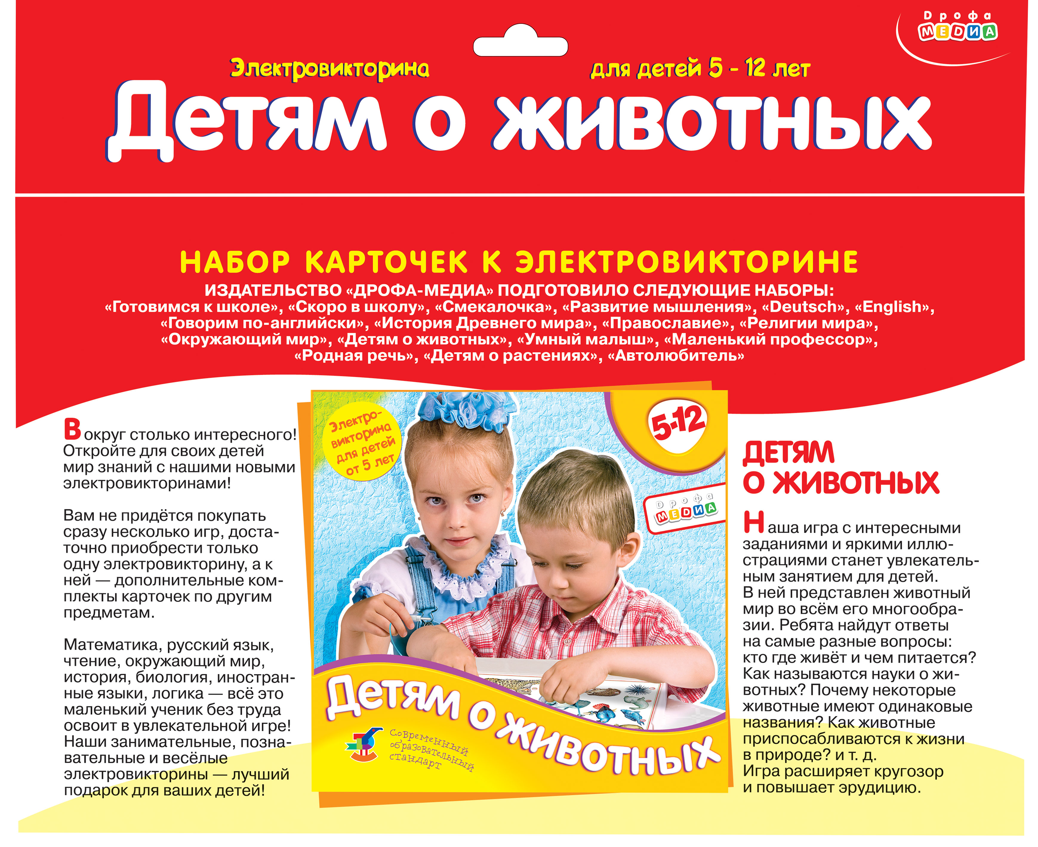 Набор карточек "Детям о животных! приобрели в дополнение. Очень удобно то, что карточки подходят к любой ЭВ в коробке!!! Карточки очень красочные. Ребёнок может играть с ними как самостоятельно, перебирая варианты прикладывая электроды. Так и совместно с родителями (взрослыми). К набору карточек приложена книга "Интересные и познавательные сведения из жизни животных". К каждой теме карточек дано описание и пояснения. Например, какие науки о животных, наименование животного и его описание, чем питается и т.д. Нам нравится играть в ЭВ!!! Да и детки быстро запомнили сведения о животных. По методу Павлова лампочка загорается информация записывается на бессознательном уровне)) |