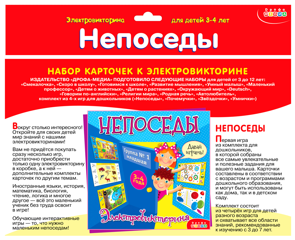 Дополнительный набор карточек к любой электровикторине в коробке. К любой нашей электровикторине подходят наборы карточек от других игр этой серии. Поэтому, если у вас уже есть одна электровикторина, то покупать другие игры этой серии в коробках не нужно, достаточно приобрести дополнительные наборы карточек к уже имеющейся игре.
