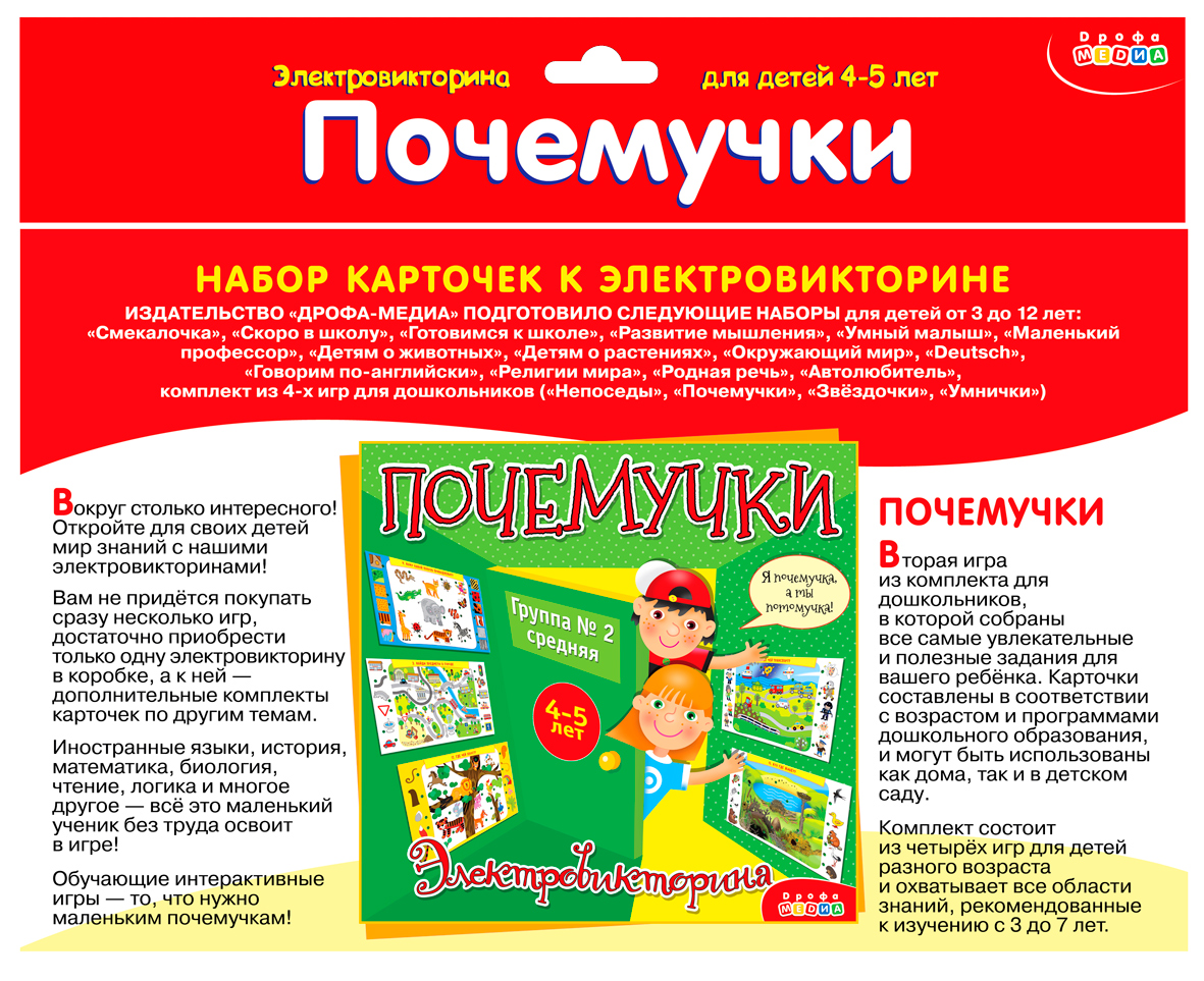 Дополнительный набор карточек к любой электровикторине в коробке. К любой нашей электровикторине подходят наборы карточек от других игр этой серии. Поэтому, если у вас уже есть одна электровикторина, то покупать другие игры этой серии в коробках не нужно, достаточно приобрести дополнительные наборы карточек к уже имеющейся игре.